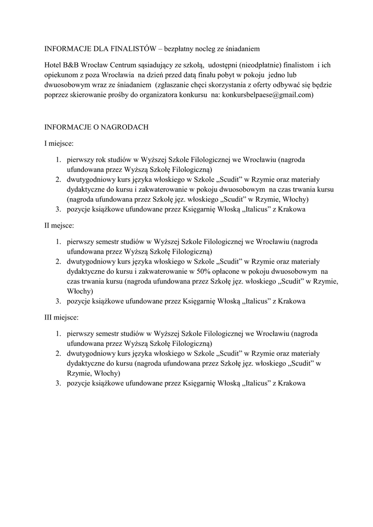 INFORMACJE DLA FINALISTÓW – bezpłatny nocleg ze śniadaniem Hotel B&B Wrocław Centrum sąsiadujący ze szkołą, udostępni (nieodpłatnie) finalistom i ich opiekunom z poza Wrocławia na dzień przed datą finału pobyt w pokoju jedno lub dwuosobowym wraz ze śniadaniem (zgłaszanie chęci skorzystania z oferty odbywać się będzie poprzez skierowanie prośby do organizatora konkursu na: [email protected]) INFORMACJE O NAGRODACH I miejsce: 1. pierwszy rok studiów w Wyższej Szkole Filologicznej we Wrocławiu (nagroda ufundowana przez Wyższą Szkołę Filologiczną) 2. dwutygodniowy kurs języka włoskiego w Szkole „Scudit” w Rzymie oraz materiały dydaktyczne do kursu i zakwaterowanie w pokoju dwuosobowym na czas trwania kursu (nagroda ufundowana przez Szkołę jęz. włoskiego „Scudit” w Rzymie, Włochy) 3. pozycje książkowe ufundowane przez Księgarnię Włoską „Italicus” z Krakowa II mejsce: 1. pierwszy semestr studiów w Wyższej Szkole Filologicznej we Wrocławiu (nagroda ufundowana przez Wyższą Szkołę Filologiczną) 2. dwutygodniowy kurs języka włoskiego w Szkole „Scudit” w Rzymie oraz materiały dydaktyczne do kursu i zakwaterowanie w 50% opłacone w pokoju dwuosobowym na czas trwania kursu (nagroda ufundowana przez Szkołę jęz. włoskiego „Scudit” w Rzymie, Włochy) 3. pozycje książkowe ufundowane przez Księgarnię Włoską „Italicus” z Krakowa III miejsce: 1. pierwszy semestr studiów w Wyższej Szkole Filologicznej we Wrocławiu (nagroda ufundowana przez Wyższą Szkołę Filologiczną) 2. dwutygodniowy kurs języka włoskiego w Szkole „Scudit” w Rzymie oraz materiały dydaktyczne do kursu (nagroda ufundowana przez Szkołę jęz. włoskiego „Scudit” w Rzymie, Włochy) 3. pozycje książkowe ufundowane przez Księgarnię Włoską „Italicus” z Krakowa