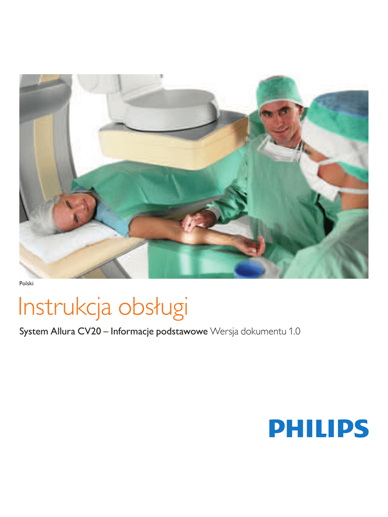 Polski Instrukcja obsługi System Allura CV20 – Informacje podstawowe Wersja dokumentu 1.0 System Allura CV20 – Informacje podstawowe INSTRUKCJA OBS UGI Wersja dokumentu 1.0 Philips Healthcare 9896 002 12191 Polski Wydawca: Philips Healthcare Nederland B.V. Philips Healthcare Nederland B.V. zastrzega sobie prawo do wprowadzania zmian zarówno w niniejszej instrukcji obs ugi, jak i w opisywanym produkcie. Dane techniczne produktu mog! ulec zmianom wprowadzonym bez "adnego uprzedzenia. #adna z cz$%ci niniejszej instrukcji obs ugi nie stanowi oferty, gwarancji, przyrzeczenia ani warunków umowy i nie powinna by& w taki sposób rozumiana. © Koninklijke Philips Electronics N.V. 2008 Wszelkie prawa zastrze one. Reprodukcja w ca!o"ci lub w cz#"ci, w jakiejkolwiek postaci i za pomoc$ jakichkolwiek metod elektrycznych, mechanicznych b$d% innych, bez uzyskania uprzedniej pisemnej zgody w!a"ciciela praw autorskich jest zabroniona. Numer dokumentu: 9896 002 12191 2008 Philips Healthcare 9896 002 12191 Nieautoryzowane powielanie niniejszej publikacji mo"e naruszy& nie tylko prawa autorskie, ale równie" ograniczy& zdolno%& firmy Philips Healthcare Nederland B.V. do zapewnienia u"ytkownikom i operatorom dok adnych i zaktualizowanych informacji. Wydano w Holandii. 3 Sy s te m A l lu r a C V2 0 – I nfo r mac j e po ds t aw ow e Wersja dokumentu 1.0 Spis tre!ci 1 Wprowadzenie .................................................................................... 1-1 1.1 1.2 1.3 1.4 1.5 1.6 1.7 1.8 P h i l i p s Healthcare 9896 002 12191 2 Informacje o systemie Allura CV20 .......................................... 1-1 1.1.1 Podstawy pracy i parametry robocze ............................1-2 1.1.2 Opis wyposa enia ..........................................................1-5 Informacje na temat niniejszej instrukcji obs ugi ...................... 1-8 Zgodno%& .................................................................................. 1-11 Przeznaczenie ........................................................................... 1-12 Kompatybilno%& ....................................................................... 1-13 Przeciwwskazania .................................................................... 1-14 Szkolenie .................................................................................. 1-14 Inne instrukcje obs ugi ............................................................. 1-15 Bezpiecze"stwo ................................................................................. 2-1 Wa"ne wskazówki dotycz!ce bezpiecze'stwa ........................... 2-1 Procedury awaryjne .................................................................... 2-4 Bezpiecze'stwo elektryczne ...................................................... 2-4 Bezpiecze'stwo mechaniczne .................................................... 2-6 Niebezpiecze'stwo eksplozji ..................................................... 2-7 Bezpiecze'stwo po"arowe ......................................................... 2-7 Kompatybilno%& elektromagnetyczna (EMC), telefony przeno%ne i podobny sprz$t oraz pola EMF................................ 2-8 2.8 Bezpiecze'stwo radiologiczne ................................................... 2-9 2.9 Bezpiecze'stwo danych przesy anych w sieci, zabezpieczenia i ochrona prywatno%ci ..................................... 2-11 2.10 Substancje i pierwiastki toksyczne lub niebezpieczne ............. 2-12 2.11 Opis tabliczek znajduj!cych si$ na sprz$cie ............................ 2-13 2.11.1 Bezpiecze!stwo korzystania z lasera...........................2-13 2.11.2 Pozycjoner frontalny ...................................................2-14 2.11.3 Modu"y operacyjne ......................................................2-15 2.1 2.2 2.3 2.4 2.5 2.6 2.7 System Allura CV20 – Informacje podstawowe Wersja dokumentu 1.0 0-1 2.12 Rozmieszczenie tabliczek ........................................................ 2-16 2.12.1 Sterowanie promieniowaniem RTG (szafka g"ówna) ...........................................................2-16 2.12.2 Generator RTG............................................................2-17 2.12.3 Zespó" lampy RTG, ogranicznika wi#zki i receptora obrazu .......................................................2-18 2.12.4 Stó" pacjenta................................................................2-19 Instalacja ............................................................................................. 3-1 3.1 3.2 Komunikaty systemowe oraz komunikaty o b#$dzie ................... 4-1 4.1 4.2 5 Konserwacja ....................................................................................... 5-1 5.0 5.1 5.2 5.3 5.4 5.5 6 Wprowadzenie ........................................................................... 5-1 Program konserwacji profilaktycznej ........................................ 5-1 Rutynowe kontrole przez u"ytkownika ..................................... 5-3 5.2.1 Program rutynowej kontroli przez u ytkownika............5-4 5.2.2 Kontrola ograniczników wi#zki.....................................5-5 Zdalna obs uga serwisowa (opcja) ............................................. 5-7 Aktualizacja oprogramowania antywirusowego ........................ 5-9 Czyszczenie i dezynfekcja ......................................................... 5-9 5.5.1 Czyszczenie..................................................................5-10 5.5.2 Dezynfekcja .................................................................5-10 Utylizacja produktu ........................................................................... 6-1 6.1 6.2 6.3 6.4 0 -2 Obs uga komunikatów i b $dów ................................................ 4-1 4.1.1 Komunikaty o b"$dach...................................................4-1 System restart (Ponowne uruchamianie systemu) ................... 4-43 Wprowadzenie ........................................................................... 6-1 Przekazywani