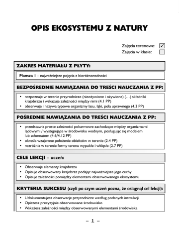 O pis ekosystemu z natury Opis ekosystemu z natury Zajęcia terenowe: Zajęcia w klasie: Zakres materiału z płyty: Plansza 1 – najważniejsze pojęcia z bioróżnorodności Bezpośrednie nawiązania do treści nauczania z PP: • rozpoznaje w terenie przyrodnicze (nieożywione i ożywione) (…) składniki krajobrazu i wskazuje zależności między nimi (4.1 PP) • obserwuje i nazywa typowe organizmy lasu, łąki, pola uprawnego (4.3 PP) Pośrednie nawiązania do treści nauczania z PP: • przedstawia proste zależności pokarmowe zachodzące między organizmami lądowymi / występujące w środowisku wodnym, posługując się modelem lub schematem (4.6/4.12 PP) • określa wzajemne położenie obiektów w terenie (2.4 PP) • rozróżnia w terenie formy terenu wypukłe i wklęsłe (2.7 PP) Cele lekcji – uczeń: • Obserwuje elementy krajobrazu • Opisuje obserwowany krajobraz podając najważniejsze jego cechy • Opisuje zależności pomiędzy elementami obserwowanego ekosystemu Kryteria sukcesu (czyli po czym uczeń pozna, że osiągnął cel lekcji): • Udokumentujesz obserwacje przyrodnicze według podanych instrukcji • Opiszesz precyzyjnie obserwowane środowisko • Wskażesz zależności między obserwowanymi elementami środowiska – 1 – 1. scenariusz zajęć terenowych Niezbędne pomoce: • stoper, • przybory do pisania (podkładki, kartki, długopisy, flamastry w kolorach: czerwony, zielony, niebieski), • karta Elementy środowiska Teren: bez znaczenia, preferowany teren otwarty Przebieg zajęć Wstęp: Nauczyciel dowolną techniką sprawdza, czy uczniowie znają terminy: ekosystem, biotop, biocenoza, środowisko, krajobraz. Część zasadnicza: I. Elementy środowiska • zawody w wyszukiwaniu elementów środowiska Uczniowie na komendę nauczyciela startują z wykonaniem zadania z karty Elementy środowiska polegającego na wypisaniu w jedną minutę jak największej ilości widocznych elementów środowiska, a następnie, w kolejną minutę jak największej ilości elementów niewidocznych. Nauczyciel pilnuje czasu wykonania zadania. Po zakończeniu wpisywania uczniowie dzielą się ze sobą wynikami, ewentualnie dopisują elementy do pustych pól, tak by tabele były pełne. • kolorowanie elementów środowiska Uczniowie obwodzą pętlami wypisane przez nich elementy wedle następującego schematu: • zielony – należące do biotopu lokalnego ekosystemu • niebieski – należące do biocenozy lokalnego ekosystemu • czerwony – widoczne w terenie wytwory człowieka – 2 – O pis ekosystemu z natury Przebieg zajęć Część zasadnicza: I. Elementy środowiska (cd) • powiązania Uczniowie wykonują zadanie polegające na wybraniu dowolnego, spośród wypisanych przez siebie, elementu ekosystemu, a następnie powiązaniu go z kolejnymi elementami. 2. pocztówka z Nowej Zelandii (prawie)* Nauczyciel dzieli dowolną techniką uczniów na 3–5 osobowe zespoły i ustawia je w dużym kręgu. Uczniowie wyobrażają sobie, że mają okazję skontaktować się z nowozelandzkimi uczniami, którzy również poszli na zajęcia terenowe. Zadaniem zespołów jest zapisać 10 pytań, których zadanie nowozelandzkim uczniom pozwoliłoby na jak najpełniejsze poznanie tamtejszego środowiska przyrodniczego. Nauczyciel prosi uczniów, żeby tym razem wyobrazili sobie, że otrzymali zestaw takich 10 pytań z nowozelandzkiej szkoły. Zespoły przekazują sobie wzajemnie, zgodnie z kierunkiem ruchu wskazówek zegara kartki z zapisanymi pytaniami. Uczniowie w zespołach odpowiadają na zadane na kartkach pytania na podstawie obserwacji środowiska. Następnie przekazują odpowiedzi sąsiednim zespołom – ponownie zgodnie ze wskazówkami zegara. Następuje koleżeńska ocena dokładności udzielonych odpowiedzi i precyzji zadanych pytań. Podsumowanie: Uczniowie siadają w rozsypce w odległości przynajmniej pięciu kroków od siebie. Nauczyciel informuje uczniów, że w opisywaniu środowiska nie skupiali się do tej pory wiele na zapachach i dźwiękach. Dlatego uczniowie zamykają oczy i przez pół minuty starają się wsłuchiwać w dźwięki otoczenia. Po tym wyciszeniu nauczyciel prosi, żeby na podstawie zdobytych dziś na lekcji informacji napisali na kartkach jak najpełniejszy opis krajobrazu, nie dłuższy jednak niż 5–8 zdań. Nauczyciel prosi uczniów, aby opis nie zawierał określeń wartościujących krajobraz lub jego elementy – np. ładny, brzydki. *wariant tego zdania można wykonać z wykorzystaniem TIK (np. podczas realizacji programów w ramach projektu Erasmus+) i realnie zaprosić do lustrzanego wykonania tej aktywności przez uczniów szkoły zlokalizowaną w znacznie odmiennym środowisku przyrodniczym. – 3 – 1. scenariusz zajęć terenowych Elementy środowiska Etap 1 • Wpisz w pola poniżej jak najwięcej tych elementów składających się na obserwowane przez ciebie środowisko, które możesz dostrzec. • Pamiętaj o tym, że mogą być one małe lub duże, blisko lub daleko. • Wpisuj konkretne elementy a nie grupy elementów, tak by wpisy nie zawierały się w sobie (np.: gdy w jedno pole wpiszesz rośliny nie możesz już wpisać w kolejne brzozy, maki, itp.) • Komu uda się 50 pól (do linii) zapełnić w minutę? Gotowi do startu?… – 4 – O pis ekosystemu z natury Etap 2 • Tym razem wpisujesz elementy środowiska, których nie możesz dostrzec (bo są za małe lub akurat ich nie widać, ale jesteś w stanie udowodnić, że w nim występują) • Pozostałe zasady takie same, tylko pól jest mniej (20 pól – pod linią)… Gotowi? Etap 3 Otocz kolorowymi pętlami elementy środowiska, zgodnie z instrukcją nauczyciela. Etap 4 Wybierz jeden element środowiska i połącz go z innymi linią symbolizującą powiązanie między tymi elementami. Pamiętaj żeby potrafić opowiedzieć na czym polega to powiązanie (np. pies pije wodę). – 5 –