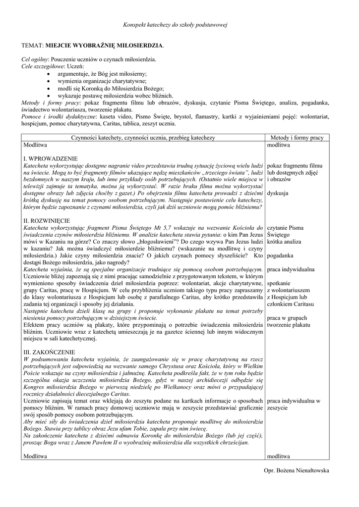 Konspekt katechezy do szkoły podstawowej TEMAT: MIEJCIE WYOBRAŹNIĘ MIŁOSIERDZIA. Cel ogólny: Pouczenie uczniów o czynach miłosierdzia. Cele szczegółowe: Uczeń: • argumentuje, że Bóg jest miłosierny; • wymienia organizacje charytatywne; • modli się Koronką do Miłosierdzia Bożego; • wykazuje postawę miłosierdzia wobec bliźnich. Metody i formy pracy: pokaz fragmentu filmu lub obrazów, dyskusja, czytanie Pisma Świętego, analiza, pogadanka, świadectwo wolontariusza, tworzenie plakatu. Pomoce i środki dydaktyczne: kaseta video, Pismo Święte, brystol, flamastry, kartki z wyjaśnieniami pojęć: wolontariat, hospicjum, pomoc charytatywna, Caritas, tablica, zeszyt ucznia. Czynności katechety, czynności ucznia, przebieg katechezy Modlitwa I. WPROWADZENIE Katecheta wykorzystując dostępne nagranie video przedstawia trudną sytuację życiową wielu ludzi na świecie. Mogą to być fragmenty filmów ukazujące nędzę mieszkańców „trzeciego świata”, ludzi bezdomnych w naszym kraju, lub inne przykłady osób potrzebujących. (Ostatnio wiele miejsca w telewizji zajmuje ta tematyka, można ją wykorzystać. W razie braku filmu można wykorzystać dostępne obrazy lub zdjęcia choćby z gazet.) Po obejrzeniu filmu katecheta prowadzi z dziećmi krótką dyskusję na temat pomocy osobom potrzebującym. Następuje postawienie celu katechezy, którym będzie zapoznanie z czynami miłosierdzia, czyli jak dziś uczniowie mogą pomóc bliźniemu? II. ROZWINIĘCIE Katecheta wykorzystując fragment Pisma Świętego Mt 5,7 wskazuje na wezwanie Kościoła do świadczenia czynów miłosierdzia bliźniemu. W analizie katecheta stawia pytania: o kim Pan Jezus mówi w Kazaniu na górze? Co znaczy słowo „błogosławieni”? Do czego wzywa Pan Jezus ludzi w kazaniu? Jak można świadczyć miłosierdzie bliźniemu? (wskazanie na modlitwę i czyny miłosierdzia.) Jakie czyny miłosierdzia znacie? O jakich czynach pomocy słyszeliście? Kto dostąpi Bożego miłosierdzia, jako nagrody? Katecheta wyjaśnia, że są specjalne organizacje trudniące się pomocą osobom potrzebującym. Uczniowie bliżej zapoznają się z nimi pracując samodzielnie z przygotowanym tekstem, w którym wymieniono sposoby świadczenia dzieł miłosierdzia poprzez: wolontariat, akcje charytatywne, grupy Caritas, pracę w Hospicjum. W celu przybliżenia uczniom takiego typu pracy zapraszamy do klasy wolontariusza z Hospicjum lub osobę z parafialnego Caritas, aby krótko przedstawiła zadania tej organizacji i sposoby jej działania. Następnie katecheta dzieli klasę na grupy i proponuje wykonanie plakatu na temat potrzeby niesienia pomocy potrzebującym w dzisiejszym świecie. Efektem pracy uczniów są plakaty, które przypominają o potrzebie świadczenia miłosierdzia bliźnim. Uczniowie wraz z katechetą umieszczają je na gazetce ściennej lub innym widocznym miejscu w sali katechetycznej. Metody i formy pracy modlitwa pokaz fragmentu filmu lub dostępnych zdjęć i obrazów dyskusja czytanie Pisma Świętego krótka analiza pogadanka praca indywidualna spotkanie z wolontariuszem z Hospicjum lub członkiem Caritasu praca w grupach tworzenie plakatu III. ZAKOŃCZENIE W podsumowaniu katecheta wyjaśnia, że zaangażowanie się w pracę charytatywną na rzecz potrzebujących jest odpowiedzią na wezwanie samego Chrystusa oraz Kościoła, który w Wielkim Poście wskazuje na czyny miłosierdzia i jałmużnę. Katecheta podkreśla fakt, że w tym roku będzie szczególna okazja uczczenia miłosierdzia Bożego, gdyż w naszej archidiecezji odbędzie się Kongres miłosierdzia Bożego w pierwszą niedzielę po Wielkanocy oraz mówi o przypadającej rocznicy działalności diecezjalnego Caritas. Uczniowie zapisują temat oraz wklejają do zeszytu podane na kartkach informacje o sposobach praca indywidualna w pomocy bliźnim. W ramach pracy domowej uczniowie mają w zeszycie przedstawiać graficznie zeszycie swój sposób pomocy osobom potrzebującym. Aby mieć siły do świadczenia dzieł miłosierdzia katecheta proponuje modlitwę do miłosierdzia Bożego. Stawia przy tablicy obraz Jezu ufam Tobie, zapala przy nim świecę. Na zakończenie katecheta z dziećmi odmawia Koronkę do miłosierdzia Bożego (lub jej część), prosząc Boga wraz z Janem Pawłem II o wyobraźnię miłosierdzia dla wszystkich chrześcijan. Modlitwa modlitwa Opr. Bożena Nienałtowska