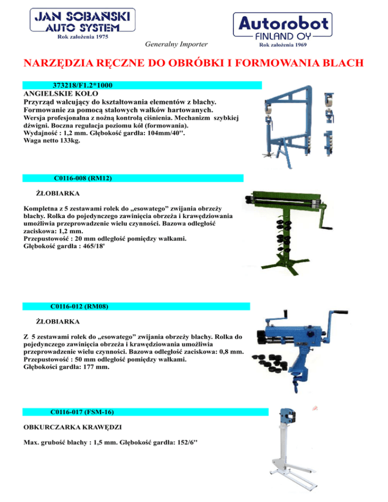 Generalny Importer NARZĘDZIA RĘCZNE DO OBRÓBKI I FORMOWANIA BLACH 373218/F1.2*1000 ANGIELSKIE KOŁO Przyrząd walcujący do kształtowania elementów z blachy. Formowanie za pomocą stalowych wałków hartowanych. Wersja profesjonalna z nożną kontrolą ciśnienia. Mechanizm szybkiej dźwigni. Boczna regulacja poziomu kół (formowania). Wydajność : 1,2 mm. Głębokość gardła: 104mm/40''. Waga netto 133kg. C0116-008 (RM12) ŻŁOBIARKA Kompletna z 5 zestawami rolek do „esowatego” zwijania obrzeży blachy. Rolka do pojedynczego zawinięcia obrzeża i krawędziowania umożliwia przeprowadzenie wielu czynności. Bazowa odległość zaciskowa: 1,2 mm. Przepustowość : 20 mm odległość pomiędzy wałkami. Głębokość gardła : 465/18' C0116-012 (RM08) ŻŁOBIARKA Z 5 zestawami rolek do „esowatego” zwijania obrzeży blachy. Rolka do pojedynczego zawinięcia obrzeża i krawędziowania umożliwia przeprowadzenie wielu czynności. Bazowa odległość zaciskowa: 0,8 mm. Przepustowość : 50 mm odległość pomiędzy wałkami. Głębokości gardła: 177 mm. C0116-017 (FSM-16) OBKURCZARKA KRAWĘDZI Max. grubość blachy : 1,5 mm. Głębokość gardła: 152/6'' C0116-016 (SS-16F) OBKURCZRKA KRAWĘDZI Max. grubość blachy : 1,5 mm. Głębokość gardła: 208/8'', zawiera stojak, szczękę do obkurczania i szczękę do rozciągania. C0116-014 (SS-18) OBKURCZRKA KRAWĘDZI Jedno urządzenie do obkurczania i obciągania blachy. Tworzy płytki ze skośnym ścięciem w profesjonalnej formie S. Głębokość gardła: 1,2 mm. Waga 5,5 kg. C0116-026 (SS-16) OBKURCZARKA KRAWĘDZIOWA. Max. grubość blachy: 1,5 mm. Głębokość gardła: 208 mm. 373123 (#W1.5X1220Z) GIĘTARKA Długość robocza: 1220 mm. Kąt wygięcia blachy: od 0 do 135°. JAN SOBAŃSKI AUTO SYSTEM P.U.H. 05-230 Kobyłka ul. Konopnickiej 13; Tel. (22)786 23 22...24, 786 88 03 Fax (22) 786 88 03 NIP 125-000-60-62; REGON: 010317172; www.autorobot.com.pl E-mail: [email protected] Konto: Bank Zachodni WBK S.A. 45 1090 1870 0000 0001 2317 7373