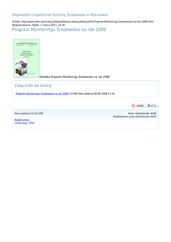 Wojewódzki Inspektorat Ochrony Środowiska w Warszawie Źródło: http://www.wios.warszawa.pl/pl/publikacje-wios/publikacje/35,Program-Monitoringu-Srodowiska-na-rok-2006.html Wygenerowano: Piątek, 3 marca 2017, 23:35 Program Monitoringu Środowiska na rok 2006 Okładka Program Monitoringu Środowiska na rok 2006 Załączniki do strony Program Monitoringu Środowiska na rok 2006 3.8 MB Data dodania 06.08.2008 13:16 Data publikacji 01.02.2006 Rejestr zmian Liczba wizyt: 2555 Autor: Administrator WIOŚ Opublikowane przez Administrator WIOŚ