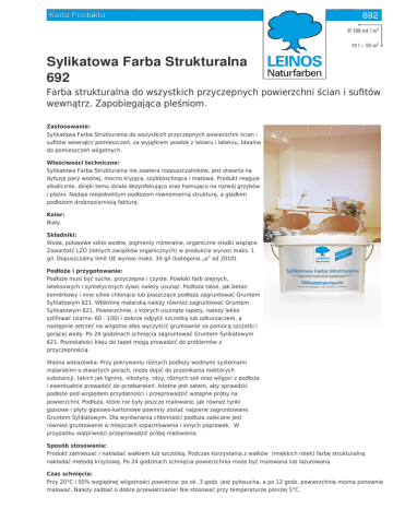 692 Sylikatowa Farba Strukturalna 692 Farba strukturalna do wszystkich przyczepnych powierzchni ścian i sufitów wewnątrz. Zapobiegająca pleśniom. Zastosowanie: Sylikatowa Farba Strukturalna do wszystkich przyczepnych powierzchni ścian i sufitów wewnątrz pomieszczeń, za wyjątkiem powłok z lakieru i lateksu. Idealna do pomieszczeń wilgotnych. Właściwości techniczne: Sylikatowa Farba Strukturalna nie zawiera rozpuszczalników, jest otwarta na dyfuzję pary wodnej, mocno kryjąca, szybkoschnąca i matowa. Produkt reaguje alkalicznie, dzięki temu działa dezynfekująco oraz hamująco na rozwój grzybów i pleśni. Nadaje niejednolitym podłożom równomierną strukturę, a gładkim podłożom drobnoziarnistą fakturę. Kolor: Biały. Składniki: Woda, potasowe szkło wodne, pigmenty mineralne, organiczne środki wiążące. Zawartość LZO (lotnych związków organicznych) w produkcie wynosi maks. 1 g/l. Dopuszczalny limit UE wynosi maks. 30 g/l (kategoria „a” od 2010). Podłoże i przygotowanie: Podłoże musi być suche, przyczepne i czyste. Powłoki farb olejnych, lateksowych i syntetycznych żywic należy usunąć. Podłoża takie, jak beton komórkowy i inne silnie chłonące lub piaszczące podłoża zagruntować Gruntem Sylitatowym 621. Włókninę malarską należy również zagruntować Gruntem Sylikatowym 621. Powierzchnie, z których usunięto tapety, należy lekko szlifować (ziarno: 60 - 100) i dobrze odpylić szczotką lub odkurzaczem, a następnie zetrzeć na wilgotno albo wyczyścić gruntownie za pomocą szczotki i gorącej wody. Po 24 godzinach schnięcia zagruntować Gruntem Sylikatowym 621. Pozostałości kleju do tapet mogą prowadzić do problemów z przyczepnością. Ważna wskazówka: Przy pokrywaniu różnych podłoży wodnymi systemami malarskimi o otwartych porach, może dojść do przenikania niektórych substancji, takich jak ligniny, nikotyny, rdzy, różnych soli oraz wilgoci z podłoża i ewentualnie prowadzić do przebarwień. Istotne jest zatem, aby sprawdzić podłoże pod względem przydatności i przeprowadzić wstępne próby na powierzchni. Podłoża, które nie były jeszcze malowane, jak równeż tynki gipsowe i płyty gipsowo-kartonowe powinny zostać najpierw zagruntowane Gruntem Sylikatowym. Dla wyrównania chłonności podłoża zalecane jest również gruntowanie w miejscach szpachlowania i innych poprawek. W przypadku wątpliwości przeprowadzić próbę malowania. Sposó b stosowania: Produkt zamieszać i nakładać wałkiem lub szczotką. Podczas korzystania z wałków (miękkich rolek) farbę strukturalną nakładać metodą krzyżową. Po 24 godzinach schnięcia powierzchnia może być malowana lub lazurowana. Czas schnięcia: Przy 20°C i 50% względnej wilgotności powietrza: po ok. 3 godz. jest pyłosucha, a po 12 godz. powierzchnię można ponownie malować. Należy zadbać o dobre przewietrzanie! Nie stosować przy temperaturze poniżej 5°C. Wielkość opakowań i zużycie: 1 l wystarcza w zależności od chłonności podłoża na 5 - 6 m2 na jedną warstwę. Opakowanie wystarcza na...* 55 m2 10l * średnia wydajność na jedną warstwę Przechowywanie i trwałość: Oryginalnie zamknięta jest przydatna do użycia przynajmniej przez 12 miesięcy. Przechowywać zamkniętym opakowaniu, w chłodnym i suchym miejscu. Chronić przed mrozem. Opakowania napoczęte i rozcieńczona farba nie nadają się do przechowywania. Przechowywanie w zbyt wysokiej temperaturze może spowodować zagęszczenie produktu. Utylizacja: Zgodnie z lokalnymi, urzędowymi przepisami. Wysuszone resztki produktu mogą być usuwane do śmieci komunalnych. Europejski kod odpadu EWC: 08 01 03. Środki rozcieńczające i czyszczące: Produkt jest gotwy do użycia. Ewentualne rozcieńczanie Gruntem Syliktowym 621 lub wodą. Czyszczenie wodą i Mydłem Roślinnym 930 LEINOS. GISCODE: M-SK 01 Zwroty wskazujące środki ostrożności: Karta charakterystyki dostępna na żądanie. Uwaga! Produkt ma odczyn alkaliczny! Chronić oczy i skórę przed zachlapaniem! Bryzgi farby na szkło, kamień naturalny, aluminium, drewno i lakier umyć od razu dużą ilością wody. Chronić przed dziećmi. Unikać uwolnienia do środowiska. Zawartość/pojemnik usuwać zgodnie z lokalnymi przepisami. Aby osiągnąć optymalne wyniki należy przestrzegać zaleceń Kart Produktów wszystkich stosowanych produktów. Informacje opierają się na aktualnym stanie naszej wiedzy i doświadczeń. Nie stanowią jednak zapewnienia o właściwościach produktu i nie mają skutku prawnego umowy. Wraz z ukazaniem się tej Karty Produktu wszystkie poprzednie informacje tracą swoją ważność. Stan: 03.03.2017 Dystrybutor: AMBIENTE • Tomasz Szczepański • ul. Reymonta 12 • 48-370 Paczków tel./faks: +48(0)77/43175 23 • [email protected] • www.LEINOS.pl Producent: LEINOS • Reincke Naturfarben GmbH • Rudolf-Diesel-Straße 4 • 21614 Buxtehude, Germany Tel. +49 (0) 41 61 - 99 45 40 • www.LEINOS.de • [email protected]