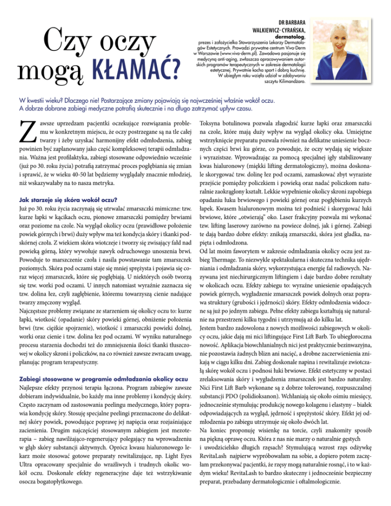 Czy oczy mogą Kłamać? dr Barbara Walkiewicz- Cyrańska, dermatolog, prezes i założycielka Stowarzyszenia Lekarzy Dermatologów Estetycznych. Prowadzi prywatne centrum Viva-Derm w Warszawie (www.viva-derm.pl). Zawodowo pasjonuje się medycyną anti-aging, zwłaszcza opracowywaniem autorskich programów terapeutycznych w zakresie dermatologii estetycznej. Prywatnie kocha sport i dobrą kuchnię. W ubiegłym roku wzięła udział w zdobywaniu szczytu Kilimandżaro. W kwestii wieku? Dlaczego nie! Postarzające zmiany pojawiają się najwcześniej właśnie wokół oczu. A dobrze dobrane zabiegi medyczne potrafią skutecznie i na długo zatrzymać upływ czasu. Z awsze uprzedzam pacjentki oczekujące rozwiązania problemu w konkretnym miejscu, że oczy postrzegane są na tle całej twarzy i żeby uzyskać harmonijny efekt odmłodzenia, zabieg powinien być zaplanowany jako część kompleksowej terapii odmładzania. Ważna jest profilaktyka, zabiegi stosowane odpowiednio wcześnie (już po 30. roku życia) potrafią zatrzymać proces pogłębiania się zmian i sprawić, że w wieku 40-50 lat będziemy wyglądały znacznie młodziej, niż wskazywałaby na to nasza metryka. Jak starzeje się skóra wokół oczu? Już po 30. roku życia zaczynają się utrwalać zmarszczki mimiczne: tzw. kurze łapki w kącikach oczu, pionowe zmarszczki pomiędzy brwiami oraz poziome na czole. Na wygląd okolicy oczu (prawidłowe położenie powiek górnych i brwi) duży wpływ ma też kondycja skóry i tkanki podskórnej czoła. Z wiekiem skóra wiotczeje i tworzy się zwisający fałd nad powieką górną, który wywołuje nawyk odruchowego unoszenia brwi. Powoduje to marszczenie czoła i nasila powstawanie tam zmarszczek poziomych. Skóra pod oczami staje się mniej sprężysta i pojawia się coraz więcej zmarszczek, które się pogłębiają. U niektórych osób tworzą się tzw. worki pod oczami. U innych natomiast wyraźnie zaznacza się tzw. dolina łez, czyli zagłębienie, któremu towarzyszą cienie nadające twarzy zmęczony wygląd. Najczęstsze problemy związane ze starzeniem się okolicy oczu to: kurze łapki, wiotkość (opadanie) skóry powieki górnej, obniżenie położenia brwi (tzw. ciężkie spojrzenie), wiotkość i zmarszczki powieki dolnej, worki oraz cienie i tzw. dolina łez pod oczami. W wyniku naturalnego procesu starzenia dochodzi też do zmniejszenia ilości tkanki tłuszczowej w okolicy skroni i policzków, na co również zawsze zwracam uwagę, planując program terapeutyczny. Zabiegi stosowane w programie odmładzania okolicy oczu Najlepsze efekty przynosi terapia łączona. Program zabiegów zawsze dobieram indywidualnie, bo każdy ma inne problemy i kondycję skóry. Często zaczynam od zastosowania peelingu medycznego, który poprawia kondycję skóry. Stosuję specjalne peelingi przeznaczone do delikatnej skóry powiek, powodujące poprawę jej napięcia oraz rozjaśniające zacienienia. Drugim najczęściej stosowanym zabiegiem jest mezoterapia – zabieg nawilżająco-regenerujący polegający na wprowadzeniu w głąb skóry substancji aktywnych. Oprócz kwasu hialuronowego lekarz może stosować gotowe preparaty rewitalizujące, np. Light Eyes Ultra opracowany specjalnie do wrażliwych i trudnych okolic wokół oczu. Doskonałe efekty regeneracyjne daje też wstrzykiwanie osocza bogatopłytkowego. Toksyna botulinowa pozwala złagodzić kurze łapki oraz zmarszczki na czole, które mają duży wpływ na wygląd okolicy oka. Umiejętne wstrzyknięcie preparatu pozwala również na delikatne uniesienie bocznych części brwi ku górze, co powoduje, że oczy wydają się większe i wyrazistsze. Wprowadzając za pomocą specjalnej igły stabilizowany kwas hialuronowy (miękki lifting dermatologiczny), można doskonale skorygować tzw. dolinę łez pod oczami, zamaskować zbyt wyraziste przejście pomiędzy policzkiem i powieką oraz nadać policzkom naturalnie zaokrąglony kształt. Lekkie wypełnienie okolicy skroni zapobiega opadaniu łuku brwiowego i powieki górnej oraz pogłębieniu kurzych łapek. Kwasem hialuronowym można też podnieść i skorygować łuki brwiowe, które „otwierają” oko. Laser frakcyjny pozwala mi wykonać tzw. lifting laserowy zarówno na powiece dolnej, jak i górnej. Zabiegi te dają bardzo dobre efekty: znikają zmarszczki, skóra jest gładka, napięta i odmłodzona. Od lat moim faworytem w zakresie odmładzania okolicy oczu jest zabieg Thermage. To niezwykle spektakularna i skuteczna technika ujędrniania i odmładzania skóry, wykorzystująca energię fal radiowych. Nazywana jest niechirurgicznym liftingiem i daje bardzo dobre rezultaty w okolicach oczu. Efekty zabiegu to: wyraźne uniesienie opadających powiek górnych, wygładzenie zmarszczek powiek dolnych oraz poprawa struktury (grubości i jędrności) skóry. Efekty odmłodzenia widoczne są już po jednym zabiegu. Pełne efekty zabiegu kształtują się naturalnie na przestrzeni kilku tygodni i utrzymują aż do kilku lat. Jestem bardzo zadowolona z nowych możliwości zabiegowych w okolicy oczu, jakie dają mi nici liftingujące First Lift Barb. To ubiegłoroczna nowość. Aplikacja biowchłanialnych nici jest praktycznie bezinwazyjna, nie pozostawia żadnych blizn ani nacięć, a drobne zaczerwienienia znikają w ciągu kilku dni. Zabieg doskonale napina i rewitalizuje zwiotczałą skórę wokół oczu i podnosi łuki brwiowe. Efekt estetyczny w postaci zrelaksowania skóry i wygładzenia zmarszczek jest bardzo naturalny. Nici First Lift Barb wykonane są z dobrze tolerowanej, rozpuszczalnej substancji PDO (polidioksanon). Wchłaniają się około ośmiu miesięcy, jednocześnie stymulując produkcję nowego kolagenu i elastyny – białek odpowiadających za wygląd, jędrność i sprężystość skóry. Efekt jej odmłodzenia po zabiegu utrzymuje się około dwóch lat. Na koniec proponuję wisienkę na torcie, czyli znakomity sposób na piękną oprawę oczu. Która z n