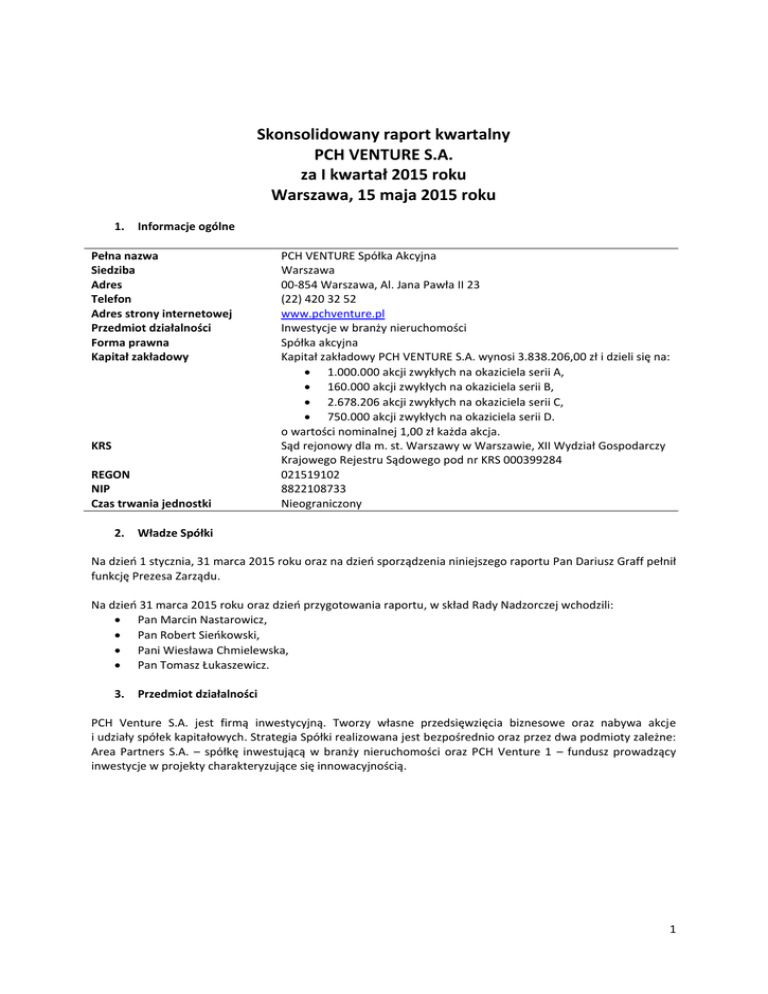 Skonsolidowany raport kwartalny PCH VENTURE S.A. za I kwartał 2015 roku Warszawa, 15 maja 2015 roku 1. Informacje ogólne Pełna nazwa Siedziba Adres Telefon Adres strony internetowej Przedmiot działalności Forma prawna Kapitał zakładowy KRS REGON NIP Czas trwania jednostki 2. PCH VENTURE Spółka Akcyjna Warszawa 00-854 Warszawa, Al. Jana Pawła II 23 (22) 420 32 52 www.pchventure.pl Inwestycje w branży nieruchomości Spółka akcyjna Kapitał zakładowy PCH VENTURE S.A. wynosi 3.838.206,00 zł i dzieli się na: 1.000.000 akcji zwykłych na okaziciela serii A, 160.000 akcji zwykłych na okaziciela serii B, 2.678.206 akcji zwykłych na okaziciela serii C, 750.000 akcji zwykłych na okaziciela serii D. o wartości nominalnej 1,00 zł każda akcja. Sąd rejonowy dla m. st. Warszawy w Warszawie, XII Wydział Gospodarczy Krajowego Rejestru Sądowego pod nr KRS 000399284 021519102 8822108733 Nieograniczony Władze Spółki Na dzieo 1 stycznia, 31 marca 2015 roku oraz na dzieo sporządzenia niniejszego raportu Pan Dariusz Graff pełnił funkcję Prezesa Zarządu. Na dzieo 31 marca 2015 roku oraz dzieo przygotowania raportu, w skład Rady Nadzorczej wchodzili: Pan Marcin Nastarowicz, Pan Robert Sieokowski, Pani Wiesława Chmielewska, Pan Tomasz Łukaszewicz. 3. Przedmiot działalności PCH Venture S.A. jest firmą inwestycyjną. Tworzy własne przedsięwzięcia biznesowe oraz nabywa akcje i udziały spółek kapitałowych. Strategia Spółki realizowana jest bezpośrednio oraz przez dwa podmioty zależne: Area Partners S.A. – spółkę inwestującą w branży nieruchomości oraz PCH Venture 1 – fundusz prowadzący inwestycje w projekty charakteryzujące się innowacyjnością. 1 4. Kwartalne skrócone sprawozdanie finansowe RACHUNEK ZYSKÓW I STRAT (PLN) wariant porównawczy A I II III IV B I II III IV V VI VII Przychody netto ze sprzedaży, w tym: Przychody netto ze sprzedaży produktów Inne przychody ze sprzedaży Koszt wytworzenia produktów na własne potrzeby jednostki Przychody netto ze sprzedaży towarów i materiałów Koszty działalności operacyjnej Amortyzacja Zużycie materiałów i energii Usługi obce Podatki i opłaty Wynagrodzenia Ubezpieczenia społeczne Pozostałe koszty rodzajowe 01.01.2015 31.03.2015 6 775,90 6 775,90 01.01.2014 31.03.2014 9 150,00 9 150,00 01.01.2015 31.03.2015 6 775,90 6 775,90 01.01.2014 31.03.2014 9 150,00 9 150,00 - - - - - - - - 12 639,41 1 701,30 6 128,21 4 074,12 735,78 - 11 288,13 2 551,95 25,00 7 111,18 1 600,00 - 12 639,41 1 701,30 6 128,21 4 074,12 735,78 - 11 288,13 2 551,95 25,00 7 111,18 1 600,00 - - - - - -5 863,51 - -2 138,13 1 113,82 -5 863,51 - -2 138,13 1 113,82 VIII Wartość sprzedanych instrumentów finansowych C D Zysk ( strata) ze sprzedaży Pozostałe przychody operacyjne I Zysk ze zbycia niefinansowych aktywów trwałych - - - - II III E Dotacje Inne przychody operacyjne Pozostałe koszty operacyjne - 1 113,82 - - 1 113,82 - - - - - - - - - -5 863,51 - -1 024,31 - -5 863,51 - -1 024,31 - -5 863,51 - 17,03 17,03 -1 041,34 - -5 863,51 - 17,03 17,03 -1 041,34 - -5 863,51 - -1 041,34 - -5 863,51 - -1 041,34 - I II III F G I II III IV V H I II III IV I J I II K L M N Strata ze zbycia niefinansowych aktywów trwałych Aktualizacja wartości aktywów niefinansowych Inne koszty operacyjne Zysk ( strata) z działalności operacyjnej Przychody finansowe Dywidendy i udziały w zyskach Odsetki Zysk ze zbycia inwestycji Aktualizacja wartości inwestycji Inne przychody finansowe Koszty finansowe Odsetki Strata ze zbycia inwestycji Aktualizacja wartości inwestycji Inne koszty finansowe Zysk ( strata) z działalności gospodarczej Wynik zdarzeń nadzwyczajnych Zyski nadzwyczajne Straty nadzwyczajne Zysk ( strata brutto ) Podatek dochodowy Pozostałe obowiązkowe zmniejszenia zysku (zwiększenia straty) Zysk (strata ) netto - - - - -5 863,51 -1 041,34 -5 863,51 -1 041,34 2 BILANS (PLN) AKTYWA Aktywa trwałe Wartości niematerialne i prawne Rzeczowe aktywa trwałe Należności długoterminowe Inwestycje długoterminowe Długoterminowe rozliczenia międzyokresowe Aktywa obrotowe A I II III IV V B 31.03.2015 4 128 296,27 - 35 424,00 151 759,67 31.03.2014 2 093 188,44 332 784,54 663 501,90 1 091 844,00 5 058,00 614 567,98 654 144,75 3 438 727,52 I Zapasy rzeczowych aktywów obrotowych - 510 521,52 II Należności krótkoterminowe 89 172,90 70 742,42 III Inwestycje krótkoterminowe 59 250,63 32 652,89 IV Krótkoterminowe rozliczenia międzyokresowe 3 336,14 651,15 4 280 055,94 2 707 756,42 31.03.2015 3 580 767,33 6 174 568,00 -500 000,00 860 705,30 -2 948 642,46 -5 863,51 31.03.2014 2 269 560,48 3 838 206,00 414 245,36 -1 981 849,54 -1 041,34 - - 699 288,61 12 300,00 686 988,61 438 195,94 9 225,00 419 745,94 4 280 055,94 2 707 756,42 Suma bilansowa A I II III IV V VI VII VIII PASYWA Kapitał własny Kapitał podstawowy Należne wpłaty na kapitał podstawowy Udziały ( akcje ) własne Kapitał zapasowy Kapitał (fundusz) z aktualizacji wyceny Pozostałe kapitały (fundusze) rezerwowe Zysk (strata) z lat ubiegłych Zysk (strata) netto IX Odpisy z zysku netto w ciągu roku obrotowego (wielkość ujemna) B I II III Zobowiązania i rezerwy na zobowiązania Rezerwy na zobowiązania Zobowiązania długoterminowe Zobowiązania krótkoterminowe i fundusze specjalne IV Rozliczenia międzyokresowe 9 225,00 Suma bilansowa RACHUNEK PRZEPŁYWÓW PIENIĘŻNYCH (PLN) 01.01.2015 31.03.2015 A. I. II. III. B. I. II. III. C. I. II. III. Przepływy środków pieniężnych z działalności operacyjnej Zysk ( strata) netto Korekty razem Przepływy pieniężne netto z działalności operacyjnej (I - II) Przepływy środków pieniężnych z działalności inwestycyjnej Wpływy Wydatki Przepływy pieniężne netto z działalności inwestycyjnej (I-II) Przepływy środków pieniężnych z działalności finansowej Wpływy Wydatki Przepływy pieniężne netto z działalności finansowej (I-II) 01.01.2014 31.03.2014 01.01.2015 31.03.2015 01.01.2014 31.03.2014 -5 863,5