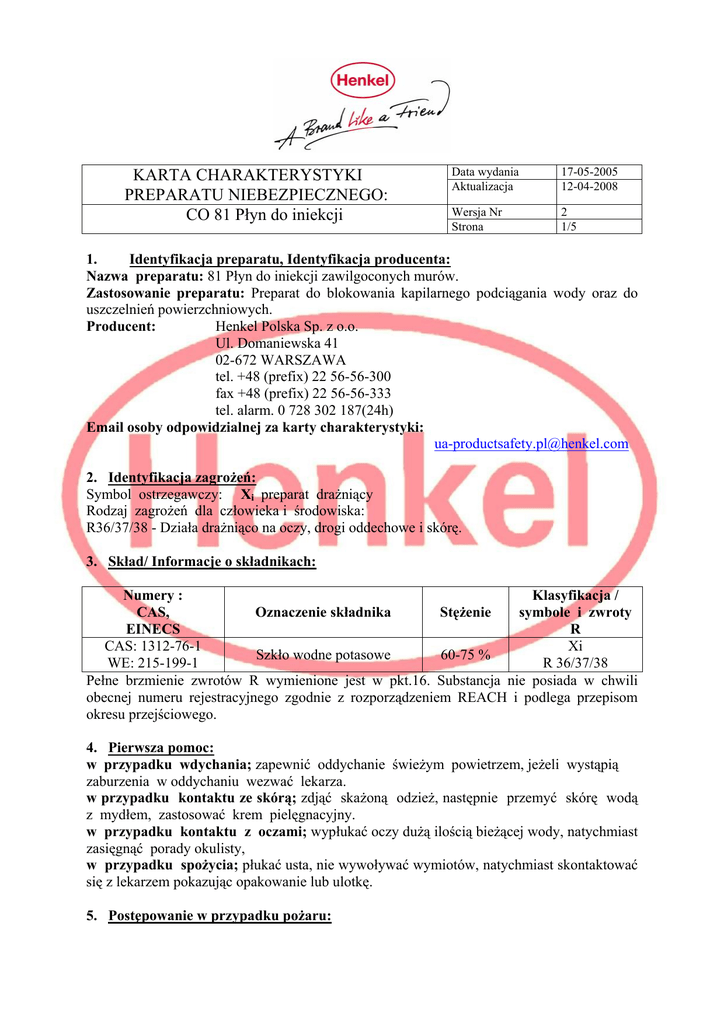 KARTA CHARAKTERYSTYKI PREPARATU NIEBEZPIECZNEGO: CO 81 Płyn do iniekcji Data wydania Aktualizacja 17-05-2005 12-04-2008 Wersja Nr Strona 2 1/5 1. Identyfikacja preparatu, Identyfikacja producenta: Nazwa preparatu: 81 Płyn do iniekcji zawilgoconych murów. Zastosowanie preparatu: Preparat do blokowania kapilarnego podciągania wody oraz do uszczelnień powierzchniowych. Producent: Henkel Polska Sp. z o.o. Ul. Domaniewska 41 02-672 WARSZAWA tel. +48 (prefix) 22 56-56-300 fax +48 (prefix) 22 56-56-333 tel. alarm. 0 728 302 187(24h) Email osoby odpowidzialnej za karty charakterystyki: [email protected] 2. Identyfikacja zagrożeń: Symbol ostrzegawczy: Xi preparat drażniący Rodzaj zagrożeń dla człowieka i środowiska: R36/37/38 - Działa drażniąco na oczy, drogi oddechowe i skórę. 3. Skład/ Informacje o składnikach: Numery : Klasyfikacja / CAS, Oznaczenie składnika Stężenie symbole i zwroty EINECS R CAS: 1312-76-1 Xi Szkło wodne potasowe 60-75 % WE: 215-199-1 R 36/37/38 Pełne brzmienie zwrotów R wymienione jest w pkt.16. Substancja nie posiada w chwili obecnej numeru rejestracyjnego zgodnie z rozporządzeniem REACH i podlega przepisom okresu przejściowego. 4. Pierwsza pomoc: w przypadku wdychania; zapewnić oddychanie świeżym powietrzem, jeżeli wystąpią zaburzenia w oddychaniu wezwać lekarza. w przypadku kontaktu ze skórą; zdjąć skażoną odzież, następnie przemyć skórę wodą z mydłem, zastosować krem pielęgnacyjny. w przypadku kontaktu z oczami; wypłukać oczy dużą ilością bieżącej wody, natychmiast zasięgnąć porady okulisty, w przypadku spożycia; płukać usta, nie wywoływać wymiotów, natychmiast skontaktować się z lekarzem pokazując opakowanie lub ulotkę. 5. Postępowanie w przypadku pożaru: KARTA CHARAKTERYSTYKI PREPARATU NIEBEZPIECZNEGO: CO 81 Płyn do iniekcji Data wydania Aktualizacja 17-05-2005 12-04-2008 Wersja Nr Strona 2 2/5 środki gaśnicze; stosować tradycyjne środki gaśnicze ( rozpylony strumień wody, proszek gaśniczy, piana, dwutlenek węgla ) w zależności od obszaru objętego pożarem i materiałów tam występujących. środki gaśnicze, których nie wolno używać z przyczyn bezpieczeństwa; brak szczególne zagrożenia pojawiające się w przypadku pożaru; Produkt niepalny. W temperaturach powyżej 60°C niebezpiecznie reaguje z: aluminium i jego stopami, cynkiem i jego stopami - może powstawać wodór (niebezpieczeństwo wybuchu). środki ochrony indywidualnej dla strażaków; tradycyjne środki ochrony indywidualnej 6. Postępowanie w przypadku uwolnienia do środowiska: indywidualne środki ostrożności; Unikać kontaktu ze skórą oraz oczami. Podczas likwidacji, korzystać ze środków ochrony indywidualnej ochrona środowiska; Uniemożliwić przedostanie się preparatu do wód powierzchniowych i gruntowych, oraz instalacji odwadniających. metody oczyszczania; Usunąć mechanicznie. Małe ilości zmyć wodą, a powstające ścieki skierować do oczyszczania według aktualnych przepisów. Postępować zgodnie z pkt. 13 7. Obchodzenie się z substancją i magazynowanie: wskazówki bezpiecznego obchodzenia się z preparatem; Unikać kontaktu z oczami oraz skórą. Używać środków ochrony indywidualnej zgodnie z punktem 8. Po użyciu zamknąć opakowanie. wymagania dotyczące pomieszczeń magazynowych i opakowań; Do 12 miesięcy od daty produkcji przy składowaniu w chłodnych warunkach i w oryginalnych, nie uszkodzonych opakowaniach. Chronić przed mrozem!. Nie przechowywać razem z jedzeniem ani żadnymi produktami konsumpcyjnymi ( kawa, herbata, tytoń, itd.). 8. Kontrola narażenia/środki ochrony indywidualnej: kontrola narażenia NDS, NDSCh, NDSP; brak Podstawa prawna; Rozporządzenie Ministra Pracy i Polityki Socjalnej z dnia 29 listopada 2002 r. w sprawie najwyższych stężeń i natężeń czynników szkodliwych dla zdrowia ( Dz. U Nr 217, poz. 1833 ) z późniejszymi zmianami osobiste środki ochrony: Nie jeść, nie pić podczas pracy. Umyć ręce przed przerwą w pracy oraz po jej zakończeniu. ochrona dróg oddechowych: zapewnić odpowiednią wentylację podczas pracy. ochrona skóry: ubranie ochronne. ochrona dłoni: używać rękawic ochronnych wykonanych z kauczuku naturalnego, butylowego lub polichloroprenu (grubość warstwy wg PN-EN 374 >= 1mm, czas wytrzymałości materiału dla czasu przenikania odpowiednio indeks ochronny 2 > 30min. , indeks ochronny 6 > 480min.) ochrona oczu: okulary ochronne-gogle KARTA CHARAKTERYSTYKI PREPARATU NIEBEZPIECZNEGO: CO 81 Płyn do iniekcji 9. Właściwości fizykochemiczne: Stan skupienia Kolor Zapach PH Temperatura wrzenia Temperatura zapłonu Temperatura samozapłonu Gęstość Rozpuszczalność - Data wydania Aktualizacja 17-05-2005 12-04-2008 Wersja Nr Strona 2 3/5 ciecz, bezbarwny, bezzapachowy 10 - 12, > 1100 C nie podano nie podano około 1,2 kg/dm3 , rozpuszczalny w wodzie ( 20 0 C ), 10. Stabilność i reaktywność: warunki jakich należy unikać - substancja stabilna w normalnych warunkach materiały, z którymi należy unikać kontaktu - stężone kwasy, stężone ługi metali alkalicznych, metale alkaliczne, aluminium i jego stopy, cynki jego stopy. niebezpieczne produkty rozkładu - brak. 11. Informacje toksykologiczne: Działanie drażniące: wdychanie – bez specjalnych zagrożeń, doustnie - podrażnienia ust, przewodu pokarmowego, przełyku, ryzyko perforacji przełyku lub żołądka. skóra – działa drażniąco, przy intensywnym kontakcie może dojść do oparzenia. oczy – drażniący dla oczu, w bezpośrednim i przedłużającym się kontakcie istnieje ryzyko utraty wzroku. 12. Informacje ekologiczne: Produkt może być szkodliwy dla środowiska w dużych stężeniach. Nie dopuszczać do przedostania się produktu do ścieków, gleby, wód powierzchniowych. Należy przestrzegać rozporządzenia Ministra Środowiska z dnia 29 listopada 2002 r.( Dz. U. Nr 212, poz. 1799) w sprawie warunków, jakie należy spełniać przy wpr