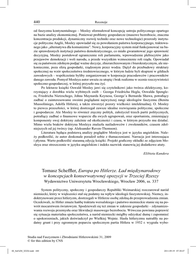 440 Recenzje od faszyzmu kontynentalnego – Mosley sformułował koncepcję ustroju politycznego opartego na bazie analizy ekonomicznej. Ponieważ problemy gospodarcze (masowe bezrobocie, znaczna koncentracja produkcji, dynamiczny rozwój techniki oraz nowe technologie) przerosły instytucje polityczne Anglii, Mosley opowiadał się za powołaniem państwa korporacyjnego, traktowanego jako „alternatywa dla komunizmu”. Nowy, korporacyjny system miał funkcjonować na bazie sprawdzonych instytucji państwa demokratycznego, co miało gwarantować jego sprawność decyzyjną. Mosley postulował ograniczenie roli parlamentu, wprowadzenie plebiscytów jako przejawów demokracji i woli narodu, a przede wszystkim wzmocnienie roli rządu. Opowiadał się za państwem zdolnym podjąć ważne decyzje, zhierarchizowanym i biurokratycznym, ale niekoniecznie, poza sferą gospodarki, rządzonym przez wodza. Dążył do przebudowy struktury społecznej na wzór społeczeństwa średniowiecznego, w którym ludzie byli skupieni w gildiach zawodowych – współcześnie byliby zorganizowani w korporacje pracodawców i pracowników danego zawodu. Pomysł Mosleya autor uważa za utopię i brak realizmu w ocenie rzeczywistości społeczno-gospodarczej, w której przyszło mu żyć. Po lekturze książki Oswald Mosley jawi się czytelnikowi jako twórca eklektyczny, korzystający z dorobku wielu wybitnych osób – Georga Friedricha Hegla, Oswalda Spenglera, Friedricha Nietzschego, Johna Maynarda Keynesa, George’a Bernarda Shawa, potrafiący zadbać o zainteresowanie swoimi poglądami najwyższej rangi ideologów faszyzmu (Benita Mussoliniego, Adolfa Hitlera), a także stworzyć pozory wielkości intelektualnej. O. Mosley to piewca przeszłości, w której dostrzegał zawsze idealne rozwiązania polityczne, społeczne i gospodarcze. Ale Mosley to również zręczny polityk, założyciel trzech partii politycznych, potrafiący zadbać o finansowe wsparcie dla swych ugrupowań, oraz oportunista, zmieniający komponenty swej doktryny zależnie od okoliczności i czasu, w którym przyszło mu działać. Mimo wielu braków doktryna Mosleya znalazła naśladowców i zwolenników, czasem zdolniejszych od jej twórcy (np. Aleksander Raven-Thomson). Literatura będąca podstawą analizy poglądów Mosleya jest w języku angielskim. Należy podkreślić, że autor doskonale poradził sobie z tłumaczeniami. Narracja jest interesująca i płynna. Warto podkreślić staranną edycję książki. Projekt graficzny okładki ze zdjęciem Mosleya oraz streszczenie w języku angielskim i indeks nazwisk stanowią jej dodatkowe atuty. Elżbieta Kundera Tomasz Scheffler, Europa po Hitlerze. Ład międzynarodowy w koncepcjach konserwatywnej opozycji w Trzeciej Rzeszy Wydawnictwo Uniwersytetu Wrocławskiego, Wrocław 2006, ss. 337 System polityczny, społeczny i gospodarczy Republiki Weimarskiej rozczarował naród niemiecki, który w większości stał się podatny na wpływ ideologii faszystowskiej. Niemcy, indoktrynowani przez hitleryzm, dostrzegali w Hitlerze osobę zdolną do przeprowadzenia zmian. Oczekiwali, że Hitler zmaże hańbę traktatu wersalskiego i państwo niemieckie stanie się na powrót mocarstwem światowym. Spodziewali się też zmian w zakresie gospodarki – zdynamizowania rozwoju przemysłu oraz likwidacji masowego bezrobocia. Wówczas powinna poprawić się sytuacja materialna społeczeństwa, a naród niemiecki mógłby odzyskać dumę i zapomnieć o upokorzeniach, jakich doświadczył po Wielkiej Wojnie. Hasła hitleryzmu natrafiły na podatny grunt i przy ogromnym poparciu społecznym partia Hitlera w 1932 r. wygrała wybo- Studia nad Faszyzmem i Zbrodniami Hitlerowskimi 31, 2009 © for this edition by CNS III_SnFiZH_XXXI.indd 440 2011-09-19 07:30:47 Recenzje 441 ry, a kilka miesięcy później Hitler został kanclerzem Niemiec. Sukces Hitlera oraz ideologia NSDAP wzbudziły niepokój wielu intelektualistów, którzy otwarcie występowali z krytyką hitleryzmu. Ukazywali Niemcom niebezpieczeństwa kryjące się za hasłami głoszonymi przez ideologów NSDAP: rządy totalitarne, brak demokracji, swobód politycznych i społecznych, bezwzględne podporządkowanie się wodzowi, szowinizm, a w sferze gospodarki – likwidacja wolnego rynku. Zagorzałymi krytykami Hitlera byli np. Wilhelm Röpke, Aleksander Rüstow oraz wielu innych intelektualistów, którzy, pozbawieni stanowisk na uniwersytetach, zostali zmuszeni do opuszczenia Niemiec. Na emigracji nie zaprzestali krytyki nazizmu, mając nadzieję na rychły upadek Trzeciej Rzeszy. Ci, którzy pozostali w ojczyźnie, w większości milczeli wobec zbrodni hitleryzmu. Milczącą postawę Niemców amerykański historyk Daniel J. Goldhagen uznał za zasadniczą przesłankę zbrodni nazistowskich (D.J. Goldhagen, Gorliwi kaci Hitlera. Zwyczajni Niemcy i Holocaust, Warszawa 1999). Nie tak surowo oceniła swoich współobywateli Sophie Scholl, uczestniczka opozycyjnej grupy studentów, zamordowana przez hitlerowców w 1943. Podczas procesu stwierdziła, że jej wrogie stanowisko wobec nazizmu podzielają wszyscy Niemcy, a jedynie obawa o życie własne i bliskich sprawia, że Niemcy nie są w stanie przeciwstawić się Hitlerowi. Jednak również w warunkach niesłychanego zastraszenia przez reżim hitlerowski znaleźli się odważni, którzy podjęli, niestety nieudane, próby obalenia Hitlera i doprowadzenia do upadku Trzeciej Rzeszy. Działania konspiracji antyhitlerowskiej były przedmiotem licznych badań historyków i doczekały się wielu wybitnych opracowań za granicą oraz w Polsce. Należy podkreślić znaczący dorobek w tym zakresie profesora Karola Joncy, wieloletniego kierownika Katedry Doktryn Politycznych i Prawnych Uniwersytetu Wrocławskiego, oraz stworzonej przez niego szkoły, do której należy również autor recenzowanej monografii. Książka T. Schefflera stanowi efekt jego długoletnich badań nad doktrynami konserwatywnymi w Nie