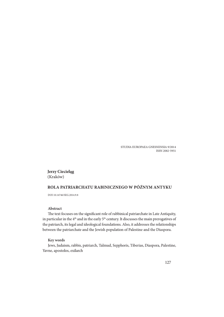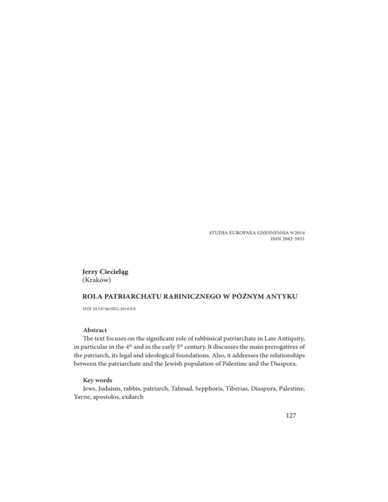 JERZY CIECIELĄG, ROLA PATRIARCHATU RABINICZNEGO W PÓŹNYM ANTYKU STUDIA EUROPAEA GNESNENSIA 9/2014 ISSN 2082-5951 Jerzy Ciecieląg (Kraków) ROLA PATRIARCHATU RABINICZNEGO W PÓŹNYM ANTYKU DOI 10.14746/SEG.2014.9.8 Abstract The text focuses on the significant role of rabbinical patriarchate in Late Antiquity, in particular in the 4th and in the early 5th century. It discusses the main prerogatives of the patriarch, its legal and ideological foundations. Also, it addresses the relationships between the patriarchate and the Jewish population of Palestine and the Diaspora. Key words Jews, Judaism, rabbis, patriarch, Talmud, Sepphoris, Tiberias, Diaspora, Palestine, Yavne, apostolos, exilarch 127 STUDIA EUROPAEA GNESNENSIA 9/2014 · TOŻSAMOŚĆ ŻYDOWSKA DAWNIEJ I DZIŚ Zniszczenie świątyni jerozolimskiej przez Rzymian w roku 70 po Chr. stało się jednym z najbardziej doniosłych i przełomowych wydarzeń w historii narodu żydowskiego i wyznawanego przez niego judaizmu. Przed elitami żydowskimi stanęło zadanie — nie pierwsze w historii — nadania kultowi Jahwe zupełnie nowego oblicza bez ofiar składanych w świątyni. Odtąd judaizm miał być wyłącznie religią słowa, a jego reforma stała się udziałem rabinów, kierowanych przez patriarchę rabinicznego (po hebrajsku Nasi), rezydującego najpierw w Sefforis, a później w Tyberiadzie. Część badaczy wskazuje nawet, że w okresie rozkwitu patriarchatu Żydzi w Palestynie cieszyli się de facto własną władzą autonomiczną o charakterze wręcz monarchicznym1. Według przekazu Orygenesa na czele społeczności żydowskiej stał etnarcha, choć najczęściej mówi się o patriarsze2. Rozkwit tej instytucji przypada na późny antyk. Zauważmy, że nasz obraz okresu rabinicznego lub talmudycznego oparty jest w głównej mierze na źródłach rabinicznych, które powstawały od III do XII w. Dzięki temu możemy poznać różne kręgi środowiska rabinów, ich wzajemne relacje, instytucje, wreszcie kwestie społeczne i ekonomiczne. Trzeba jednak pamiętać o specyfice tych dokumentów, które przekazują nam obraz dalece niekompletny i obarczony dużą dozą niepewności. W konsekwencji uczeni są teraz daleko bardziej sceptyczni, dowodząc, że mamy jednak do czynienia z relacjami późniejszymi, opisującymi rzeczywistość im współczesną, niekoniecznie zaś czasy, do których mają się rzekomo odnosić3. Badacz okresu rabinicznego musi więc podchodzić do źródeł z daleko idącą ostrożnością. Co więcej, w odniesieniu do jego początków nie ma żadnych innych przekazów źródłowych, co czyni weryfikację dostępnego materiału praktycznie niemożliwą. Na szczęście ostatnie stulecie istnienia patriarchatu możemy poznać również dzięki aktom prawnym wydawanym przez rzymskich cesarzy, jak i źródłom chrześcijańskim i pogańskim. Należy tu podkreślić, że jest to materiał nieżydowski, co podnosi 1 M.in. D. Goodblatt, Monarchic Principle: Studies in Jewish Self-Government in Antiquity, Tübingen 1994. 2 Orygenes, List do Juliusza Afrykańczyka 14 (Patrologia Graeca 11, 81, 84); tak m.in. D. Goodblatt, The Monarchic Principle, s. 131. Najnowszą pracą poświęconą patriarchatowi jest A. Appelbaum, The Dynasty of the Jewish Patriarchs, Tübingen 2013. 3 Zob. m.in. H. Lapin, The Origins and Development of the Rabbinic Movement in the Land of Israel, [w:] The Cambridge History of Judaism, 4: The Late Roman-Rabbinic Period, Cambridge 2006, s. 206–229; S. Schwartz, The Political Geography of Rabbinic Texts, [w:] Ch.E. Fonrobert, M.S. Jaffe (red.), The Cambridge Companion to the Talmud and Rabbinic Literature, Cambridge 2007, s. 75–96. 128 JERZY CIECIELĄG, ROLA PATRIARCHATU RABINICZNEGO W PÓŹNYM ANTYKU jego wartość badawczą4. Pytanie, jakie się tutaj nasuwa, to czy możemy obraz patriarchatu rabinicznego w IV i początkach V wieku przenieść na okres wcześniejszy? Niektórzy interpretatorzy dowodzą, że w całym okresie istnienia tej instytucji ulegała ona tylko niewielkim zmianom, a więc zabieg taki jest jak najbardziej uzasadniony5, inni zaś uznają patriarchat za w pełni rozwinięty dopiero w ostatnim stuleciu istnienia, kiedy stał się przedmiotem rzymskiej legislacji6. Część historyków wskazuje natomiast, że władza patriarchy stopniowo wzrastała, aby osiągnąć swoje apogeum w wieku IV7. W każdym razie po katastrofie roku 70 po Chr. grupa rabinów zebrać się miała w miejscowości Yavne, dając początek fundamentom judaizmu rabinicznego. Nasza wiedza o tym okresie jest znikoma, w dodatku oparta na późniejszej tradycji, która próbuje wmówić nam szybki triumf rabinizmu w społeczeństwie żydowskim, choć w rzeczywistości proces ten przebiegał znacznie dłużej i nie był wolny od wielu przeszkód. Okres Yavne, trwający do wybuchu powstania Bar Kochby, dzieli się wyraźnie na dwie części. W pierwszej na plan pierwszy wysuwa się Rabbi Jochanan ben Zakkaj8. Jest to postać niezwykle zagadkowa, nic właściwie nie wiemy o jego działalności przed powstaniem żydowskim, co więcej, jego pobyt i osiągnięcia w Yavne też nie wyglądają na specjalnie imponujące. Dla porządku trzeba zauważyć, że tradycja rabiniczna przypisywała mu duże umiejętności interpretacji Pisma, Miszny, Gemary, halachy, hagady, nie mówiąc już o mistycyzmie i spekulacjach metafizycznych9. Trudno jednak ocenić wartość historyczną tych przekazów, najprawdopodobniej jest ona bardzo niska. Największą zasługą Jochanana miało być wydanie dziewięciu takkanot, czyli decyzji religijnych, choć ich znaczenie dla naszych badań jest bardzo różne. Dotyczą one m.in. prób przeniesienia kultu świątynnego prawdopodobnie do synagog czy przekształcenia pewnych D. Goodblatt, The Monarchic Principle, s. 132. H. Mantel, Studies in the History of the Sanhedrin, Cambridge 1962, s. 198–199. 6 M. Goodman, State and Society in Roman Galilee, Totowa 1983, s. 11–118. 7 Tak L.