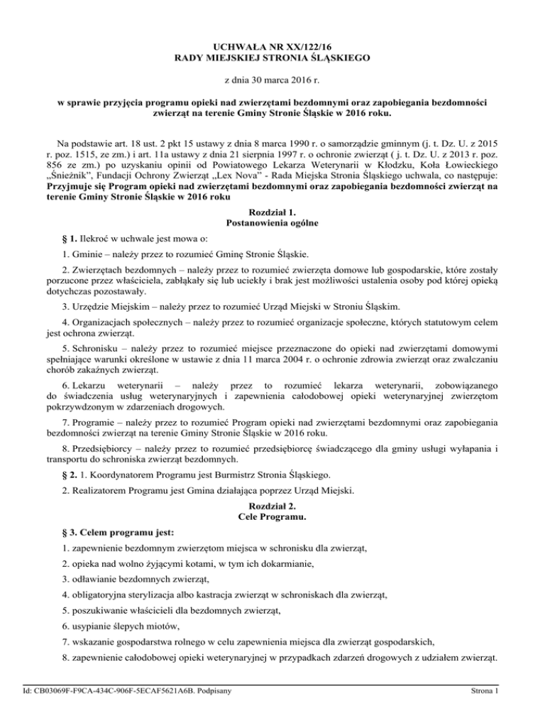 UCHWAŁA NR XX/122/16 RADY MIEJSKIEJ STRONIA ŚLĄSKIEGO z dnia 30 marca 2016 r. w sprawie przyjęcia programu opieki nad zwierzętami bezdomnymi oraz zapobiegania bezdomności zwierząt na terenie Gminy Stronie Śląskie w 2016 roku. Na podstawie art. 18 ust. 2 pkt 15 ustawy z dnia 8 marca 1990 r. o samorządzie gminnym (j. t. Dz. U. z 2015 r. poz. 1515, ze zm.) i art. 11a ustawy z dnia 21 sierpnia 1997 r. o ochronie zwierząt ( j. t. Dz. U. z 2013 r. poz. 856 ze zm.) po uzyskaniu opinii od Powiatowego Lekarza Weterynarii w Kłodzku, Koła Łowieckiego „Śnieżnik”, Fundacji Ochrony Zwierząt „Lex Nova” - Rada Miejska Stronia Śląskiego uchwala, co następuje: Przyjmuje się Program opieki nad zwierzętami bezdomnymi oraz zapobiegania bezdomności zwierząt na terenie Gminy Stronie Śląskie w 2016 roku Rozdział 1. Postanowienia ogólne § 1. Ilekroć w uchwale jest mowa o: 1. Gminie – należy przez to rozumieć Gminę Stronie Śląskie. 2. Zwierzętach bezdomnych – należy przez to rozumieć zwierzęta domowe lub gospodarskie, które zostały porzucone przez właściciela, zabłąkały się lub uciekły i brak jest możliwości ustalenia osoby pod której opieką dotychczas pozostawały. 3. Urzędzie Miejskim – należy przez to rozumieć Urząd Miejski w Stroniu Śląskim. 4. Organizacjach społecznych – należy przez to rozumieć organizacje społeczne, których statutowym celem jest ochrona zwierząt. 5. Schronisku – należy przez to rozumieć miejsce przeznaczone do opieki nad zwierzętami domowymi spełniające warunki określone w ustawie z dnia 11 marca 2004 r. o ochronie zdrowia zwierząt oraz zwalczaniu chorób zakaźnych zwierząt. 6. Lekarzu weterynarii – należy przez to rozumieć lekarza weterynarii, zobowiązanego do świadczenia usług weterynaryjnych i zapewnienia całodobowej opieki weterynaryjnej zwierzętom pokrzywdzonym w zdarzeniach drogowych. 7. Programie – należy przez to rozumieć Program opieki nad zwierzętami bezdomnymi oraz zapobiegania bezdomności zwierząt na terenie Gminy Stronie Śląskie w 2016 roku. 8. Przedsiębiorcy – należy przez to rozumieć przedsiębiorcę świadczącego dla gminy usługi wyłapania i transportu do schroniska zwierząt bezdomnych. § 2. 1. Koordynatorem Programu jest Burmistrz Stronia Śląskiego. 2. Realizatorem Programu jest Gmina działająca poprzez Urząd Miejski. Rozdział 2. Cele Programu. § 3. Celem programu jest: 1. zapewnienie bezdomnym zwierzętom miejsca w schronisku dla zwierząt, 2. opieka nad wolno żyjącymi kotami, w tym ich dokarmianie, 3. odławianie bezdomnych zwierząt, 4. obligatoryjna sterylizacja albo kastracja zwierząt w schroniskach dla zwierząt, 5. poszukiwanie właścicieli dla bezdomnych zwierząt, 6. usypianie ślepych miotów, 7. wskazanie gospodarstwa rolnego w celu zapewnienia miejsca dla zwierząt gospodarskich, 8. zapewnienie całodobowej opieki weterynaryjnej w przypadkach zdarzeń drogowych z udziałem zwierząt. Id: CB03069F-F9CA-434C-906F-5ECAF5621A6B. Podpisany Strona 1 Rozdział 3. Realizacja Programu Realizacja programu odbywać się będzie zgodnie z przepisami ustawy z dnia 21 sierpnia 1997 r. oochronie zwierząt (t.j.: Dz. U. z 2013 r. poz. 856 ze zm.). Zapewnienie bezdomnymzwierzętom miejsca w schronisku dla zwierząt. § 4. Zapewnienie bezdomnym zwierzętom miejsca w schronisku dla zwierząt realizowane będzie poprzez: 1. zawarcie przez gminę umowy na umieszczanie bezdomnych zwierząt w schronisku dla zwierząt. 2. zawarcie przez gminę umowy na wyłapanie i transport bezdomnych zwierząt do schroniska dla zwierząt. 3. podjęcie wspólnych działań z innymi jednostkami, mających na celu utworzenie międzygminnych schronisk dla zwierząt bezdomnych. Rozdział 4. Opieka nad wolno żyjącymi kotami, w tym ich dokarmianie. § 5. Opieka nad wolno żyjącymi kotami, w tym ich dokarmianie realizowane będzie poprzez: 1. zakup karmy i przekazywanie jej osobom, działającym jako wolontariusze zajmujący się opieką nad kotami wolno żyjącymi, 2. monitorowanie w rocznych okresach liczebności populacji wolno żyjących kotów, 3. monitorowanie miejsc schronienia i bytowania wolno żyjących kotów, 4. podejmowanie przy udziale lekarza weterynarii odpowiedniej interwencji w sprawie wolno żyjących kotów, 5. prowadzenie rejestru opiekunów wolno żyjących kotów, 6. podejmowanie niezbędnych działań dla utrzymania dobrego stanu zdrowia wolno żyjących kotów, w tym usypianie ślepych miotów. Rozdział 5. Odławianie bezdomnych zwierząt. § 6. 1. Odławianie bezdomnych zwierząt z terenu gminy będzie miało charakter stały i wykonywane będzie przez przedsiębiorcę prowadzącego tego rodzaju działalność gospodarczą. 2. Odławianiu podlegać będą zwierzęta bezdomne, zagubione, wałęsające się, porzucone przez właściciela. 3. Odławianie z terenu gminy bezdomnych zwierząt, zagubionych i wałęsających się realizowane będzie w sposób następujący: Urząd po przyjęciu zgłoszenia o wałęsającym się zwierzęciu zawiadomi Przedsiębiorcę aby dokonał odłowienia i przewiezienia go do schroniska. Rozdział 6. Obligatoryjna sterylizacja albo kastracja zwierząt w schroniskach dla zwierząt § 7. Sterylizacja albo kastracja zwierząt w szczególności psów i kotów realizowana będzie przez Schronisko dla Zwierząt (nr rejestr. 10093401) Szczyty ul. Wieluńska 108, 98-355 Działoszyn poprzez obligatoryjne przeprowadzanie zabiegów sterylizacji lub kastracji przyjmowanych zwierząt, z wyjątkiem zwierząt u których istnieją przeciwwskazania do wykonywania tych zabiegów z uwagi na stan zdrowia i/lub wiek. Rozdział 7. Poszukiwanie właścicieli dla bezdomnych zwierząt § 8. Poszukiwanie właścicieli dla zwierząt bezdomnych prowadzić będzie: 1. Gmina poprzez ogłaszanie w prasie lokalnej, na tablicach ogłoszeniowych oraz na stronie internetowej. W celu umożliwienia osobom zainteresowanym dokonaniem adopcji bezdomnych zwierz