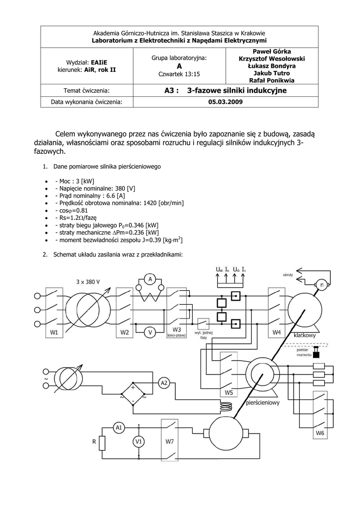 Akademia Górniczo-Hutnicza im. Stanisława Staszica w Krakowie Laboratorium z Elektrotechniki z Napędami Elektrycznymi Wydział: EAIiE kierunek: AiR, rok II Grupa laboratoryjna: A Czwartek 13:15 Temat ćwiczenia: A3 : Data wykonania ćwiczenia: Paweł Górka Krzysztof Wesołowski Łukasz Bondyra Jakub Tutro Rafał Ponikwia 3-fazowe silniki indukcyjne 05.03.2009 Celem wykonywanego przez nas ćwiczenia było zapoznanie się z budową, zasadą działania, własnościami oraz sposobami rozruchu i regulacji silników indukcyjnych 3fazowych. 1. Dane pomiarowe silnika pierścieniowego - Moc : 3 [kW] Napięcie nominalne: 380 [V] Prąd nominalny : 6.6 [A] Prędkość obrotowa nominalna: 1420 [obr/min] cos=0.81 Rs=1.2/fazę straty biegu jałowego P0=0.346 [kW] straty mechaniczne Pm=0.236 [kW] moment bezwładności zespołu J=0.39 [kgm2] 2. Schemat układu zasilania wraz z przekładnikami: 3. Charakterystyka mechaniczna z rozruchu silnika pierścieniowego T(n). W celu wyznaczenia charakterystyki mechanicznej zmierzyliśmy w funkcji czasu: UAB oraz prędkość obrotową silnika. Na podstawie tych pomiarów i prostych obliczeń uwzględniających poniże wzory określiliśmy charakterystykę T(n): Tsiln Tobc J d dt , Tsiln J d ,n dt Prędkość obrotową podaną w obr/min przeliczyliśmy na prędkość kątową w radianach na sekundę Tobc wynosiło 0, a pochodna prędkości kątowej zastąpiliśmy ilorazem różnicowym I-rzedu. Uwzględniamy również fakt, że rozruch silnika odbywał się na obniżonym względem napięcia znamionowego napięciu. Zgodnie z poniższym wzorem, wykres przedstawia wartości znamionowe: T (n) znamionowe T (n) zmierzone U N U AB 2 4. Wykres prądu w funkcji prędkości obrotowej Ia(n) Podobnie jak poprzednia charakterystyka, wartości prądu w funkcji prędkości obrotowej uzyskaliśmy wykonując pomiary z nawrotu maszyny. Zmierzoną wartość prądu wykorzystaliśmy wprost do narysowania wykresu. Z uzyskanych charakterystyk widać, że podczas rozruchu silnika płyną prądy o dużych wartościach, przekraczające wartości nominalne. 5. Jako trzecie zagadnienie zdecydowaliśmy się wyznaczyć charakterystykę obciążeniową. W tym celu jednocześnie rejestrowaliśmy wartości prądów, napięć, współczynnika mocy, mocy pobranej i prędkości, przy zmiennym obciążeniu maszyny. Zgodnie z poniższymi wzorami obliczyliśmy moc oddaną. P P P 2 1 P P P P s P Fe P m P Cu P P w_wirniku dodatkowe 2 Cu 3R I s w_wirniku dodatkowe 1 n n P 1 P Cu P Fes 0.005P 1 gdzie: P1 - zmierzona mocy pobranej ΣΔP - suma strat s - poślizg Rs rezystancja fazy stojana. Wartości ΔPFe, ΔPm, Rs odczytano z danych znamionowych silnika. s Mając wyliczoną moc oddaną oraz zmierzoną moc pobraną wyznaczyliśmy charakterystykę sprawności silnika od mocy oddanej. 6. Wnioski Wszystkie uzyskane wyniki wydają się być zgodne z teoretycznymi, podawanymi w literaturze jako charakterystyczne dla tego rodzaju silników. Kształty wykresów, z pominięciem małych oscylacji związanych z pomijanymi często zjawiskami elektromagnetycznymi (wyższe składowe harmoniczne pola magnetycznego) są również odpowiednie. Z porównania charakterystyk mechanicznych wynika, że dla rozruchu z rozrusznikiem, dla niskich prędkości obrotowych uzyskuje się większe wartości momentu obrotowego, jednakże odbywa się to kosztem jego spadku dla prędkości wyższych. W rzeczywistym zagadnieniu tuz po fazie rozruchu/ w odpowiednim momencie tego procesu następuje zmniejszenie/zwarcie oporów rozruszniku, dzięki czemu dalszy wzrost prędkości obrotowej odbywa się przy utrzymywaniu momentu blisko wartości maksymalnej. Charakterystyki prądowe pokazują, że rozruch z rozrusznikiem powoduje spadek pobieranego przez silnik, podczas rozruchu prądu. Jest to istotne zagadnienie, ponieważ przepływ prądu znacznie przekraczającego wartość nominalna może uszkodzić maszynę jak i również jest nieekonomiczny. Powoduje on znaczne obciążenie sieci energetycznej (ponad 20 amperów zamiast 6), co z kolei wymaga stosowania grubszych przewodów, powiększa straty w nich, oraz często powoduje efekt przeciążenia sieci objawiający się np. przygasaniem żarówek. Zatem korzystnie jest podczas startowania maszyny wpiąć w obwód wirnika odpowiednio dobraną rezystancję jako rozrusznik, lub tez skorzystać z wielopoziomowego rozrusznika, który w trakcie rozpędzania silnika będzie się automatycznie przełączać, aby przy każdej z prędkości od 0 do prędkości znamionowej moment obrotowy był możliwie bliski znamionowemu. Z ostatniej przeprowadzonej przez nas próby i ostatniej wyznaczonej charakterystyki można wysnuć wniosek, że sprawność silnika jest tym większe im większą wydaje z siebie moc. Da się również zaobserwować fakt, ze dla małych wartości mocy oddawanej, jej nieduży wzrost powoduje znaczny wzrost sprawności. Wraz ze wzrostem wartości oddawanej mocy szybkość tego przyrostu maleje. Jest to spowodowane w dużej mierze stratami w uzwojeniach, które są zależne od przepływającego prądu. Praca na biegu jałowym, przy małym współczynniku mocy powoduje tylko przesunięcie fazowe, natomiast wartość prądu jak i straty z tym związane są podobne. Dla większych obciążeń straty te stają się coraz mniejsze w porównaniu z wydawaną mocą co skutkuje wzrostem sprawności. Drugie rodzaj strat – straty mechaniczne rośnie wraz prędkością obrotową, dlatego nie da się uzyskać dużej sprawności bez stosunkowo drogich sposobów eliminacji tarcia.