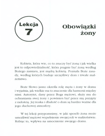 Obowiązki żony Kobieta, która wie, co to znaczy być żoną i jak wielka jest to odpowiedzialność, która pragnie być żoną według Bożego zamiaru, jest mądrą kobietą. Poznała Boże zasady, według których buduje szczęśliwy dom i trwałe małzeństwo. Boże Słowo jasno określa rolę męża i żony w domu i wyjaśnia, jak wielkie ma to znaczenie dla harmonii między nimi. Autorytet, dany przez Boga mężowi, służy mu do ochraniania swej żony i powinien być przez nią przyjęty z radością. Jej troska i dbałość o dom są bardzo ważne dla jego duchowej atmosfery. W tej lekcji przypomnimy, w jaki sposób żona może umożliwić mężowi wypełnienie swojej roli w małżeństwie. Robiąc to, wpływa na umocnienie swojego domu. W tej lekcji będziesz się uczyć o tym, jak: Kochać męża Czynić swój dom szczęśliwym Kochać i wychowywać dzieci Służyć poza domem Ta lekcja pomoże ci: • Omówić podstawowe zagadnienia relacji małżeńskich i poznać, w jaki sposób mogą one stanowić mocne spoiwo małżeństwa w różnych trudnościach. • Opisać rolę żony w budowaniu szczęśliwego domu. • Poznać, w jaki sposób żona wpływa na swoją rodzinę. Małżelistwo 110 KOCHĄJ dom MĘZA Kochaj iszanuj męża Niektórzy mówią, że żona powinna przede wszystkim być poddana SWOjemu męzowi. Apostoł Paweł pisząc do Tytusa przypomniał mu, żeby pouczał starsze kobiety, aby postępowały, tak jak powinny postępować pobożne niewiasty, by mogły pouczać "... młodsze leobiety, żeby mi- łowały swoich mężów i dzieci, żeby były wstrzemięźliwe, czyste, gospodarne, dobre, mężom swoim uległe, aby Słouni Bożemu ujmy nie przY1l0SZ01l0" (Tytus 2 4-5). Widzimy więc, że także Bóg oczekuje od żony poddania się swojemu mężowi. Kobieta, która pragnie być temu posłuszna, zobaczy, ze tak naprawdę nie jest to trudne. To czy zona będzie posłuszna temu przykazaniu, w dużej mierze zależy od tego, jak bardzo kocha męża i na ile mąż jest głową rodziny. Ważniejsze niż próba udowodnienia tego, co jest głównym obowiązkiem zony, jest podkreślenie, jak ważna jest miłość i szacunek pomiędzy małżonkami. Brak tych elementów w małżeństwie sprawia, że znajduje się ono na niepewnym gruncie. Mąz i żona, którzy wierzą, że małżeństwo zostało ustanowione przez Boga, a wzorem dla ich relacji jest relacja między Chrystusem J Kościołem, budują swój dom na trwałym fundamencie (Efezjan 5:21-33). W lekcji 6 mówiliśmy, ze mąz powinien kochać i szanować swoją żonę. To odnosi się również do żony. W zalezności od tego, jakimi są oni dla siebie partnerami, mąż i zona mogą sobie pomagać lub utrudniać w małzeństwie Obowiązki żony 111 wykonywarne zadań, jakle przed nimi postawił Bóg. Tak jak mąż powinien kochać i troszczyć się o swoją żonę, jako o słabsze stworzenie, tak I żona powinna kochać i troszczyć się o swojego rnęza, jako mocniejszego partnera, który jest głową domu Bez względu na to, czy jako mąż popełnia on dużo, czy mało błędów, zasługuje na jej szacunek Biblia uczy· "A zatem niechaj l każdy z was miłuje żonę swoją, jak siebie samego, a żona niechaj poważa męża swego" (Efezjan 5·33) Między mężem i żoną nie ma miejsca na obelżywe słowa. Nie powinni oni irytować się i dokuczać sobie narzekając i besztając się nawzajem. Oczywiście żona nie powinna nigdy ośmieszać lub krytykować męża w obecności innych W chwilach trudności i kryzysów miłość i szacunek pomiędzy mężem i żoną stanowią ochronną barierę dla ich małżeństwa Ich humory i emocje nie mogą naruszyć fundamentów małzeństwa ZADANIE ~-- 1 Naucz się na pamięć Efezjan 5:33. 2 Jakie elementy pozwalają w małżeństwie i żonie przezwyciężyć chwile kryzysu? męzowi 3 Zakreśl literę przed PRAWDZIWYM stwierdzeniem. a Mąż, który pragnie, by żona była mu poddana, powinien starać się być męzem według biblijnego wzoru. 112 Małżeństwo i dom b Jeżeli mąż nie jest męzern według zasad Bibhi, to zona nie musi być mu poddana. c BIblia mówi, by zona kochała i szanowała męża, ale nie musi być mu poddana. swojego Bądi mu wierna Ceremorua ślubna może być różna w różnych krajach. Nawet ślubowanie małżeńskie może być różne w zależności od uwarunkowań kulturowych. Poruewaz Jednak małżeństwo zostało ustanowione przez Boga, toteż podlega Bozym prawom. Zawarte w Biblii prawa różnią się bardzo od tych, które wyznaje i według których żyje większość ludzr. Jezus, cytując prawo Mojżesza, powiedział: ". dlatego 0PUŚC1 człowiek ojca swego oraz matkę ipołączy SIę z zonq swoją. I będą ci duoje jednvm ciałem. A takjuz nie są dU'OJe,lecz Jedno ciało. Co tedy Bóg złączył, człowiek niechaj nie rozłącza" (Marek 10:7-9). Wiersze 11 i 12 tego samego rozdziału potwierdzają fakt, że Bóg zamierzył trwałość związku małżeńskiego, dopóki oboje małżonkowie żyją. Każdy z małżonków, który rozwodzi SIę i poślubia kogoś innego, jest wrnlen cudzołóstwa. Mężczyzna i kobieta, którzy ślubują sobie wierność małżeńską, w Bozych oczach stają się jednością. jezeli zawsze widzą ten święty związek, tak jak widzi go Bóg, to pozostają jednością, czy to w chorobie, czy w ZdroWIU, czy w trudnościach finansowych, czy wtedy, gdy dobrze się im powodzi, a WIęC w dobrym, jak i w złym czasie. W chwilach kryzysu mężowi może wiele pomóc cierpli- Obowiązki zony 113 wość, zrozumienie i zachęta żony, bez których sam mógłby nie dać sobie rady w tym trudnym czasie. Przypowieści 31 mówią dużo na temat dobrej zony, opisując jej cechy, a wiersz 30 podkreśla jej bogobojność. Trudno znaleźć taką zonę, a "jejwartośćprzewyższa perły" (w 10). Jest czysta i sprawredlrwa. uczciwa i godna zaufania. Jest wierna swemu mężowi w myślach, słowach i czynach, "gdvz wyświadcza mu dobro, a