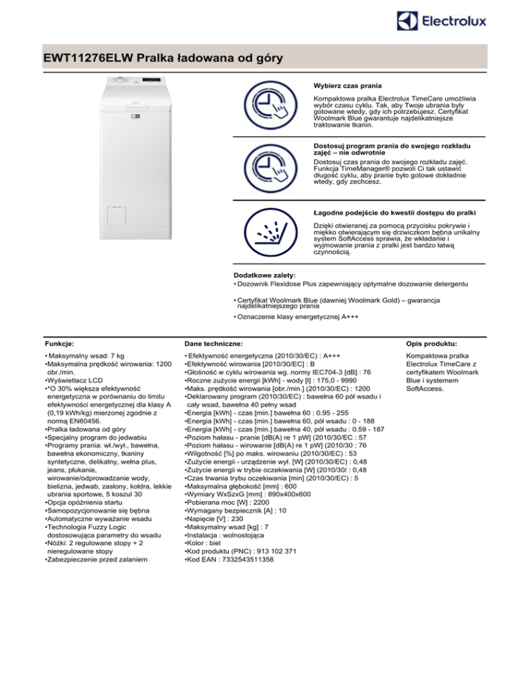 EWT11276ELW Pralka ładowana od góry Wybierz czas prania Kompaktowa pralka Electrolux TimeCare umożliwia wybór czasu cyklu. Tak, aby Twoje ubrania były gotowane wtedy, gdy ich potrzebujesz. Certyfikat Woolmark Blue gwarantuje najdelikatniejsze traktowanie tkanin. Dostosuj program prania do swojego rozkładu zajęć – nie odwrotnie Dostosuj czas prania do swojego rozkładu zajęć. Funkcja TimeManager® pozwoli Ci tak ustawić długość cyklu, aby pranie było gotowe dokładnie wtedy, gdy zechcesz. Łagodne podejście do kwestii dostępu do pralki Dzięki otwieranej za pomocą przycisku pokrywie i miękko otwierającym się drzwiczkom bębna unikalny system SoftAccess sprawia, że wkładanie i wyjmowanie prania z pralki jest bardzo łatwą czynnością. Dodatkowe zalety: • Dozownik Flexidose Plus zapewniający optymalne dozowanie detergentu • Certyfikat Woolmark Blue (dawniej Woolmark Gold) – gwarancja najdelikatniejszego prania • Oznaczenie klasy energetycznej A+++ Funkcje: Dane techniczne: Opis produktu: • Maksymalny wsad: 7 kg •Maksymalna prędkość wirowania: 1200 obr./min. •Wyświetlacz LCD •*O 30% większa efektywność energetyczna w porównaniu do limitu efektywności energetycznej dla klasy A (0,19 kWh/kg) mierzonej zgodnie z normą EN60456. •Pralka ładowana od góry •Specjalny program do jedwabiu •Programy prania: wł./wył., bawełna, bawełna ekonomiczny, tkaniny syntetyczne, delikatny, wełna plus, jeans, płukanie, wirowanie/odprowadzanie wody, bielizna, jedwab, zasłony, kołdra, lekkie ubrania sportowe, 5 koszul 30 •Opcja opóźnienia startu •Samopozycjonowanie się bębna •Automatyczne wyważanie wsadu •Technologia Fuzzy Logic dostosowująca parametry do wsadu •Nóżki: 2 regulowane stopy + 2 nieregulowane stopy •Zabezpieczenie przed zalaniem • Efektywność energetyczna (2010/30/EC) : A+++ •Efektywność wirowania [2010/30/EC] : B •Głośność w cyklu wirowania wg. normy IEC704-3 [dB] : 76 •Roczne zużycie energii [kWh] - wody [l] : 175,0 - 9990 •Maks. prędkość wirowania [obr./min.] (2010/30/EC) : 1200 •Deklarowany program (2010/30/EC) : bawełna 60 pół wsadu i cały wsad, bawełna 40 pełny wsad •Energia [kWh] - czas [min.] bawełna 60 : 0.95 - 255 •Energia [kWh] - czas [min.] bawełna 60, pół wsadu : 0 - 188 •Energia [kWh] - czas [min.] bawełna 40, pół wsadu : 0.59 - 187 •Poziom hałasu - pranie [dB(A) re 1 pW] (2010/30/EC : 57 •Poziom hałasu - wirowanie [dB(A) re 1 pW] (2010/30 : 76 •Wilgotność [%] po maks. wirowaniu (2010/30/EC) : 53 •Zużycie energii - urządzenie wył. [W] (2010/30/EC) : 0,48 •Zużycie energii w trybie oczekiwania [W] (2010/30/ : 0,48 •Czas trwania trybu oczekiwania [min] (2010/30/EC) : 5 •Maksymalna głębokość [mm] : 600 •Wymiary WxSzxG [mm] : 890x400x600 •Pobierana moc [W] : 2200 •Wymagany bezpiecznik [A] : 10 •Napięcie [V] : 230 •Maksymalny wsad [kg] : 7 •Instalacja : wolnostojąca •Kolor : biel •Kod produktu (PNC) : 913 102 371 •Kod EAN : 7332543511358 Kompaktowa pralka Electrolux TimeCare z certyfikatem Woolmark Blue i systemem SoftAccess.