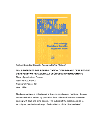 Author: Stanislaw Kowalik, Augustyn Bańka (Editors) Title: PROSPECTS FOR REHABILITATION OF BLIND AND DEAF PEOPLE (PERSPEKTYWY REHABILITACJI OSÓB GŁUCHONIEWIDOMYCH) Place of publication: Poznan ISBN 83-909262-0-2 Number of Pages: 174 Year: 1998 The book contains a collection of articles on psychology, medicine, therapy and rehabilitation written by specialists from different European countries dealing with deaf and blind people. The subject of the articles applies to techniques, methods and ways of rehabilitation of the blind and deaf. Author: Karol Orlowski Title: APPLICATION OF CSS STATISTICA PACKAGE FOR THE ANALYSIS OF RESULTS IN SOCIAL SCIENCES (ZASTOSOWANIE PAKIETU STATISTICA W ANALIZIE WYNIKÓW BADAŃ SPOŁECZNYCH) Place of publication: Poznan ISBN 83-916521-0-6 Number of Pages: 130 Year: 2001 The book illustrates the use of CSS STATISTICA PACKAGE in the analysis of social and psychological data. In an accessible way shows the basic steps one must perform as a researcher to achieve valuable results. Author: Katarzyna Popiołek (Editors) Title: MAN IN RISK SITUATION. CRISES, CATASTROPHES, AND NATURAL DISASTERS (CZŁOWIEK W SYTUACJI ZAGROŻENIA. KRYZYSY, KATASTROFY, KATAKLIZMY Place of publication: Poznan ISBN 83-909262-2-9 Number of pages: 354 Year: 2001 The book includes a collection of 23 empirical and theoretical articles on disasters, cathastrophes and crises. This issue is analysed both in terms of psychological reactions as well as social. Author: Irena Heszen-Niejodek (Editors) Title: THEORY AND CLINICAL PROBLEMS OF COPING WITH STRESS (TEORETYCZNE I KLINICZNE PROBLEMY RADZENIA SOBIE ZE STRESEM) Place of publication: Poznan ISBN 83-916521-5-7 Number of Pages: 197 Year: 2001 The work includes 8 articles devoted to theoretical and clinical problems of stress and coping. There are discussed different types of stress, the mechanisms of formation and combat the phenomenon. Author: Alexander Hauziński Title: COGNITIVE MAPS OF LIVING ENVIRONMENT TRHREATENED BY CRIME (MAPY POZNAWCZE ŚRODOWISKA ZAMIESZKANIA ZAGROŻONEGO PRZESTĘPCZOŚCIĄ) Place of publication: Poznan ISBN 83-916521-4-9 Number of pages: 173 Year: 2001 The book presents the problem of information processing in the human mental space in the form of cognitive maps. It discusses the historical background and the main directions of research associated with the formation by the people of mental representation of space. The paper presents the results of empirical research on creating cognitive maps of urban environment in which there is a high risk of crime. Author: Katarzyna Popiołek (Editors) Title: CRISES, CATHASTROPHES, AND CATHACLISMS. THE PHENOMENON OF MODERN CIVILIZATION (KRYZYSY KATASTROFY KATAKLIZMY. ZJAWISKA WSPÓŁCZESNEJ CYWILIZACJI) Place of publication: Poznan ISBN 83-920403-1-7 Number of pages: 317 Year: 2003 The book includes 28 articles on a wide range of psychological threats, with which it comes to wrestle modern man. In the book are also discussed the challenges which must be adequately elaborated by psychological theory and practice. The articles are grouped to three thematic sets. In the first of them indicated are new disturbing phenomena, which were at the centre of public attention as terrorism. The second part discusses the psychological crises, and the third part discusses the hazards in the work environment. Author: Bogdan Rożnowski, Adam Biela, Augustyn Bańka (Editors) Title: WORK AND ORGANIZATION IN THE PROCESS OF CHANGE (PRACA I ORGANIZACJAW PROCESIE ZMIAN) Place of publication: Poznan ISBN: 83-920403-8-4 Number of pages: 229 Year: 2006 The book discusses the problems of work and organization in the process of change taking place today at three levels: 1 - macro-structural changes, 2 microstructural changes in the context of micro-organizations, business, nonprofit organizations, and public sector, 3 - changes in the attitudes of individual persons. Author: Katarzyna Popiołek, Augustyn Bańka (Editors) Title: CRISES, CATHASTROPHES, AND CATHACLISMS IN THE CONTEXT OF INCREASING HAZARDS (KRYZYSY KATASTROFY KATAKLIZMY W KONTEKŚCIE NARASTANIA ZAGROŻEŃ) Place of publication: Poznan ISBN: 978-83-920403-7-8 Number of pages: 356 Year: 2007 Twenty-eight articles presented in this book include four thematic groups. The first concerns the threats on a social scale. The second discusses the risks associated with the pressures of cultural trends. The third shows the risks associated with using and rescue in emergency situations. The fourth thematic group includes examples of serious technical failures that have occurred in various parts of the world. Author: Aneta Brzezicka, Izabela Krejtz (Editors) Title: NEUROCOGNITIVE PERSPECTIVE IN PSYCHOPATHOLOGY (NEUROPOZNAWCZA PERSEKTYWA W PSYCHOPATOLOGII) Place of publication: Poznan ISBN: 978-83-920403-2-3 Number of pages: 182 Year: 2009 The monograph is a competent overview of the latest theoretical models and research methods psychopathology, cognitive and cognitive and clinical neuroscience. With this monograph The reader will have the opportunity to know the progress that has been made in recent years in the field of analysis of mental disorders using the latest methods of computer studies of cognitive processes, and using better methods of analysis of the psychophysiological and neuroimaging of the brain. Author: Katarzyna Popiołek, Augustyn Bańka (Editors) Title: CRISES, CATHASTROPHES, AND CATHACLISMS IN THE PERSPECTIVE OF PSYCHOLOGY (KRYZYSY KATASTROFY KATAKLIZMY W PERSPEKTYWIE PSYCHOLOGICZNEJ) Place of publication: Poznan ISBN: 978-83-62051-00-7 Number of pages: 378 Year: 2010 In this book containing 28 articles are discussed the issues of crises, disasters and catastrophes from the psychological perspective of social exclusion, defense mechanisms, mental disorders, interpersonal relations, discrimination, social support and social manipulation. Author: Katarzyna Popiołek, Augustyn Bańka, Augustine bubble (Editors) Title: CRISES, CATHASTROPHES,