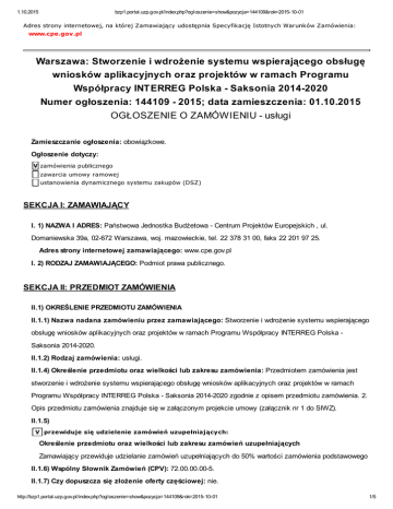1.10.2015 bzp1.portal.uzp.gov.pl/index.php?ogloszenie=show&pozycja=144109&rok=2015-10-01 Adres strony internetowej, na której Zamawiający udostępnia Specyfikację Istotnych Warunków Zamówienia: www.cpe.gov.pl Warszawa: Stworzenie i wdrożenie systemu wspierającego obsługę wniosków aplikacyjnych oraz projektów w ramach Programu Współpracy INTERREG Polska - Saksonia 2014-2020 Numer ogłoszenia: 144109 - 2015; data zamieszczenia: 01.10.2015 OGŁOSZENIE O ZAMÓWIENIU - usługi Zamieszczanie ogłoszenia: obowiązkowe. Ogłoszenie dotyczy: V zamówienia publicznego zawarcia umowy ramowej ustanowienia dynamicznego systemu zakupów (DSZ) SEKCJA I: ZAMAWIAJĄCY I. 1) NAZWA I ADRES: Państwowa Jednostka Budżetowa - Centrum Projektów Europejskich , ul. Domaniewska 39a, 02-672 Warszawa, woj. mazowieckie, tel. 22 378 31 00, faks 22 201 97 25. Adres strony internetowej zamawiającego: www.cpe.gov.pl I. 2) RODZAJ ZAMAWIAJĄCEGO: Podmiot prawa publicznego. SEKCJA II: PRZEDMIOT ZAMÓWIENIA II.1) OKREŚLENIE PRZEDMIOTU ZAMÓWIENIA II.1.1) Nazwa nadana zamówieniu przez zamawiającego: Stworzenie i wdrożenie systemu wspierającego obsługę wniosków aplikacyjnych oraz projektów w ramach Programu Współpracy INTERREG Polska Saksonia 2014-2020. II.1.2) Rodzaj zamówienia: usługi. II.1.4) Określenie przedmiotu oraz wielkości lub zakresu zamówienia: Przedmiotem zamówienia jest stworzenie i wdrożenie systemu wspierającego obsługę wniosków aplikacyjnych oraz projektów w ramach Programu Współpracy INTERREG Polska - Saksonia 2014-2020 zgodnie z opisem przedmiotu zamówienia. 2. Opis przedmiotu zamówienia znajduje się w załączonym projekcie umowy (załącznik nr 1 do SIWZ). II.1.5) V przewiduje się udzielenie zamówień uzupełniających: Określenie przedmiotu oraz wielkości lub zakresu zamówień uzupełniających Zamawiający przewiduje udzielanie zamówień uzupełniających do 50% wartości zamówienia podstawowego II.1.6) Wspólny Słownik Zamówień (CPV): 72.00.00.00-5. II.1.7) Czy dopuszcza się złożenie oferty częściowej: nie. http://bzp1.portal.uzp.gov.pl/index.php?ogloszenie=show&pozycja=144109&rok=2015-10-01 1/5 1.10.2015 bzp1.portal.uzp.gov.pl/index.php?ogloszenie=show&pozycja=144109&rok=2015-10-01 II.1.8) Czy dopuszcza się złożenie oferty wariantowej: nie. II.2) CZAS TRWANIA ZAMÓWIENIA LUB TERMIN WYKONANIA: Zakończenie: 31.12.2017. SEKCJA III: INFORMACJE O CHARAKTERZE PRAWNYM, EKONOMICZNYM, FINANSOWYM I TECHNICZNYM III.2) ZALICZKI III.3) WARUNKI UDZIAŁU W POSTĘPOWANIU ORAZ OPIS SPOSOBU DOKONYWANIA OCENY SPEŁNIANIA TYCH WARUNKÓW III.3.2) Wiedza i doświadczenie Opis sposobu dokonywania oceny spełniania tego warunku Zamawiający uzna warunek za spełniony, jeżeli Wykonawca przedstawi wykaz wykonanych należycie w okresie ostatnich trzech lat, przed upływem terminu składania ofert, a jeżeli okres prowadzenia działalności jest krótszy - w tym okresie, co najmniej 3 usług polegających na zbudowaniu od podstaw systemów informatycznych wspierających rozdysponowanie wśród beneficjentów środków publicznych, w tym co najmniej jednej usługi dla co najmniej 200 użytkowników wykonanej w technologii JAVA ENTERPRICE EDITION (JEE) i MS SQL SERWER lub równoważnej pod względem funkcjonalnym z możliwością pracy interakcyjnej przez przeglądarkę internetową dla użytkowników końcowych nie posiadających specjalistycznej wiedzy wraz z podaniem ich wartości, przedmiotu, dat wykonania i podmiotów, na rzecz których usługi zostały wykonane, oraz załączeniem dowodów, czy zostały wykonane lub są wykonywane należycie. III.3.4) Osoby zdolne do wykonania zamówienia Opis sposobu dokonywania oceny spełniania tego warunku Wykonawca ma dysponować: - min. 2 osobami posiadającymi doświadczenie w czynnym projektowaniu i wdrażaniu przynajmniej 2 systemów informatycznych zbieżnych z przedmiotem zamówienia, przy czym przynajmniej jednej posiadającej certyfikat na poziomie PRINCE2 Foundation lub Project Management Professional lub równoważnym; - min. 1 architektem rozwiązań - posiadającym wyższe wykształcenie informatyczne lub inżynieryjne, doświadczenie przy przynajmniej jednym projekcie związanym z system administracyjnym dokumentacji elektronicznej (przy projekcie związanym z repozytorium dokumentacji elektronicznej); - min. 2 programistami w zespole - posiadającymi doświadczenie w pracy z użyciem technologii wymaganych dla spełnienia kontraktu, minimum jedna osoba w zespole musi posiadać certyfikat lub równoważny dokument potwierdzający umiejętności testowania aplikacji. III.4) INFORMACJA O OŚWIADCZENIACH LUB DOKUMENTACH, JAKIE MAJĄ DOSTARCZYĆ WYKONAWCY W CELU POTWIERDZENIA SPEŁNIANIA WARUNKÓW UDZIAŁU W POSTĘPOWANIU ORAZ NIEPODLEGANIA WYKLUCZENIU NA PODSTAWIE ART. 24 UST. 1 USTAWY III.4.1) W zakresie wykazania spełniania przez wykonawcę warunków, o których mowa w art. 22 ust. http://bzp1.portal.uzp.gov.pl/index.php?ogloszenie=show&pozycja=144109&rok=2015-10-01 2/5 1.10.2015 bzp1.portal.uzp.gov.pl/index.php?ogloszenie=show&pozycja=144109&rok=2015-10-01 1 ustawy, oprócz oświadczenia o spełnianiu warunków udziału w postępowaniu należy przedłożyć: wykaz wykonanych, a w przypadku świadczeń okresowych lub ciągłych również wykonywanych, głównych dostaw lub usług, w okresie ostatnich trzech lat przed upływem terminu składania ofert albo wniosków o dopuszczenie do udziału w postępowaniu, a jeżeli okres prowadzenia działalności jest krótszy - w tym okresie, wraz z podaniem ich wartości, przedmiotu, dat wykonania i podmiotów, na rzecz których dostawy lub usługi zostały wykonane, oraz załączeniem dowodów, czy zostały wykonane lub są wykonywane należycie; wykaz osób, które będą uczestniczyć w wykonywaniu zamówienia, w szczególności odpowiedzialnych za świadczenie usług, kontrolę jakości lub kierowanie robotami budowlanymi, wraz z informacjami na temat ich kwalifikacji 