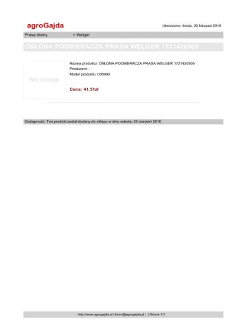 agroGajda Prasa słomy Utworzono: środa, 30 listopad 2016 > Welger OSŁONA PODBIERACZA PRASA WELGER 1721420505 Nazwa produktu: OSŁONA PODBIERACZA PRASA WELGER 1721420505 Producent: Model produktu: 035960 No image Cena: 41.51zł Dostępność: Ten produkt został dodany do sklepu w dniu sobota, 20 sierpień 2016 http://www.agrogajda.pl | [email protected] | | Strona 1/1