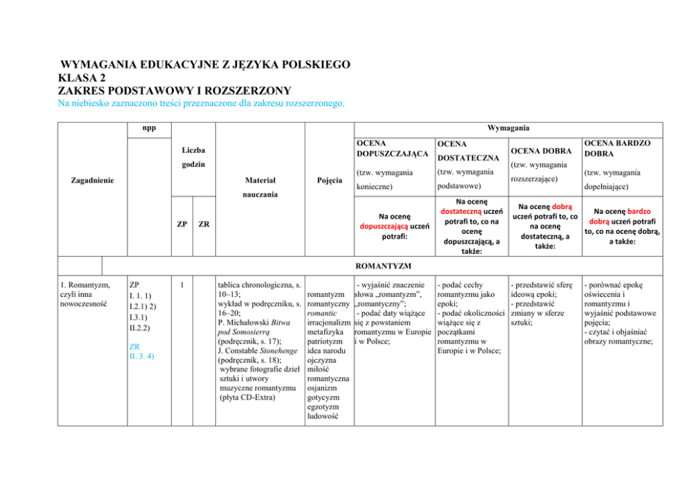 WYMAGANIA EDUKACYJNE Z JĘZYKA POLSKIEGO KLASA 2 ZAKRES PODSTAWOWY I ROZSZERZONY Na niebiesko zaznaczono treści przeznaczone dla zakresu rozszerzonego. npp Wymagania Liczba OCENA DOPUSZCZAJĄCA OCENA (tzw. wymagania (tzw. wymagania konieczne) podstawowe) godzin Materiał Zagadnienie Pojęcia nauczania ZP Na ocenę dopuszczającą uczeń potrafi: ZR DOSTATECZNA Na ocenę dostateczną uczeń potrafi to, co na ocenę dopuszczającą, a także: OCENA DOBRA OCENA BARDZO DOBRA (tzw. wymagania rozszerzające) (tzw. wymagania dopełniające) Na ocenę dobrą Na ocenę bardzo uczeń potrafi to, co dobrą uczeń potrafi na ocenę to, co na ocenę dobrą, dostateczną, a a także: także: ROMANTYZM 1. Romantyzm, czyli inna nowoczesność ZP I. 1. 1) I.2.1) 2) I.3.1) II.2.2) ZR II. 3. 4) 1 tablica chronologiczna, s. 10–13; wykład w podręczniku, s. 16–20; P. Michałowski Bitwa pod Somosierrą (podręcznik, s. 17); J. Constable Stonehenge (podręcznik, s. 18); wybrane fotografie dzieł sztuki i utwory muzyczne romantyzmu (płyta CD-Extra) romantyzm romantyczny romantic irracjonalizm metafizyka patriotyzm idea narodu ojczyzna miłość romantyczna osjanizm gotycyzm egzotyzm ludowość - wyjaśnić znaczenie słowa „romantyzm”, „romantyczny”; - podać daty wiążące się z powstaniem romantyzmu w Europie i w Polsce; - podać cechy romantyzmu jako epoki; - podać okoliczności wiążące się z początkami romantyzmu w Europie i w Polsce; - przedstawić sferę ideową epoki; - przedstawić zmiany w sferze sztuki; - porównać epokę oświecenia i romantyzmu i wyjaśnić podstawowe pojęcia; - czytać i objaśniać obrazy romantyczne; historyzm 2. Skały kredowe na Rugii. Nastrój w malarstwie romantycznym ZP 1 I. 2. 1) 2) S I. 3. 1) II. 1. 1) 2) II. 3. 1) 2) 3) 4) III. 1. 1) 6) C.D. Friedrich Skały kredowe na Rugii (podręcznik, s. 22); wybrane reprodukcje dzieł malarskich, m.in. C.D. Friedricha (płyta CD-Extra, Romantyzm) wzniosłość symbol panteizm - określić własny nastrój związany z obrazem; - nadać obrazowi własny tytuł; - przedstawić kompozycję obrazu; - opisać kolory wody; - wyjaśnić symbolikę żaglowców; - zinterpretować gesty postaci; - wyjaśnić symbolikę morza i powiązać z ideą panteizmu; - omówić nastrój wzniosłości; - zinterpretować obraz w kontekście podanych tytułów; - zredagować tekst interpretujący obraz; - przedstawić historiozofię na podstawie pierwszych akapitów tekstu Hegla; - wskazać związek myśli historiozoficznej Hegla z ideami oświecenia; - przypomnieć historiozofię św. Augustyna; - wyjaśnić symboliczny sens kiełka drzewa; - powiedzieć, kim jest Duch według Hegla; - wymienić etapy postępu wolności w dziejach; - określić kierunek i cel rozwoju dziejów; - opisać los wielkich ludzi; - przypomnieć średniowieczny spór o uniwersalia i porównać z filozofią Hegla; - scharakteryzować etapy postępu wolności w dziejach; - opisać poziom wolności ludzi w każdej z epok; - wyjaśnić rolę wybitnych jednostek w wizji Hegla; - zredagować tekst interpretujący wydarzenie w świetle myśli historiozoficznej Hegla; - właściwie dobrać argumenty; - określić Heglowskiego Ducha w świetle sporu średniowiecznego i uzasadnić swoje zdanie; - przedstawić przestrzeń - znaleźć odwołania mitologiczne i określić ZR II. 3. 4) ZP I. 1. 1) Ducha. Filozofia epoki romantyzmu I. 2. 1) 2) I. 3. 1) II. 1. 1) 2) II. 2. 2) II. 3. 1) 2) 3) II. 4. 2) III. 1. 1) 3) III. 2. 1) 3. W dziedzinie 1 ZR II. 3. 1) 2) III. 1. 1) 2) 4. Wszyscy ludzie będą braćmi… ZP I. 1. 1) 4) 1 wykład w podręczniku, s. 24–25; G.W.F. Hegel Wykłady z filozofii dziejów (podręcznik, s. 25–27); J. Alaux Nagrobek Napoleona na wyspie św. Heleny (podręcznik, s. 26); J.-L. David Napoleon na Przełęczy Świętego Bernarda (płyta CDExtra, Romantyzm) F. Schiller Do Radości (podręcznik, s. 34–35); przestrzeń wertykalna - wymienić najważniejsze różnice między myślami św. Augustyna i Hegla; - przedstawić ogólną - omówić nastrój tematykę wiersza; wiersza; Hymn zjednoczonej Europy I. 2. 1) II. 1. 1) 2) 3) II. 2. 1) 2) II. 3. 2) 3) II. 4. 2) III. 2. 1) J.-B. Carpeaux Taniec (podręcznik, s. 35); L. van Beethoven Oda do Radości, Sonata „Księżycowa”; H. Berlioz Symfonia fantastyczna (płyta CDExtra) przestrzeń kosmiczna wykład w podręczniku, s. 28–29; A. Mickiewicz Oda do młodości (podręcznik, s. 29–31); A. Canova Hebe (podręcznik, s. 31) oda przestrzeń kosmiczna stosowność (decorum) oksymoron hiperbola paralelizm składniowy - wskazać w utworze wertykalną; ich funkcję; cechy ody; - określić wybór - wyodrębnić cechy gatunku przez poetę; oświeceniowe i romantyczne; ZR II. 3. 4) 5. Jednością silni, rozumni szałem… Pierwiastki klasyczne i romantyczne w Odzie do młodości ZP I. 1. 1) 3) 4) I. 2. 1) II. 1. 1) 2) 3) II. 2. 1) 2) 3) 5) III. 2. 1) 1 - przedstawić wczesną biografię Mickiewicza; - wyjaśnić postrzeganie świata i ludzi przez poetę; ZR II. 2. 3) 5) II. 3. 1) 2) 4) II. 4. 3) III. 1. 1) 2) 6. Miej serce i patrzaj w serce… I. 1. 1) I. 2. 1) 2) 2 wykład w podręczniku, s. ballada - podać genezę ballad 38; irracjonalizm Mickiewicza; - podać genezę Ody do młodości; - scharakteryzować przestrzeń ukazaną w wierszu; - określić świat wartości poety; - wskazać paralelizmy składniowe i określić ich funkcję; - wyjaśnić sposób łamania zasady decorum; - zinterpretować znaczenie oksymoronu i hiperboli; - określić znaczenie apeli do czytelnika; - przedstawić elementy estetyki oraz ideologii oświeceniowej i romantycznej; - wyjaśnić sens nawiązania do mitologii i do Biblii; - wyjaśnić sens nawiązań i ich związek z tematem młodości; - przedstawić różnice między „młodymi” a „starymi”; - odnieść wartości z Ody do współczesnego pokolenia; - porównać postawę „młodego” z wiersza Mickiewicza i powieści Goethego; - porównać poetycką i rzeźb