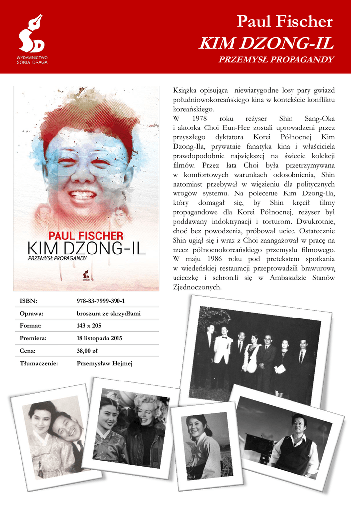 Paul Fischer KIM DZONG-IL PRZEMYSŁ PROPAGANDY Książka opisująca niewiarygodne losy pary gwiazd południowokoreańskiego kina w kontekście konfliktu koreańskiego. W 1978 roku reżyser Shin Sang-Oka i aktorka Choi Eun-Hee zostali uprowadzeni przez przyszłego dyktatora Korei Północnej Kim Dzong-Ila, prywatnie fanatyka kina i właściciela prawdopodobnie największej na świecie kolekcji filmów. Przez lata Choi była przetrzymywana w komfortowych warunkach odosobnienia, Shin natomiast przebywał w więzieniu dla politycznych wrogów systemu. Na polecenie Kim Dzong-Ila, który domagał się, by Shin kręcił filmy propagandowe dla Korei Północnej, reżyser był poddawany indoktrynacji i torturom. Dwukrotnie, choć bez powodzenia, próbował uciec. Ostatecznie Shin ugiął się i wraz z Choi zaangażował w pracę na rzecz północnokoreańskiego przemysłu filmowego. W maju 1986 roku pod pretekstem spotkania w wiedeńskiej restauracji przeprowadzili brawurową ucieczkę i schronili się w Ambasadzie Stanów Zjednoczonych. ISBN: 978-83-7999-390-1 Oprawa: broszura ze skrzydłami Format: 143 x 205 Premiera: 18 listopada 2015 Cena: 38,00 zł Tłumaczenie: Przemysław Hejmej Opinie o książce: „Kim Dzong-Il. Przemysł propagandy to prawdziwa historia o doprowadzonych na krawędź desperacji gwiazdach filmowych, o odważnej ucieczce i o paranoicznym przywódcy Korei Północnej. Książka łączy cechy powieści historycznej, thrillera i farsy. Mistrzowsko opowiedziana, absorbująca do samego końca”. – Matt Baglio, współautor bestsellerowej książki Argo „Autentyczna historia o mocy thrillera. Książka rzucająca światło na filmową obsesję Kima i kinematograficzny wyścig zbrojeń obu Korei”. – TheWashington Post „Niesamowita. Kim Dzong-Il. Przemysł propagandy opowiada absurdalną, wstrząsającą i prawdziwą historię męczarni Choi i Shina i jednocześnie ujawnia znaczenie filmu jako narzędzia propagandy dla północnokoreańskiego reżimu”. – Esquire „Ekscytująca jak thriller. Znakomity sposób, żeby poznać Koreę Północną i jej prawdziwie surrealistyczny naród, w którym społeczeństwo to aktorzy grający w horrorze życia”. – Herald (Szkocja) „Znakomita, oparta na faktach, wstrząsająca niczym thriller. Północna Korea przedstawiona niczym ekipa filmowa zmuszona do realizacji szalonego scenariusza socjopatycznego tyrana”. – Publishers’ Weekly „Dokładnie zbadana, absorbująca kronika szokującego porwania pary znanych południowokoreańskich twórców filmowych przez nikczemną bandę północnokoreańskiego Kim Dzong-Ila”. – Kirkus Reviews „Paul Fischer w fascynujący sposób opowiada zdumiewającą historię z najdziwniejszego kraju świata”. – Paul French, autor bestsellerowej książki Północ w Pekinie „Fischer łączy przenikliwą filmową analizę z przekonującą i żywą historią dwóch powojennych Korei. Porywająca i szokująca oparta na prawdziwych wydarzeniach książka wprowadza w świat szalonej tyranii Korei Północnej”. – Booklist „Pasjonująca. Gdy zostanie zekranizowana, będzie to najlepsza produkcja, do której powstania przyczynił się biedny stary Kim Dzong-Il”. – The Times Paul Fischer urodził się w Arabii Saudyjskiej, wychował we Francji. Studiował socjologię w Institut d’Etudes Politiques w Paryżu, uczył się również w szkołach filmowych w Kalifornii i Nowym Jorku. Od paru lat pracuje w Londynie jako niezależny producent filmowy. Jego debiutancki film dokumentalny Radioman został wyróżniony licznymi nagrodami branżowymi i zdobył uznanie zarówno krytyków, jak i publiczności. Pisze teksty na temat kina m.in. dla „Gorilla Magazine”, „Vertigo Magazine” oraz JoBlo.com. Kim Dzong-Il. Przemysł propagandy to jego debiut książkowy. Sonia Draga Sp. z o.o., Pl. Grunwaldzki 8-10, 40-127 Katowice, Tel.: 327826477, 7826037, Fax: 032/ 2537728 Dział handlowy: Danuta Czarnowska, 693420384, [email protected] Promocja: Agnieszka Jedlińska, 695672067, [email protected] Redakcja: [email protected]