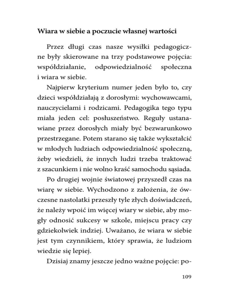 Wiara w siebie a poczucie własnej wartości Przez długi czas nasze wysiłki pedagogiczne były skierowane na trzy podstawowe pojęcia: współdziałanie, odpowiedzialność społeczna i wiara w siebie. Najpierw kryterium numer jeden było to, czy dzieci współdziałają z dorosłymi: wychowawcami, nauczycielami i rodzicami. Pedagogika tego typu miała jeden cel: posłuszeństwo. Reguły ustanawiane przez dorosłych miały być bezwarunkowo przestrzegane. Potem starano się także wykształcić w młodych ludziach odpowiedzialność społeczną, żeby wiedzieli, że innych ludzi trzeba traktować z szacunkiem i nie wolno kraść samochodu sąsiada. Po drugiej wojnie światowej przyszedł czas na wiarę w siebie. Wychodzono z założenia, że ówczesne nastolatki przeszły tyle złych doświadczeń, że należy wpoić im więcej wiary w siebie, aby mogły odnosić sukcesy w szkole, miejscu pracy czy gdziekolwiek indziej. Uważano, że wiara w siebie jest tym czynnikiem, który sprawia, że ludziom wiedzie się lepiej. Dzisiaj znamy jeszcze jedno ważne pojęcie: po109 czucie własnej wartości. Chciałbym je teraz nieco obszerniej wyjaśnić. Jego znajomość ma w ostatnim czasie duży wpływ na to, jak rodzice i nauczyciele podchodzą do dzieci i młodzieży. Po czucie własnej war toś ci, nazywane też czasem samooceną, odnosi się do tego, kim jestem. Dec yduje o nim to, jak dobrze siebie znam i c z y ro z u m i e m w ł a s n e u c z u c i a i p o s t ę p ow an i e . Wi ar a w s i e bi e, n a z y w an a te ż c z a sem pewnością siebie, odnosi się do tego, co p otraf ię. Z ależy o d moich umiejętnoś ci, o d tego, jak dobr y jestem w różnych dziedzinach życia. Oba pojęcia są często mylone. Kiedyś mówiliśmy o wierze w siebie, nie bardzo wiedząc, co mamy na myśli. Dzisiaj zdaje mi się, że częściej mówimy o poczuciu własnej wartości, ale tak samo nie bardzo wiemy, co za tym stoi. W poczuciu własnej wartości chodzi o moje 110 istnienie i mój stosunek do niego. To relatywnie nowe pojęcie, które powstało, kiedy zrozumieliśmy, że własne ,,Ja’’ dziecka lub dorosłego człowieka ma wielkie znaczenie dla jakości jego życia. Wcześniej niewiele mówiono o ,,Ja’’ w pedagogice. W wypadku dzieci w ogóle nie było tematu, ponieważ uważano, że ich zadaniem jest dostosowywać się i być posłusznym (a więc stłumić swoje ,,Ja’’). Dlatego pracowano nad ich wiarą w siebie, ale nie nad poczuciem własnej wartości. Jeśli chodzi o wiarę w siebie, to jest ona związana i ograniczona do określonych umiejętności. Na przykład, mogę wierzyć w siebie jako dobry piłkarz, utalentowany muzyk, świetny kucharz albo godny zaufania przyjaciel. Ale z doświadczenia wiemy, że wiara w siebie nie jest lekarstwem na wszystko. Wielu nastolatkom nie pomaga być zadowolonym z życia, mimo że intensywnie pracują nad jej wzmacnianiem. To dlatego, że brak im wewnętrznego przekonania, że są porządnymi, dobrymi ludźmi – brakuje im poczucia własnej wartości. Jest to pewność, że znam i rozumiem samego siebie. 111 Po czucie własnej wartości skła- da się z tego, co o s obie wiem, oraz z tego, co o s obie myślę. Z drowe poczucie własnej wartości oznacza, że jestem w stanie myśleć o sobie w s p o s ó b o b i e k t y w n y, p e ł e n n i u a n s ó w i a k c e p t u j ą c y. Poczucie własnej wartości składa się więc z dwóch wymiarów: ilościowego, czyli tego, ile o sobie wiem i jak dobrze siebie znam; oraz jakościowego, czyli mojego stosunku do tego, co o sobie wiem, a zatem jak traktuję siebie samego i co o sobie myślę. Inaczej niż przy pewności siebie, która zależy od moich najlepszych umiejętności i osiągnięć. Wyobraźmy sobie dziecko, które nie potrafi wspiąć się na drzewo. Od tego, jak rozwinięte jest jego poczucie własnej wartości, będzie zależało to, co o sobie wtedy pomyśli. Może być tym faktem po prostu rozczarowane albo wręcz uznać się za nieudacznika. Dla naszego życia ma to decydujące znaczenie, czy w takich sytuacjach jesteśmy tylko rozczarowani, czy też wstydzimy się i czujemy jak zero. Zdrowe poczucie własnej wartości 112 ma to do siebie, że człowiek patrzy na siebie bez złudzeń, ale w sposób akceptujący. Chwaląc dzieci ,,Jesteś dzielny! Brawo! Świetnie ci idzie!’’, nie rozwiniemy w nich poczucia własnej wartości. Pochwały odnoszą się do osiągnięć i wzmacniają jedynie wiarę w siebie. Jeśli chcemy pomóc dzieciom i młodzieży rozwinąć zdrowe poczucie własnej wartości, musimy wyrażać swoje uznanie dla tego, kim są. Patrzymy na młodego człowieka i mówimy: ,,Widzę, że to zajęcie sprawia ci radość’’ albo ,,O, wydajesz się bardzo zdenerwowany. Chyba masz jakieś trudności w szkole’’. W ten sposób wyrażamy nasze spostrzeżenia na temat tego, co dzieje się w dziecku. Na przykład, kiedy jakiś maluch stoi na zjeżdżalni i krzyczy: ,,Mamo, patrz!’’, wtedy wystarczy po prostu zauważyć jego radość i uśmiechnąć się: ,,Tak, widzę cię. Wygląda na to, że dobrze się bawisz’’. Albo w innym wypadku: ,,O, widzę, że jesteś smutna. Chętnie dowiedziałabym się, co cię tak zasmuciło. Możesz mi powiedzieć?’’. Dzięki takim słowom młodzi ludzie czują się zauważeni i otrzymują wyraz swojej wewnętrznej rzeczywistości pozbawiony ocen. Mogą wtedy rozwinąć poczu113 cie samych siebie, swojego ,,Ja’’. Dzieci traktują siebie tak, jak my j e t r a k t u j e m y. J e ś l i p o w a ż n i e p o d cho dzimy do tego, co przeży wają, to same też będą traktowały siebie poważnie. A jeśli do tego będziemy jeszcze otwarcie wyrażać swoją radość, że są częścią naszego życia, doświadczą wtedy namacalnie, że ich istnienie ma dla nas większą wartość niż ich osiągnięcia. Kr ytyka hamuje rozwój zdrowego poczucia własnej wartości u dzieci. Z aczynają się wtedy wstydzić tego, kim są. Czują, ż