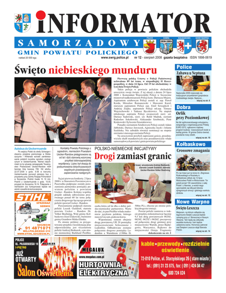 I NFORMATOR S A M O R Z Ą D O W Y POLICE DOBRA KOŁBASKOWO NOWE WARPNO GMIN POWIATU POLICKIEGO www.swrg.police.pl nakład 20 000 egz. nr 12 - sierpień 2008 gazeta bezpłatna ISSN 1898-0619 Święto niebieskiego munduru Pierwszą polską Ustawę o Policji Państwowej uchwalono 89 lat temu, w niepodległej II Rzeczpospolitej, w dniu 24 lipca. Od 19 lat obchodzimy w tym dniu Święto Policji. Także policja w powiecie polickim obchodziła uroczyście swoje święto. Z tej okazji z dniem 24 lipca 2008 r. Komendant Wojewódzki Policji w Szczecinie mianował nadkomisarzem Policji kom. Dariusza Mejera. Aspirantem sztabowym Policji zostali st. asp. Paweł Korda, Mirosław Romanowski i Sławomir Karol, starszym aspirantem Policji asp. Emil Szwajdych i Andrzej Ziajko, aspirantem Policji mł.asp. Tomasz Wojciechowski i Tadeusz Byczkiewicz. Na stopień młodszego aspiranta Policji awansowali sierż. szt. Dariusz Sadowski, sierż. szt. Rafał Madrak, sierżant Radosław Sokołowski, Aleksander Sztobnicki, Piotr Krukowski i Sylwester Szustakiewicz. Ponadto sierżantem Sztabowym Policji zostali Adam Jabłoński, Dariusz Jawoszek, Agnieszka Jacek i Jolanta Szalińska. Nie zabrakło również nominacji na stopnie sierżanta i starszego sierżanta Policji. Na uroczystość przybyli zaproszeni goście, przedstawiciela służb mundurowych oraz przedstawiciele władz samorządowych powiatu i gmin powiatu polickiego Autobus do Ueckermuende Po wejściu Polski do strefy Schengen i otwarciu przejścia granicznego w Dobieszczynie / Hintersee wzrosło zainteresowanie polskich turystów ogrodem zoologicznym w Ueckermuende. Niemal natychmiast na tę sytuację zareagowało Towarzystwo Przewozowe Uecker-Randow mbH tworząc linię busową 706. Od wtorku, 22.07.2008 o godz. 8.58 w kierunku Ueckermuende wyruszył pierwszy bus z przystanku przy Zamku Książąt Pomorskich w Szczecinie. Podróż trwała 1h 10 min. Powrót z Ueckermuende o godz. 15.05, przyjazd do Szczecina 16.14. Połączenie z niemieckim zoo funkcjonować będzie we wtorki i czwartki do końca sierpnia. Kontakty Powiatu Polickiego z sąsiednim, niemieckim Powiatem Uecker-Randow pielęgnowane są od lat i dziś stanowią wzorcowy przykład dobrosąsiedzkiej współpracy. Lipiec był okazją do podsumowania dotychczasowych wspólnych przedsięwzięć i zaplanowania następnych. Są już pierwsze konkrety. 2 lipca 2008 r. w Starostwie Powiatowym w Pasewalku podpisane zostało porozumienie partnerskie pomiędzy powiatem polickim a powiatem Uecker - Randow. Kolejny wspólny projekt zakłada odtworzenie przerwanego ponad 60 lat temu połączenia drogowego łączącego powiat policki i powiat Uecker - Randow. Porozumienie podpisali starosta policki Leszek Guździoł, starosta powiatu Uecker - Randow Dr. Volker Boehning, Wójt gminy Kołbaskowo Józef Żukowski, burmistrz gminy Grambow Mirko Ehmke. Po stronie polskiej za przygotowanie projektu i koordynację prac odpowiedzialny jest wicestarosta policki Andrzej Bednarek, a po stronie niemieckiej Burkhard Preißler, POLSKO-NIEMIECKIE INICJATYWY Drogi zamiast granic Police Zabawa u Neptuna Neptunalia 2008 rozpoczęły się tradycyjnym przywitaniem gospodarza trzebieskiego święta- Neptuna… więcej na str. 6 Dobra Orlik przy Poziomkowej Na fali ogólnonarodowego entuzjazmu, związanego z organizacją przez Polskę EURO 2012, ogłoszono rządowy program budowy nowoczesnych boisk w każdej gminie. W gminie Dobra również powstanie nowy obiekt. więcej na str. 10 Kołbaskowo Crossowe zmagania Od lewej: wicestarosta Andrzej Bednarek, starosta Leszek Guździoł, starosta Uecker-Randow Volker Boehning Po raz trzeci już na torze im. Zbigniewa Rutkowskiego w Rosówku k. Kołbaskowa odbyły się 12 lipca Mistrzostwa Polski w Motocrossie. Tor gościł ponad 100 zawodników z całej Polski i z Niemiec, a wokół niego zgromadziło się kilkuset kibiców spragnionych emocji i głośnego warkotu silników. więcej na str. 12 Nowe Warpno osoba która od lat dba o dobre polsko-niemieckie partnerstwo. Warto do-dać, że pan Preißler włada znakomicie językiem polskim, którego nauczył się sam, podczas kursu. Wspomniany remont obejmie drogę powiatową UR 20 pomiędzy miejscowościami Schwennenz i Ladenthin. Odbudowane zostanie połączenie drogowe pomiędzy Ladenthin a Warnikiem (1300m D, 500m PL), obecnie po stronie polskiej droga nie istnieje. Powiat policki zamierza w trakcie projektu zrekonstruować łącznie 9,5 km dróg powiatowych 0620Z, 0624Z, 0625Z i 0626Z, począwszy od połączenia drogi gminnej przy miejscowości Warnik, przez Będargowo, Warzymice, Rajkowo do miejscowości Ostoja. Fragmenty dokończenie na str. 2 Święto Leszcza Miejscem, na którym odbędzie się tegoroczne Święto Leszcza będzie camping przy ul. Słonecznej w Nowym Warpnie. Tam będą się odbywały wszelkie konkursy i tam będzie ustawiona scena. Honorowy patronat nad Świętem Leszcza objął Starosta Policki. więcej na str. 14 POWIAT POLICKI str. 2 POWIAT LIDEREM PROJEKTU Hala coraz bliżej W Policach w ciągu 2 lat ma powstać nowa hala widowiskowosportowa przy Zespole Szkół im. Ignacego Łukasiewicza w Policach Pomieści około tysiąca widzów i będzie przystosowana do rozgrywek o charakterze międzynarodowym. POWIAT POLICKI Starostwo Powiatowe w Policach ul. Tanowska 8, 72-010 Police tel. 0 91 4328 100, fax 0 91 3178 900 e-mail: [email protected] www.powiat.policki.pl Zarząd Powiatu Starosta - Leszek Guździoł Wicestarosta - Andrzej Bednarek Członek Zarządu - Cezary Atamańczuk Jednostki organizacyjne powiatu Powiatowe Centrum Pomocy Rodzinie w Policach Dyrektor Beata Karlińska ul. Tanowska 8, 72-010 Police tel. 42 40 700, tel. 42 40 699 e-mail: [email protected] www.pcpr.police.pl Powiatowy Urząd Pracy w Policach Dyrektor Jan Sławczyński ul. Kościuszki 5, 72-010 Police tel. 424 08 60 lub 424 08 59, fax 317 66 81 e-mail: [email protected] www.pup.policki.pl Zespół Szkół im. Ignacego Łukasiewicza w Policach Dyrek