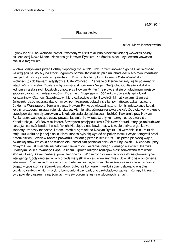 Pobrano z portalu Mapa Kultury 20.01.2011 Plac na słodko ____________________________ autor: Marta Konarzewska Słynny łódzki Plac Wolności został utworzony w 1823 roku jako rynek zakładanej wówczas osady sukienniczej Nowe Miasto. Nazwano go Nowym Rynkiem. Na środku placu usytuowano wówczas miejskie targowisko. W chwili odzyskania przez Polskę niepodległości w 1918 roku przemianowano go na Plac Wolności. Ze względu na stojący na środku ogromny pomnik Kościuszki plac ma charakter nieco monumentalny. Jest jednak także przestrzenią słodkości. Dziś zachodzimy tu do kawiarni Cafe Wiedeńska (pl. Wolności 6) i do kawiarni artystycznej Cafe Wolność. Pierwsze cukiernie zaczęły się tu pojawiać w latach 40. XIX wieku. Pionierem był szwajcarski cukiernik Vogeli. Swój lokal Confiserie założył w jednym z najstarszych łódzkich domów przy Nowym Rynku 4. Szybko stał się on ulubionym miejscem spotkań okolicznych mieszkańców. Po śmierci Vogelego w 1857 roku wdowa odstąpiła lokal kaliszaninowi Ottonowi Szwetyszowi, który całkowicie zmienił wystrój i klimat kawiarni. Zamiast świeczek, słabo rozpraszających mroki pomieszczeń, pojawiły się lampy naftowe. Lokal nazwano Cukiernią Warszawską. Kawiarnię przy Nowym Rynku odwiedzali najznamienitsi mieszkańcy Łodzi: kolejni prezydenci miasta, rejenci, lekarze. Ale nie tylko „śmietanka towarzyska”. Co ciekawe, w okresie przed powstaniem styczniowym w lokalu zbierała się spiskująca młodzież. Kawiarnia przy Nowym Rynku przetrwała gorące czasy powstania, zmieniła w zasadzie tylko nazwę - odtąd zwała się Konditorskaja. W1886 roku interes Szwetysza przejął cukiernik Zdzisław Konrad, który go rozbudował i urządził na wzór kawiarni wiedeńskich. Na piętrze nad kawiarnią, w tzw. cielętniku, organizował koncerty i zabawy taneczne. Latem urządzał ogródek na Nowym Rynku. Od września 1901 roku do maja 1903 roku do jednej z sal cukierni można było się wybrać na pokaz teatru żywych fotografii braci Krzemińskich. Zdzisław Konrad prowadził kawiarnię przez blisko 27 lat. Tuż przed pierwszą wojną światową znów zmieniła ona właściciela - został nim pabianiczanin Józef Piątkowski. Nieopodal, przy Nowym Rynku 8 mieściła się natomiast kawiarnio-cukierenka innego słynnego w Łodzi cukiernika Fryderyka Sellina, zwanego Papą Sellinem. Oprócz różnych rodzajów ciast serwowano tam wódki słodkie i likiery, kawę, herbatę, piwo i lemoniady. W dawnych cukierniach toczyło się głównie życie inteligencji. Spotykano się w nich przede wszystkim w celu wymiany myśli lub – jak dziś – omówienia interesów. Ówczesne lokale urządzano elegancko i wytwornie. Najważniejsze miejsce w zajmował bogato wyposażony srebrno-kryształowy bufet. Za kontuarem wzdłuż ścian ustawiano wysokie oszklone szafy, a w nich – piękne bombonierki czy ozdobne czekoladowe cacka. Kanapy i krzesła były pokryte pluszem, a na ścianach wisiały ogromne lustra w złoconych ramach. strona 1 / 1