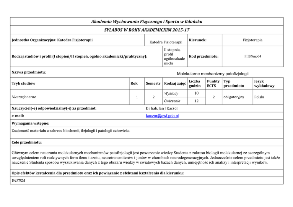 Akademia Wychowania Fizycznego i Sportu w Gdańsku SYLABUS W ROKU AKADEMICKIM 2015-17 Jednostka Organizacyjna: Katedra Fizjoterapii Katedra Fizjoterapii Kierunek: Fizjoterapia II stopnia, profil Kod przedmiotu: ogólnoakade micki Rodzaj studiów i profil (I stopień/II stopień, ogólno akademicki/praktyczny): Nazwa przedmiotu: FIISNmo04 Molekularne mechanizmy patofizjologii Tryb studiów Rok Niestacjonarne 1 Semestr Rodzaj zajęć 2 Liczba godzin Wykłady 10 Ćwiczenia 12 Nauczyciel(-e) odpowiedzialny(-i) za przedmiot: Dr hab. Jan J Kaczor e-mail: [email protected] Punkty ECTS Typ przedmiotu Język wykładowy 2 obligatoryjny Polski Wymagania wstępne: Znajomość materiału z zakresu biochemii, fizjologii i patologii człowieka. Cele przedmiotu: Głównym celem nauczania molekularnych mechanizmów patofizjologii jest poszerzenie wiedzy Studenta z zakresu biologii molekularnej ze szczególnym uwzględnieniem roli reaktywnych form tlenu i azotu, neurotransmiterów i jonów w chorobach neurodegeneracyjnych. Jednocześnie celem przedmiotu jest także nauczenie Studenta sposobu wyszukiwania danych z tego obszaru wiedzy w światowych bazach danych, umiejętność ich analizy i interpretacji wyników. Opis efektów kształcenia dla przedmiotu oraz ich powiązanie z efektami kształcenia dla kierunku: WIEDZA W1 Zna objawy i potrafi interpretować zmiany patologiczne występujące w różnych schorzeniach oraz zaburzeniach strukturalnych wywołanych chorobą neurodegeneracyjną dla potrzeb diagnostyki funkcjonalnej, poprzez zastosowanie wiedzy z zakresu biologii molekularnej. K_W07 W2 Rozumie zasady funkcjonowania aparatury do diagnostyki funkcjonalnej stosowanej dla potrzeb fizjoterapii stosownej, ze szczególnym uwzględnieniem wiedzy na temat aparatury laboratoryjnej wykorzystywanej w badaniach biochemicznych. K_W16 W3 Posiada wiedzę w zakresie doboru różnych form aktywności ruchowej adaptacyjnej w rehabilitacji kompleksowej i podtrzymywaniu sprawności osób z różnymi dysfunkcjami, ze szczególnym uwzględnieniem K_W15 chorób neurodegeneracyjnych. UMIEJĘTNOŚCI U1 Potrafi posługiwać się zaawansowanym technicznie sprzętem stosowanym w wykonaniu badań diagnostyczno-pomiarowych wykorzystywanych przy oznaczeniach atrofii mięśnia szkieletowego. K_U03 U2 Potrafi analizować wyniki oraz ocenić przydatność różnych badań aparaturowych dla doboru środków fizjoterapii oraz kontroli wyników jako środka diagnostycznego przy chorobach neurodegeneracyjnych. K_U04 U3 Potrafi przeprowadzić rozpoznanie różnicowe w oparciu o analizę danych z badań biologii molekularnej dla potrzeb fizjoterapii oraz interpretować wyniki tych badań dla potrzeb fizjoterapii K_U07 U4 Potrafi krytycznie interpretować informacje z piśmiennictwa oraz wyciągać wnioski z badań naukowych z K_U15 publikacji naukowych w tematyce patofizjologii mięśnia szkieletowego. KOMPETENCJE K1 Potrafi inicjować prace badawcze w zespole oraz organizować proces uczenia się w trakcie zajęć K_K01 laboratoryjnych. K2 Potrafi formułować opinie dotyczące różnorodnych aspektów działalności fizjoterapeutycznej na podstawie wiedzy i doświadczeń z zakresu biologii molekularnej. K_K09 Kryteria i metody oceny osiągniętych efektów kształcenia: 1. Obecność na ćwiczeniach nie mniej niż 80%, 2. Sporządzenie protokołu po każdych zajęciach laboratoryjnych, 3. Przygotowanie prezentacji na podstawie publikacji naukowej z piśmiennictwa światowego dotyczącej tematyki wykładów, 4. Pisemny test sprawdzający, opisowy, z materiału omawianego na ćwiczeniach (na ocenę dostateczną należy uzyskać 60% ), 5. Pisemny egzamin z zakresu tematyki wykładów. Aby uzyskać zaliczenie przedmiotu na ocenę dostateczną student musi osiągnąć wszystkie wymienione przedmiotowe efekty kształcenia Metody i formy realizacji przedmiotu: Wykłady: wykład z prezentacją multimedialną Ćwiczenia: ćwiczenia laboratoryjne - wykonywanie doświadczeń, ćwiczenia audytoryjne- analiza tekstów z dyskusją Treści kształcenia: Wykłady: (5 razy 2 godz.) 1. Budowa i funkcja mięśnia szkieletowego. Wprowadzenie do tematyki neurodegeneracja czyli postępujący proces zwyrodnienia neuronów leżący u podstaw wielu chorób układu nerwowego, które prowadzą do obumierania neuronów . Zapoznanie z tematyką atrofia, apoptoza, autofagia i nekroza w obrębie mięśnia szkieletowego w chorobowych neurodegeneracyjnych. 2. Stwardnienie zanikowe boczne (ALS) i stwardnienie rozsiane (MS) - etiologia, charakterystyka, przebieg kliniczny i konsekwencje choroby. 3. Dystrofia mięśniowa -etiologia, charakterystyka, przebieg kliniczny i konsekwencje choroby. 4. Choroba Parkinsona i Alzheimer -etiologia, charakterystyka, przebieg kliniczny i konsekwencje choroby. 5. Pozostałe jednostki chorobowe takie jak: choroba Pompego, McArdle’a, Huntingtona i inne. Ćwiczenia (4 spotkania, 2x2 i 2x3 godz.): 1. Wprowadzenie: a.a. Omówienie podstawowych metod a.b. Omówienie i przeliczanie stężeń procentowych i molowych a.c. Przygotowanie naważek do metody oznaczenia białka całkowitego metodą Lowry’ego 2. Wyznaczenie krzywej standardowej dla ilości białka i odczyty w materiale biologicznym 3. Wyznaczenie krzywej standardowej dla ilości grup sulfhydrylowych (-SH) i odczyty w materiale biologicznym 4. Wyznaczenie krzywej standardowej dla ilości dialdehydu malonowego (MDA) i odczyty w materiale biologicznym, prezentowanie i omawianie opracowanych publikacji z piśmiennictwa światowego. Forma zaliczenia: Egzamin pisemny z oceną Literatura: Podstawowa: 1. Bartosz G. Druga Twarz Tlenu. Warszawa: Wydawnictwo Naukowe PWN, 2006. 2. Radak Z. Free radicals in exercise and aging. Champaign, USA: Human Kinetics, 2000. 3. Zdebel M, Immunocytochemia. Warszawa: Wydawnictwo Naukowe PWN, 1999. 4. Murray R.K., Granner D.K., Mayes P.A., Rodwell V.W. Biochemia Harpera. Warszawa: Wydawnictwo Lekarskie PZWL, 1995 lub 2006. 5. Angielski S., Rogulski J. Bio