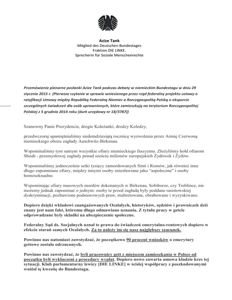 Azize Tank Mitglied des Deutschen Bundestages Fraktion DIE LINKE. Sprecherin für Soziale Menschenrechte Przemówienie plenarne posłanki Azize Tank podczas debaty w niemieckim Bundestagu w dniu 29 stycznia 2015 r. (Pierwsze czytanie w sprawie wniesionego przez rząd federalny projektu ustawy o ratyfikacji Umowy między Republiką Federalną Niemiec a Rzecząpospolitą Polską o eksporcie szczególnych świadczeń dla osób uprawnionych, które zamieszkują na terytorium Rzeczypospolitej Polskiej z 5 grudnia 2014 roku (durk urzędowy nr 18/3787)) Szanowny Panie Prezydencie, drogie Koleżanki, drodzy Koledzy, przedwczoraj upamiętnialiśmy siedemdziesiątą rocznicę wyzwolenia przez Armię Czerwoną niemieckiego obozu zagłady Auschwitz-Birkenau. Wspominaliśmy tym samym wszystkie ofiary niemieckiego faszyzmu. Złożyliśmy hołd ofiarom Shoah - przemysłowej zagłady ponad sześciu milionów europejskich Żydówek i Żydów. Wspominaliśmy jednocześnie setki tysięcy zamordowanych Sinti i Romów, jak również inne długo zapomniane ofiary, między innymi osoby zniesławiane jako “aspołeczne” i osoby homoseksualne. Wspominając ofiary masowych mordów dokonanych w Birkenau, Sobiborze, czy Treblince, nie możemy jednak zapominać o jednym: osoby te przed zagładą były poddane rasistowskiej dyskryminacji, pozbawione podstawowych praw, maltretowane, obrabowane i wyzyskiwane. Dopiero dzięki wkładowi zaangażowanych Ocalałych, historyków, sędziów i prawniczek dziś znany jest nam fakt, któremu długo odmawiano uznania. Z tytułu pracy w getcie odprowadzane były składki na ubezpieczenie społeczne. Federalny Sąd ds. Socjalnych uznał te prawa do świadczeń emerytalno-rentowych dopiero w efekcie starań samych Ocalałych. Za to należy im się nasz najgłębszy szacunek. Powinno nas natomiast zawstydzać, że początkowo 90 procent wniosków o emerytury gettowe zostało odrzuconych. Powinno nas zawstydzać, że byli pracownicy gett z miejscem zamieszkania w Polsce od początku byli wykluczeni z procedury wypłat. Dopiero nowo zawarta umowa kładzie kres tej sytuacji. Klub parlamentarny lewicy [DIE LINKE] w ścisłej współpracy z poszkodowanymi wniósł tę kwestię do Bundestagu. Seite 2 Pozwólcie mi Państwo zacytować słowa pana Tomasza Miedzińskiego z Warszawy. Pan Miedziński jako przewodniczący Stowarzyszenia Żydów Kombatantów i Poszkodowanych w II Wojnie Światowej ponad dziesięć lat walczył o prawa byłych pracowników gett z Polski. Wsparcia w tych staraniach udzielał mu pan Marian Kalwary, wice-przewodniczący Stowarzyszenia "Dzieci Holocaustu" w Polsce. 5 grudnia 2014 roku, w dniu podpisania w Warszawie niemiecko – polskiej umowy będącej podstawą dzisiejszych obrad, Pan Miedziński oświadczył, cytuję: „Powinienem się dzisiaj cieszyć z powodu podpisania tej Umowy. Ale nie czuję radości! Lata walki z oporem władz i biurokracją niemiecką doprowadziły do tego, że ponad połowa potencjalnych beneficjentów już nie żyje!” Koniec cytatu. Dziesięć lat! Podczas których rozwiązanie tej kwestii było za każdym razem odrzucane jako prawnie niewykonalne. Drogie Koleżanki, drodzy Koledzy, W wyniku wspólnych starań w Bundestagu w osiem miesięcy udało nam się doprowadzić do zawarcia tejże umowy. W ten sposób mogliśmy położyć kres tej dyskryminacji. Z radością słuchałam słów naszej sekretarz stanu Gabriele Lösekrug-Möller i oczekuję ze strony rządu federalnego równie sprawnego wdrożenia umowy! Jak wszyscy wiemy: tu nie chodzi o kolejną formalność, a o przywrócenie poniżonym należnej godności. O sprawiedliwość. Pozwólcie mi Państwo podkreślić w tym kontekście jeszcze jedną kwestię, którą się w Niemczech często zampomina. Tak! Żydówki i Żydzi także aktywnie uczestniczyli w zbrojnym oporze przeciw niemieckiemu faszyzmowi. Również i oni mają swój udział w wyzwoleniu Niemiec od faszyzmu! Należy im się więc nie tylko szacunek ze względu na doznane cierpienia, ale również wdzięczność za ich czynny opór! Także oni przyczynili się do demokratycznej odnowy. Ze względu na podeszły wiek ostatnich świadków Shoah jesteśmy zobowiązani do utrwalania ich przesłania. Nigdy więcej faszyzmu - nigdy więcej wojny! Dziękuję!