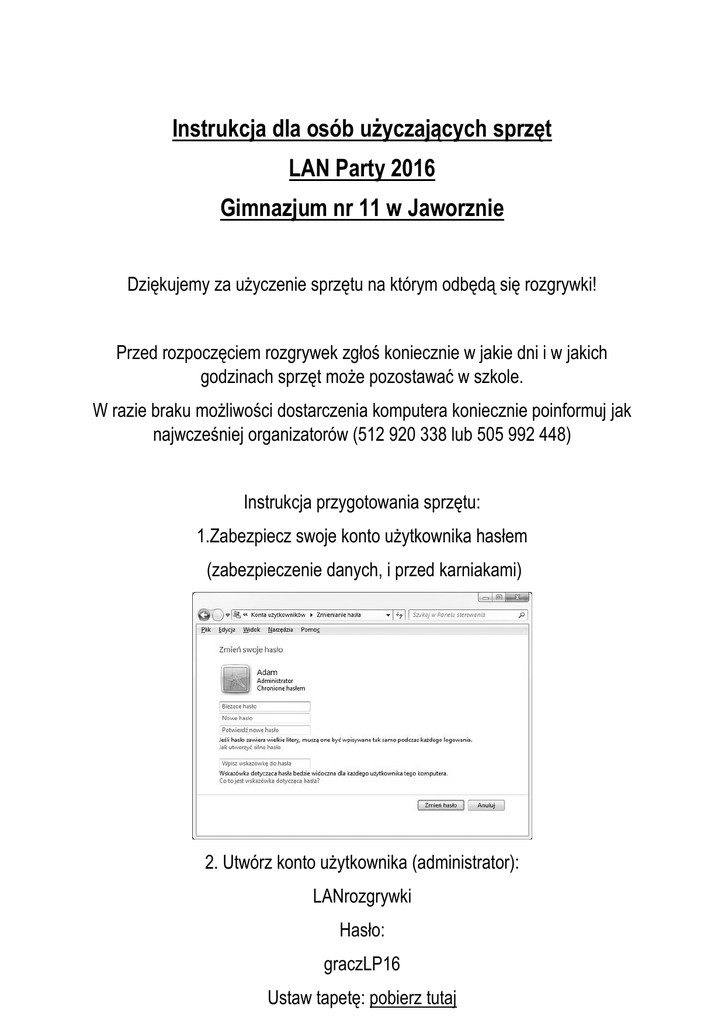 Instrukcja dla osób użyczających sprzęt LAN Party 2016 Gimnazjum nr 11 w Jaworznie Dziękujemy za użyczenie sprzętu na którym odbędą się rozgrywki! Przed rozpoczęciem rozgrywek zgłoś koniecznie w jakie dni i w jakich godzinach sprzęt może pozostawać w szkole. W razie braku możliwości dostarczenia komputera koniecznie poinformuj jak najwcześniej organizatorów (512 920 338 lub 505 992 448) Instrukcja przygotowania sprzętu: 1.Zabezpiecz swoje konto użytkownika hasłem (zabezpieczenie danych, i przed karniakami) 2. Utwórz konto użytkownika (administrator): LANrozgrywki Hasło: graczLP16 Ustaw tapetę: pobierz tutaj Zainstaluj i zaktualizuj klienta gier: Counter-Strike: Global Offensive League of Legends Hearthstone