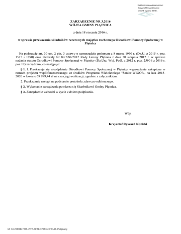 Elektronicznie podpisany przez: Krzysztof Ryszard Kozicki dnia 18 stycznia 2016 r. ZARZĄDZENIE NR 3.2016 WÓJTA GMINY PIĄTNICA z dnia 18 stycznia 2016 r. w sprawie przekazania składników rzeczowych majątku ruchomego Ośrodkowi Pomocy Społecznej w Piątnicy Na podstawie art. 30 ust. 2 pkt. 3 ustawy o samorządzie gminnym z 8 marca 1990 r. (Dz.U. z 2015 r. poz. 1515 i 1890) oraz Uchwały Nr 89/XXI/2012 Rady Gminy PIątnica z dnia 30 sierpnia 2012 r. w sprawie nadania statutu Ośrodkowi Pomocy Społecznej w Piątnicy (Dz.Urz. Woj. Podl. z 2012 r. poz. 2590 i z 2016 r. poz.12) zarządzam, co następuje: § 1. 1. Przekazuje się nieodpłatnie Ośrodkowi Pomocy Społecznej w Piątnicy wyposażenie zakupione w ramach projektu współfinansowanego ze środków Programu Wieloletniego "Senior-WIGOR„ na lata 20152020 w kwocie 69 999,44 zł na czas jego realizacji, zgodnie z załącznikiem. 2. Przekazanie nastąpi na podstawie protokołu zdawczo-odbiorczego. § 2. Wykonanie zarządzenia powierza się Skarbnikowi Gminy Piątnica. § 3. Zarządzenie wchodzi w życie z dniem podpisania. Wójt Krzysztof Ryszard Kozicki Id: 34672FBB-7388-49F6-8C2B-878836DF3A48. Podpisany Załącznik Zestawienie wyposażenia zakupionego w ramach projektu współfinansowanego ze środków Programu Wieloletniego "Senior-WIGOR" na lata 2015-2020 L.p. 1 2 3 4 5 6 7 8 9 10 11 12 13 14 15 16 17 18 19 20 21 22 23 24 25 26 27 28 29 30 31 32 33 34 35 36 38 Nazwa krzesła taastrup chromowa szafa tarp przesuwane drzwi szafa price star 1 drzwi stojak na ubrania kosz na śmieci medle kosz na śmieci medle okap podszafkowy czajnik inox electrolux mikser ZHM0861S SYMBIO maszynka do mielenia mięsaZMM1054S SYMBIO sokowirówkaZJE1200G ekspres przelewowy antena wewnętrzna DVB-T drabinka gimnastyczna przyścienna rower treningowy Kettler Golf P piłka gimnastyczna hantelka fitness hantelka fitness mata fitness - niebieska materac gimnastyczny pralka AMICA TAWE lodówka AMICA piekarnik AMICA zmywarka AMICA płyta AMICA żelazko PHILIPS deska do prasowaniaVILEDA telewizor LG LED wieża PHILIPS BTM HP 280 G1 MT [N9E78EA] [Win7/10 Pro] ESET NOD32 Antivirus BOX 1 Creative Inspire monitor 21,5" Philips drukarka HP Laser Jet Pro M125nw MFP zabudowa kuchenna - szafki stojące zabudowa kuchenna MEBLAD szafki wiszące zabudowa kuchenna - szafki stojące Id: 34672FBB-7388-49F6-8C2B-878836DF3A48. Podpisany Ilość 40 2 1 1 3 1 1 1 1 Wartość 3 246,00 2 002,30 171,15 86,15 123,30 66,10 249,00 169,99 179,99 1 1 1 1 229,00 229,00 219,00 99,99 4 1 20 10 10 20 2 1 1 1 1 1 1 1 1 1 1 845,00 2 275,50 492,00 49,20 92,25 492,00 492,00 1 331,23 1 533,73 1 135,89 1 620,38 1 195,88 383,73 243,72 3 203,72 469,00 1 1 1 1 2 300,00 170,00 110,00 389,00 1 499,00 1 3 259,50 1 3 464,91 2 934,80 Uwagi 39 40 41 42 43 44 45 46 47 48 49 50 51 52 53 54 55 56 57 58 59 60 61 62 63 64 65 66 67 68 69 70 71 72 73 74 75 76 77 78 79 80 81 stół kuchenny 80x80 stół kuchenny 160x80 krzesła do jadalni fotel stolik szafka leżanka 200x80 leżaki do odpoczynku biurko fotel stolik pod RTV szafka z półkami stolik do biblioteki i czytelni sofa fotel biurko fotel krzesło szafka leżanka 200x80 szafki do szatni sofa stół kando kubek szklany szufelka+zmiotka blacha tortownica 160 akcesoria kuchenne miski czajnik artmet dzbanek szklany karat szklanki patera garnek gipfel narzędzia afrodyta naczynia noże i nożyce patelnie taca sztućce kosz na śmieci kosz ratan deska pokrywa szklana Razem Id: 34672FBB-7388-49F6-8C2B-878836DF3A48. Podpisany 2 2 20 3 1 1 1 5 1 1 1 3 1 1 2 1 1 2 1 1 10 1 2 24 2 8 45 3 1 6 48 8 5 5 9 2 8 96 1 5 4 1 787,20 1 220,16 4 477,21 1 948,32 522,75 709,99 799,50 999,99 709,99 649,44 469,00 2 168,98 522,75 1 540,99 2 044,26 649,44 649,44 418,20 709,71 799,50 4 182,00 688,80 3 280,02 73,21 24,51 50,19 387,40 31,09 41,33 89,05 110,75 223,86 221,31 99,29 1 959,03 161,29 129,16 36,90 246,00 24,85 18,33 58,55 12,29 69 999,44