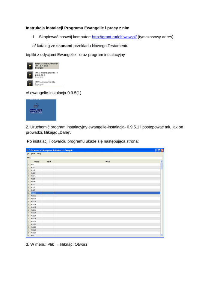 Instrukcja instalacji Programu Ewangelie i pracy z nim 1. Skopiować naswój komputer: http://grant.rudolf.waw.pl/ (tymczasowy adres) a/ katalog ze skanami przekładu Nowego Testamentu b/pliki z edycjami Ewangelie - oraz program instalacyjny c/ ewangelie-instalacja-0.9.5(1) 2. Uruchomić program instalacyjny ewangelie-instalacja- 0.9.5.1 i postępować tak, jak on prowadzi, klikając „Dalej”. Po instalacji i otwarciu programu ukaże się następująca strona: 3. W menu: Plik → kliknąć: Otwórz 4. Wybrać odpowiedni plik (np. 1599_pokora przed korektą..) 5. Po otworzeniu pliku programu Ewangelie, przejść do właściwej Ewangelii (kolejność Ewangelii: Aby poruszać się po pliku, należy przesunąć „suwak” znajdujący się po prawej stronie, wciskając lewy przycisk myszy. 6. Aby uzyskać podgląd skanu, należy kliknąć ikonkę pierwszą od góry w prawym rogu: Następnie wybrać odpowiedni przekład i ręcznie przesuwać za pomocą strzałek 7. Ukaże się następująca ikona:----------------------------------------------------------------------------- Ad 7. c.d. Klikamy wskazaną na powyższym obrazku ikonę (pierwsza w prawym górnym rogu), wyświetli się katalog. Należy wybrać skopiowany katalog z obrazkami, np. Leopolita. Obrazek można dowolnie przesuwać, zmniejszać, ustawić dowolne proporcje i wielkości. Strzałki (druga i trzecia ikona w prawym górnym rogu) pozwalają przejść do odpowiedniej strony transkrybowanego tekstu. Można też zwiększyć lub zmniejszyć okienko pracy, przeciągając jego krawędzie. 8. Wpisywanie wersetów W oknie tekstu wpisujemy werset zgodnie z zasadami podanymi w instrukcji zapisu. Po zapisaniu wersetu, klikamy OK. Wskazówka praktyczna dla wszystkich! Należy pamiętać, by do programu wpisać cały werset, nawet jeśli nie mamy pewności, czy wszystkie formy poprawnie odczytaliśmy. W razie konieczności poprawy danego słowa, już po ponownym otwarciu edycji danego wersetu (patrz dalej) można dwukrotnie kliknąć na wyraz, który chcemy poprawić. I poprawić go w nowym oknie (wyraz będzie na samej górze tego okna). Jest to zasadniczo okno przypisów, ale w nim można też dokonać poprawek źle odczytanych (i zapisanych) wyrazów. Jeśli trzeba poprawić tekst (np. zmienić lub dodać słowa) już po zaakceptowaniu całego danego wersetu, trzeba ten werset ponownie otworzyć, dwukrotnie na niego klikając. Ukaże się okienko pracy, a w nim w lewym dolnym rogu polecenie: edytuj przypisy. Trzeba kliknąć na to polecenie, po czym pojawi się tekst (zapisany nieco większą czcionką), który można ponownie edytować. Można wprowadzić nie tylko przypisy (o czym dalej), ale także dodać słowo (lub słowa). Aby dodać, usunąć lub zmienić słowo, należy najechać klawiszem myszy na dane słowo, strzałka zamieni się wówczas w znak rączki. Gdy kliknie się prawym klawiszem myszy, ukażą się trzy możliwe zadania: Wstaw słowa przed, Wstaw słowa po lub: Usuń słowo. Trzeba wybrać żądaną zmianę. 9. Wpisywanie przypisów Żeby zrobić przypisy do tekstu, trzeba ponownie kliknąć na zapisany wers (dodajemy tylko przypisy oryginalne, oraz o transliteracji; nie dokonują Państwo żadnych innych przypisów, które program umożliwia). Ikona pracy z danym wersetem ukaże się ponownie. Tym razem będzie w niej jeszcze jedno okno (pod wersetem) na Uwagi (można tu dodać uwagi np. o końcu strony). Po dwukrotnym kliknięciu na słowo, do którego ma być przypis, pojawi się kolejne okienko pracy zawierające miejsca na wpisanie odpowiednich przypisów. W zależności od przypisu, który chcemy dodać, w odpowiednim miejscu okienka wpisać dany przypis. Program umożliwia dodanie zarówno przypisu lewo-, jak i prawostronnego. W niektórych Bibliach szesnastowiecznych przy danym słowie są w tekście głównym znaki przypisu zarówno po lewej, jak i po prawej stronie słowa. Program umożliwia oddanie tej właściwości tekstów. Dlatego możemy dodać przypisy: Oryginalny lewy (okienko pracy u góry) lub Oryginalny (okienko pracy niżej). W programie słowo Oryginalny odnosi się do przypisu prawostronnego. W Biblii Leopolity nie ma tego typu przypisów. Są natomiast odesłania treści danego wersetu do innych fragmentów Biblii, nie sygnalizowane znakiem przypisu. Ponieważ poprawne przypisanie do konkretnego wersetu może sprawić trudność, proszę pominąć je w swoich pracach. Zapisane zmiany zaakceptować, klikając OK. 10. Definiowanie klawiszy a/ zdefiniowane skróty klawiszowe W programie Ewangelie zostały zdefiniowane następujące skróty do wpisywania samogłosek jasnych i pochylonych (z uwzględnieniem odstępstw co do kierunku akutu, tj. kierunku kreseczki, które zachowujemy w transkrypcji, np. á, à). á – klikamy ‘ (apostrof na klawiaturze pod znakiem cudzysłowu), następnie a é – analogicznie wpisujemy ‘ i e Akut odwrócony: à – wpisujemy ` (obrócony apostrof, zwykle pod tyldą w lewym górnym rogu klawiatury), następnie a è – analogicznie wpisujemy `e b/ definiowanie własnych skrótów Jeżeli w tekście często pojawia się inny znak graficzny, można go zdefiniować. Plik → kliknąć: Ustawienia Ukaże się następująca strona, na której trzeba kliknąć → Skróty 1. W menu: a1 Obrazek pokazuje też możliwość regulowania wielkości czcionki, którą można powiększyć lub zmniejszyć. 1 Dodajemy skrót według podanej poniżej instrukcji. W praktyce można z symboli skopiować symbol (wpisać go do dowolnego pliku i stąd skopiować do okna), zapisać według podanego schematu. 11. Dodawanie i usuwanie wersetów Pomiędzy drukami występują drobne różnice dotyczące liczby i układu wersetów w poszczególnych rozdziałach. Program przewiduje te sytuacje. Aby dodać werset, należy w menu Werset → kliknąć: Dodaj. Ukaże się następujący obrazek: Następnie wybieramy numer rozdziału i wersetu, zatwierdzamy operację, klikając OK. Podobnie post