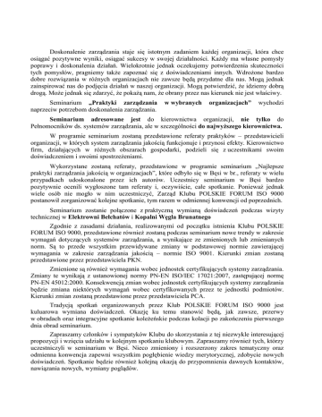 Doskonalenie zarządzania staje się istotnym zadaniem kaŜdej organizacji, która chce osiągać pozytywne wyniki, osiągać sukcesy w swojej działalności. KaŜdy ma własne pomysły poprawy i doskonalenia działań. Wielokrotnie jednak oczekujemy potwierdzenia skuteczności tych pomysłów, pragniemy takŜe zapoznać się z doświadczeniami innych. WdroŜone bardzo dobre rozwiązania w róŜnych organizacjach nie zawsze będą przydatne dla nas. Mogą jednak zainspirować nas do podjęcia działań w naszej organizacji. Mogą potwierdzić, Ŝe idziemy dobrą drogą. MoŜe jednak się zdarzyć, Ŝe pokaŜą nam, Ŝe obrany przez nas kierunek nie jest właściwy. Seminarium „Praktyki zarządzania naprzeciw potrzebom doskonalenia zarządzania. w wybranych organizacjach” wychodzi Seminarium adresowane jest do kierownictwa organizacji, nie tylko do Pełnomocników ds. systemów zarządzania, ale w szczególności do najwyŜszego kierownictwa. W programie seminarium zostaną przedstawione referaty praktyków – przedstawicieli organizacji, w których system zarządzania jakością funkcjonuje i przynosi efekty. Kierownictwo firm, działających w róŜnych obszarach gospodarki, podzieli się z uczestnikami swoim doświadczeniem i swoimi spostrzeŜeniami. Wykorzystane zostaną referaty, przedstawione w programie seminarium „Najlepsze praktyki zarządzania jakością w organizacjach”, które odbyło się w Bęsi w br., referaty w wielu przypadkach udoskonalone przez ich autorów. Uczestnicy seminarium w Bęsi bardzo pozytywnie ocenili wygłoszone tam referaty i, oczywiście, całe spotkanie. PoniewaŜ jednak wiele osób nie mogło w nim uczestniczyć, Zarząd Klubu POLSKIE FORUM ISO 9000 postanowił zorganizować kolejne spotkanie, tym razem w odmiennej konwencji od poprzednich. Seminarium zostanie połączone z praktyczną wymianą doświadczeń podczas wizyty technicznej w Elektrowni Bełchatów i Kopalni Węgla Brunatnego Zgodnie z zasadami działania, realizowanymi od początku istnienia Klubu POLSKIE FORUM ISO 9000, przedstawione równieŜ zostaną podczas seminarium nowe trendy w zakresie wymagań dotyczących systemów zarządzania, a wynikające ze zmienionych lub zmienianych norm. Są to przede wszystkim przewidywane zmiany w podstawowej normie zawierającej wymagania w zakresie zarządzania jakością – normie ISO 9001. Kierunki zmian zostaną przedstawione przez przedstawiciela PKN. Zmienione są równieŜ wymagania wobec jednostek certyfikujących systemy zarządzania. Zmiany te wynikają z ustanowionej normy PN-EN ISO/IEC 17021:2007, zastępującej normę PN-EN 45012:2000. Konsekwencją zmian wobec jednostek certyfikujących systemy zarządzania będzie zmiana niektórych wymagań wobec certyfikowanych przez te jednostki podmiotów. Kierunki zmian zostaną przedstawione przez przedstawiciela PCA. Tradycją spotkań organizowanych przez Klub POLSKIE FORUM ISO 9000 jest kuluarowa wymiana doświadczeń. Okazję ku temu stanowić będą, jak zawsze, przerwy w obradach oraz integracyjne spotkanie koleŜeńskie podczas kolacji po zakończeniu pierwszego dnia obrad seminarium. Zapraszamy członków i sympatyków Klubu do skorzystania z tej niezwykle interesującej propozycji i wzięcia udziału w kolejnym spotkaniu klubowym. Zapraszamy równieŜ tych, którzy uczestniczyli w seminarium w Bęsi. Nieco zmieniony i rozszerzony zakres tematyczny oraz odmienna konwencja zapewni wszystkim pogłębienie wiedzy merytorycznej, zdobycie nowych doświadczeń. Spotkanie będzie równieŜ kolejną okazją do przypomnienia dawnych kontaktów, nawiązania nowych, wymiany poglądów. „Praktyki zarządzania w wybranych organizacjach” 15-16 październik 2007r, Bełchatów PROGRAM 15.10.2007 – poniedziałek 1200-1300 1300-1400 Rejestracja uczestników Obiad 1400-1600 Sesja I 1. Znaczenie przywództwa w zarządzaniu organizacją dr inŜ. Jerzy Szpineter, BELOS SA 2. Droga do doskonałości w ASMET mgr inŜ. Magdalena Sajnaga, Asmet S.A. 3. Istota zarządzania procesowego. Dlaczego zarządzanie procesowe pomaga w zarządzaniu przedsiębiorstwem? mgr inŜ. Ewa Sierpina, FAMAK S.A. 4. Procesowe zarządzanie inwestycjami mgr inŜ. Stanisław Olszewski, Zakład Obsługi Inwestycji 1600-1630 Kawa, herbata 1630-1800 Sesja II 5. Mierzenie procesów biznesowych w firmie usługowej mgr Lidia Spocińska, LIM Sp. z o.o. 6. Personel firmy kapitałem w systemie zarządzania mgr Adam Majgier, JAREX sp. z o.o. 7. Komunikacja wewnętrzna w podejmowaniu decyzji mgr inŜ. GraŜyna śarlicka, AS-QUAL 1800-1830 Kawa, herbata 1830-1930 Sesja III 8. Konsekwencje dla podmiotów certyfikowanych wynikające ze zmian wymagań dla jednostek certyfikujących mgr inŜ. Janusz Sak, Polskie Centrum Akredytacji 9. Zmiany w normie ISO 9001 mgr inŜ. Anna Gruszka, Polski Komitet Normalizacyjny 2000 Spotkanie koleŜeńskie 16.10.2007r. – wtorek 800-900 Śniadanie 900-1300 Wizyta techniczna w Elektrowni Bełchatów SA i Kopalni Węgla Brunatnego 1300-1315 1315 Zakończenie seminarium Obiad