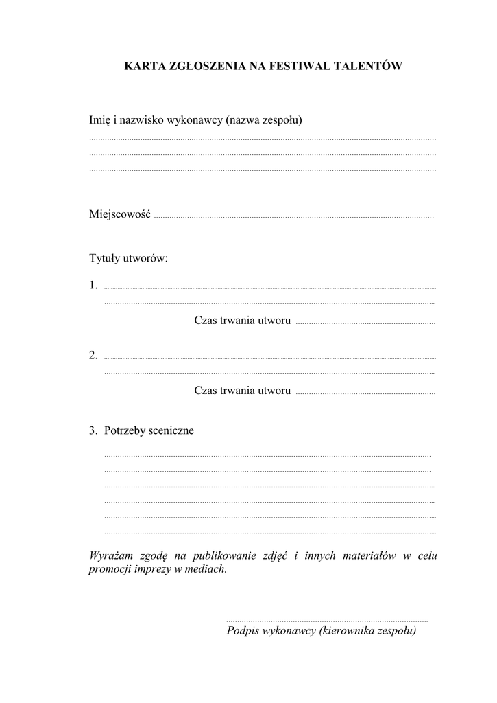 KARTA ZGŁOSZENIA NA FESTIWAL TALENTÓW Imię i nazwisko wykonawcy (nazwa zespołu) ………………………………………………………………………………………………………………………………………… ………………………………………………………………………………………………………………………………………… ………………………………………………………………………………………………………………………………………… Miejscowość ……………………………………………………………………………………………………………… Tytuły utworów: 1. ....................................................................................................................................................................................................... ………………………………………………………………………………………………………………………………….. Czas trwania utworu 2. ……………………………………………………… ....................................................................................................................................................................................................... ………………………………………………………………………………………………………………………………….. Czas trwania utworu ……………………………………………………… 3. Potrzeby sceniczne ………………………………………………………………………………………………………………………………… ………………………………………………………………………………………………………………………………… ………………………………………………………………………………………………………………………………….. ………………………………………………………………………………………………………………………………….. …………………………………………………………………………………………………………………………………... …………………………………………………………………………………………………………………………………... Wyrażam zgodę na publikowanie zdjęć i innych materiałów w celu promocji imprezy w mediach. ………………………………………………………………………………. Podpis wykonawcy (kierownika zespołu)