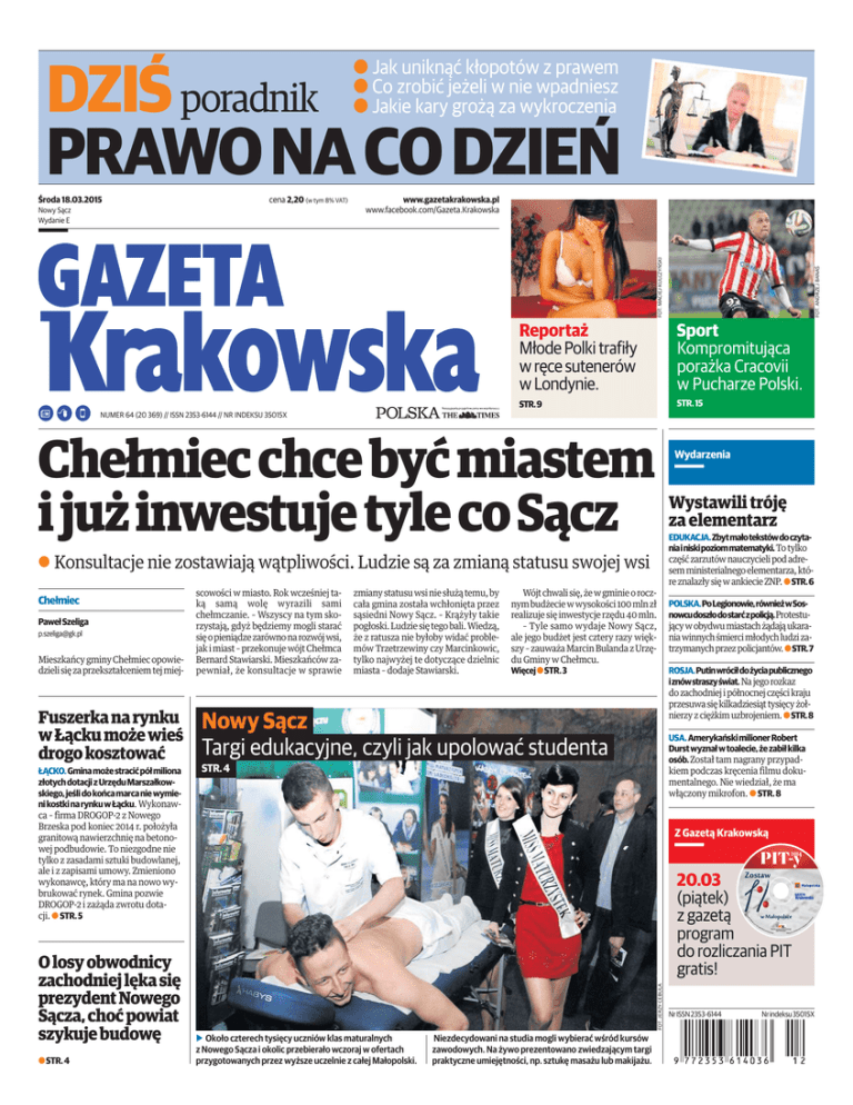 DZIŚ poradnik PRAWO NA CO DZIEŃ a Jak uniknąć kłopotów z prawem a Co zrobić jeżeli w nie wpadniesz a Jakie kary grożą za wykroczenia Środa 18.03.2015 cena 2,20 (w tym 8% VAT) www.gazetakrakowska.pl www.facebook.com/Gazeta.Krakowska FOT. ANDRZEJ BANAŚ FOT. MACIEJ KULCZYŃSKI Nowy Sącz Wydanie E Reportaż Młode Polki trafiły w ręce sutenerów w Londynie. Sport Kompromitująca porażka Cracovii w Pucharze Polski. STR.9 STR. 15 NUMER 64 (20 369) // ISSN 2353-6144 // NR INDEKSU 35015X Chełmiec chce być miastem i już inwestuje tyle co Sącz Wydarzenia Wystawili tróję za elementarz EDUKACJA.Zbytmałotekstówdoczytaniainiskipoziommatematyki. To tylko część zarzutów nauczycieli pod adresem ministerialnego elementarza, które znalazły się w ankiecie ZNP. aSTR.6 A Konsultacje nie zostawiają wątpliwości. Ludzie są za zmianą statusu swojej wsi Mieszkańcy gminy Chełmiec opowiedzieli się za przekształceniem tej miej- Fuszerka na rynku w Łącku może wieś drogo kosztować aSTR. 4 ROSJA.Putinwróciłdożyciapublicznego iznówstraszyświat. Na jego rozkaz do zachodniej i północnej części kraju przesuwa się kilkadziesiąt tysięcy żołnierzy z ciężkim uzbrojeniem. aSTR.8 Nowy Sącz Targi edukacyjne, czyli jak upolować studenta USA. Amerykański milioner Robert Durst wyznał w toalecie, że zabił kilka osób. Został tam nagrany przypadkiem podczas kręcenia filmu dokumentalnego. Nie wiedział, że ma włączony mikrofon. a STR. 8 STR. 4 Z Gazetą Krakowską 2014 PIT-y 20.03 Zostaw (piątek) Z0DÔRSROVFH z gazetą program do rozliczania PIT gratis! Elfi O losy obwodnicy zachodniej lęka się prezydent Nowego Sącza, choć powiat szykuje budowę POLSKA.PoLegionowie,równieżwSosnowcudoszłodostarćzpolicją.Protestujący w obydwu miastach żądają ukarania winnych śmierci młodych ludzi zatrzymanych przez policjantów. aSTR.7 t© i gh pyr Co ŁĄCKO. Gmina może stracić pół miliona złotych dotacji z Urzędu Marszałkowskiego, jeśli do końca marca nie wymieni kostki na rynku w Łącku. Wykonawca – firma DROGOP-2 z Nowego Brzeska pod koniec 2014 r. położyła granitową nawierzchnię na betonowej podbudowie. To niezgodne nie tylko z zasadami sztuki budowlanej, ale i z zapisami umowy. Zmieniono wykonawcę, który ma na nowo wybrukować rynek. Gmina pozwie DROGOP-2 i zażąda zwrotu dotacji. a STR. 5 Wójt chwali się, że w gminie o rocznym budżecie w wysokości 100 mln zł realizuje się inwestycje rzędu 40 mln. – Tyle samo wydaje Nowy Sącz, ale jego budżet jest cztery razy większy – zauważa Marcin Bulanda z Urzędu Gminy w Chełmcu. Więcej aSTR.3 5 [email protected] zmiany statusu wsi nie służą temu, by cała gmina została wchłonięta przez sąsiedni Nowy Sącz. – Krążyły takie pogłoski. Ludzie się tego bali. Wiedzą, że z ratusza nie byłoby widać problemów Trzetrzewiny czy Marcinkowic, tylko najwyżej te dotyczące dzielnic miasta – dodaje Stawiarski. 7-2 8-0 Paweł Szeliga scowości w miasto. Rok wcześniej taką samą wolę wyrazili sami chełmczanie. – Wszyscy na tym skorzystają, gdyż będziemy mogli starać się o pieniądze zarówno na rozwój wsi, jak i miast – przekonuje wójt Chełmca Bernard Stawiarski. Mieszkańców zapewniał, że konsultacje w sprawie nS p. z FOT. JERZY CEBULA Chełmiec b Około czterech tysięcy uczniów klas maturalnych z Nowego Sącza i okolic przebierało wczoraj w ofertach przygotowanych przez wyższe uczelnie z całej Małopolski. Niezdecydowani na studia mogli wybierać wśród kursów zawodowych. Na żywo prezentowano zwiedzającym targi praktyczne umiejętności, np. sztukę masażu lub makijażu. NrISSN2353-6144 o.o | e-m a il: j u pite r@ elfin. pl | ww w.elf in. ka Program do rocznego rozliczenia podatkowego erac nfed Jupiter 2014 Standard ul. Ko z o.o., ter Elfin Sp. 3 23, 0-3 K 06 . (1 , tel ów rak 2) 26 pl/jupi Nrindeksu35015X Polska Gazeta Krakowska Środa, 18 marca 2015 //03 www.gk.pl Dyżur reportera Nowy Sącz Paweł Szeliga 18 449 66 28 (od godz. 12-14) [email protected] Rośnie miasto pod Sączem A 63 proc. głosujących w gminie opowiedziało się A Jeśli dojdzie do zmiany administracyjnej, za przekształceniem Chełmca z wioski w miasto samorząd zyska szansę na dodatkowe pieniądze rencyjne. Bobowski rynek został zrewitalizowany. – Tak gwałtowny rozwój zawdzięczamy przekształceniu Bobowej w miasto – przekonuje burmistrz Wacław Ligęza. – Spływa do nas po prostu więcej pieniędzy. Taką samą zmianę odczuje Chełmiec. Chełmiec Paweł Szeliga [email protected] W ubiegłym roku mieszkańcy Chełmca, a teraz wszystkich pozostałych 26 wsi tej gminy, opowiedzieli się za nadaniem mu statusu miasta. – Jeśli wszystkie procedury pójdą dobrze, to zyskamy gigantyczny impuls rozwojowy – uważa wójt Bernard Stawiarski, który po tej zmianie stanie się burmistrzem. Ankiety z pytaniem o zmianę trafiły do mieszkańców wraz z rachunkami za śmieci. W 2014 r. za przekształceniem Chełmca w miasto opowiedziało się 1398 mieszkańców tej wsi, czyli 54 proc. uprawnionych do głosowania. Teraz w gminie na tak było 2407 osób, co stanowi 63 proc. głosujących. Trzeba jednak przyznać, że na wsi zainteresowanie ankietą było nikłe, gdyż odesłało ją tylko 19 proc. z 20 tys. uprawnionych do wyrażenia swojej opinii. – Nie ma to jednak znaczenia, gdyż uchwała rady gminy określiła, Bobowa jest miastem od sześciu lat i szybko się rozwija. Chełmiec też ma szansę GMINA CHEŁMIEC W LICZBACH A 112 km kwadratowych – powierzchnia A 100 mln zł – roczny budżet A 40 mln zł – wydatki na inwestycje A 26 tysięcy – liczba mieszkańców FOT. JERZY CEBULA Chełmiec mocno na tak Decyzjępodejmiepremier b Bernard Stawiarski zapewnia, że mieszkańcy nie stracą na zmianie. Nauczyciele zachowają dodatki wiejskie, rolnicy dopłaty bezpośrednie. Do gminy spłyną pieniądze, bo sięgnie po te dla miast i wsi że poparcie w samym Chełmcu, któr