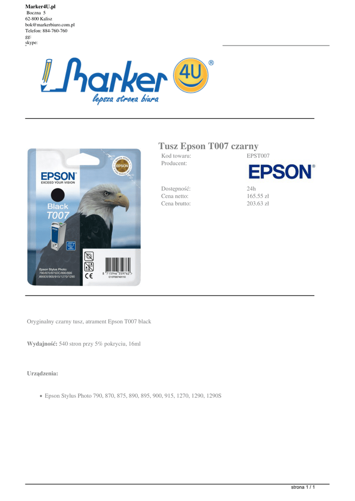 Marker4U.pl Boczna 5 62-800 Kalisz [email protected] Telefon: 884-760-760 gg: skype: Tusz Epson T007 czarny Kod towaru: Producent: EPST007 Dostępność: Cena netto: Cena brutto: 24h 165.55 zł 203.63 zł Oryginalny czarny tusz, atrament Epson T007 black Wydajność: 540 stron przy 5% pokryciu, 16ml Urządzenia: Epson Stylus Photo 790, 870, 875, 890, 895, 900, 915, 1270, 1290, 1290S strona 1 / 1 Powered by TCPDF (www.tcpdf.org)