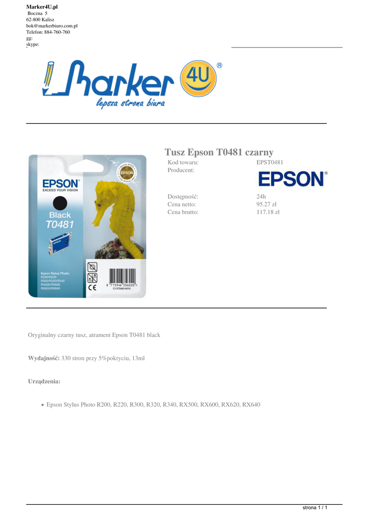 Marker4U.pl Boczna 5 62-800 Kalisz [email protected] Telefon: 884-760-760 gg: skype: Tusz Epson T0481 czarny Kod towaru: Producent: EPST0481 Dostępność: Cena netto: Cena brutto: 24h 95.27 zł 117.18 zł Oryginalny czarny tusz, atrament Epson T0481 black Wydajność: 330 stron przy 5%pokryciu, 13ml Urządzenia: Epson Stylus Photo R200, R220, R300, R320, R340, RX500, RX600, RX620, RX640 strona 1 / 1 Powered by TCPDF (www.tcpdf.org)