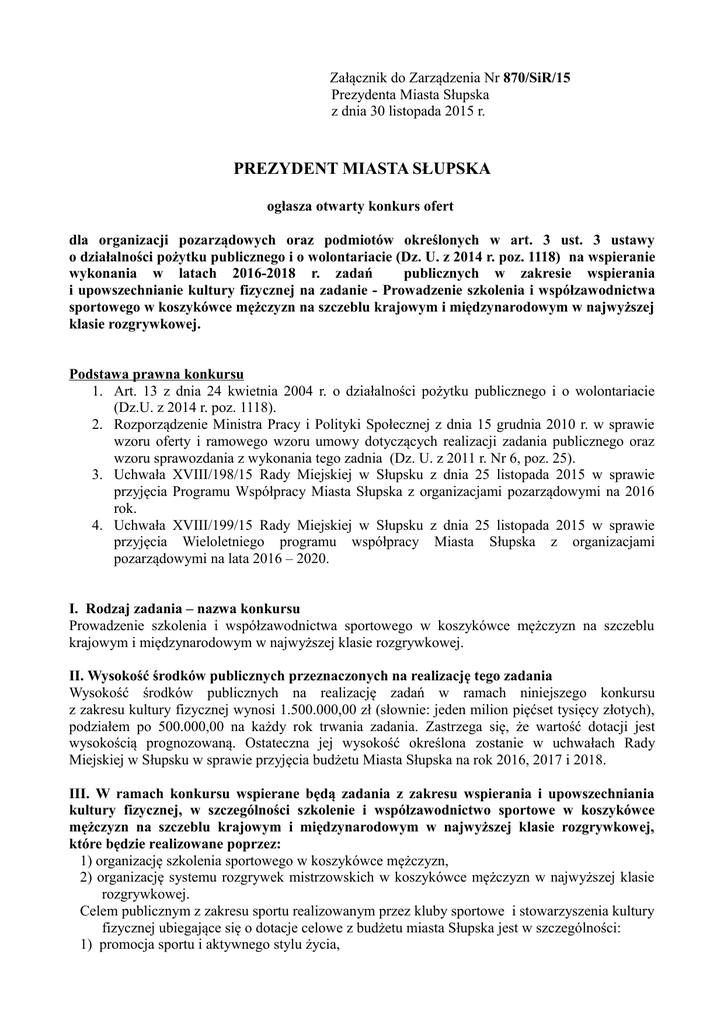 Załącznik do Zarządzenia Nr 870/SiR/15 Prezydenta Miasta Słupska z dnia 30 listopada 2015 r. PREZYDENT MIASTA SŁUPSKA ogłasza otwarty konkurs ofert dla organizacji pozarządowych oraz podmiotów określonych w art. 3 ust. 3 ustawy o działalności pożytku publicznego i o wolontariacie (Dz. U. z 2014 r. poz. 1118) na wspieranie wykonania w latach 2016-2018 r. zadań publicznych w zakresie wspierania i upowszechnianie kultury fizycznej na zadanie - Prowadzenie szkolenia i współzawodnictwa sportowego w koszykówce mężczyzn na szczeblu krajowym i międzynarodowym w najwyższej klasie rozgrywkowej. Podstawa prawna konkursu 1. Art. 13 z dnia 24 kwietnia 2004 r. o działalności pożytku publicznego i o wolontariacie (Dz.U. z 2014 r. poz. 1118). 2. Rozporządzenie Ministra Pracy i Polityki Społecznej z dnia 15 grudnia 2010 r. w sprawie wzoru oferty i ramowego wzoru umowy dotyczących realizacji zadania publicznego oraz wzoru sprawozdania z wykonania tego zadnia (Dz. U. z 2011 r. Nr 6, poz. 25). 3. Uchwała XVIII/198/15 Rady Miejskiej w Słupsku z dnia 25 listopada 2015 w sprawie przyjęcia Programu Współpracy Miasta Słupska z organizacjami pozarządowymi na 2016 rok. 4. Uchwała XVIII/199/15 Rady Miejskiej w Słupsku z dnia 25 listopada 2015 w sprawie przyjęcia Wieloletniego programu współpracy Miasta Słupska z organizacjami pozarządowymi na lata 2016 – 2020. I. Rodzaj zadania – nazwa konkursu Prowadzenie szkolenia i współzawodnictwa sportowego w koszykówce mężczyzn na szczeblu krajowym i międzynarodowym w najwyższej klasie rozgrywkowej. II. Wysokość środków publicznych przeznaczonych na realizację tego zadania Wysokość środków publicznych na realizację zadań w ramach niniejszego konkursu z zakresu kultury fizycznej wynosi 1.500.000,00 zł (słownie: jeden milion pięćset tysięcy złotych), podziałem po 500.000,00 na każdy rok trwania zadania. Zastrzega się, że wartość dotacji jest wysokością prognozowaną. Ostateczna jej wysokość określona zostanie w uchwałach Rady Miejskiej w Słupsku w sprawie przyjęcia budżetu Miasta Słupska na rok 2016, 2017 i 2018. III. W ramach konkursu wspierane będą zadania z zakresu wspierania i upowszechniania kultury fizycznej, w szczególności szkolenie i współzawodnictwo sportowe w koszykówce mężczyzn na szczeblu krajowym i międzynarodowym w najwyższej klasie rozgrywkowej, które będzie realizowane poprzez: 1) organizację szkolenia sportowego w koszykówce mężczyzn, 2) organizację systemu rozgrywek mistrzowskich w koszykówce mężczyzn w najwyższej klasie rozgrywkowej. Celem publicznym z zakresu sportu realizowanym przez kluby sportowe i stowarzyszenia kultury fizycznej ubiegające się o dotacje celowe z budżetu miasta Słupska jest w szczególności: 1) promocja sportu i aktywnego stylu życia, 2) rozwój stosunków społecznych oraz poprawa kondycji fizycznej i psychicznej mieszkańców Słupska poprzez uczestnictwo, doraźne lub zorganizowane, we wszelkich formach aktywności fizycznej, 3) upowszechnianie kultury fizycznej, 4) osiąganie jak najwyższych wyników sportowych przez słupskie kluby sportowe, 5) osiąganie zrównoważonego rozwoju sportu dzieci i młodzieży oraz sportu wyczynowego. Dotacje celowe służą realizacji celu publicznego i mogą być przeznaczone w szczególności na: 1) Realizację programów szkolenia sportowego tj: a) transport, wyżywienie i zakwaterowanie (w przypadku wyjazdowych meczy ligowych i towarzyskich, turniejów oraz zgrupowań sportowych), b) opiekę medyczną, badania lekarskie i koszty odnowy biologicznej, c) zakup środków doraźnej pomocy medycznej, odżywek, d) opłaty związane z udziałem w rozgrywkach sportowych (opłaty rejestracyjne, związkowe, licencje, zezwolenia), e) ubezpieczenia OC oferenta oraz NW zawodników i trenerów. 2) Zakup sprzętu sportowego, odzieży i obuwia sportowego. 3) Pokrycie kosztów organizacji i przeprowadzenia zawodów sportowych lub uczestnictwa w tych zawodach. 4) Pokrycie kosztów utrzymania i korzystania z obiektów sportowych dla celów szkolenia sportowego i rozgrywania zawodów. 5) Sfinansowanie wynagrodzenia kadry szkoleniowej oraz delegacji sędziowskich. 6) Sfinansowanie kosztów zabezpieczenia i ubezpieczenia imprez i zawodów. 7) Dofinansowanie doskonalenia i podnoszenia kwalifikacji kadry szkoleniowej. 8) Pokrycie kosztów stypendiów zawodników. 9) Pokrycie kosztów administracyjnych związanych z obsługą zadania. 10) Wydatki związane z wynajmem mieszkań dla zawodników i kadry trenerskiej. IV. Zasady przyznawania dotacji 1. Oferty realizacji zadania publicznego, mogą składać organizacje pozarządowe oraz podmioty określone w art. 3 ust. 3 ustawy o działalności pożytku publicznego i o wolontariacie, które w ramach swoich zadań statutowych prowadzą działania określone w niniejszym ogłoszeniu. 2. Oferty realizacji zadania publicznego należy sporządzić według wzoru określonego w załączniku nr 1 do rozporządzenia Ministra Pracy i Polityki Społecznej z dnia 15 grudnia 2010 roku w sprawie wzoru oferty i ramowego wzoru umowy dotyczących realizacji zadania publicznego oraz wzoru sprawozdania z wykonania tego zadania (Dz. U. z 2011 r. nr 6, poz. 25). Wzór oferty realizacji zadania publicznego, stanowi załącznik nr 1 do niniejszego ogłoszenia. Wzór oferty dostępny jest w Urzędzie Miejskim w Słupsku, pokój 119 oraz w serwisie internetowym Miasta Słupska w zakładce „organizacje pozarządowe”. 3. Do oferty należy dołączyć następujące załączniki: 1) aktualny odpis z Krajowego Rejestru Sądowego lub wyciąg z właściwego rejestru potwierdzony „za zgodność z oryginałem” z aktualną datą i podpisem osoby uprawnionej, 2) pełnomocnictwo do działania w imieniu organizacji – w przypadku, gdy ofertę podpisały osoby inne niż umocowane do reprezentacji zgodnie z rejestrem, 3) na etapie rozpatrywania oferty, oferent może zostać poproszony o przedło