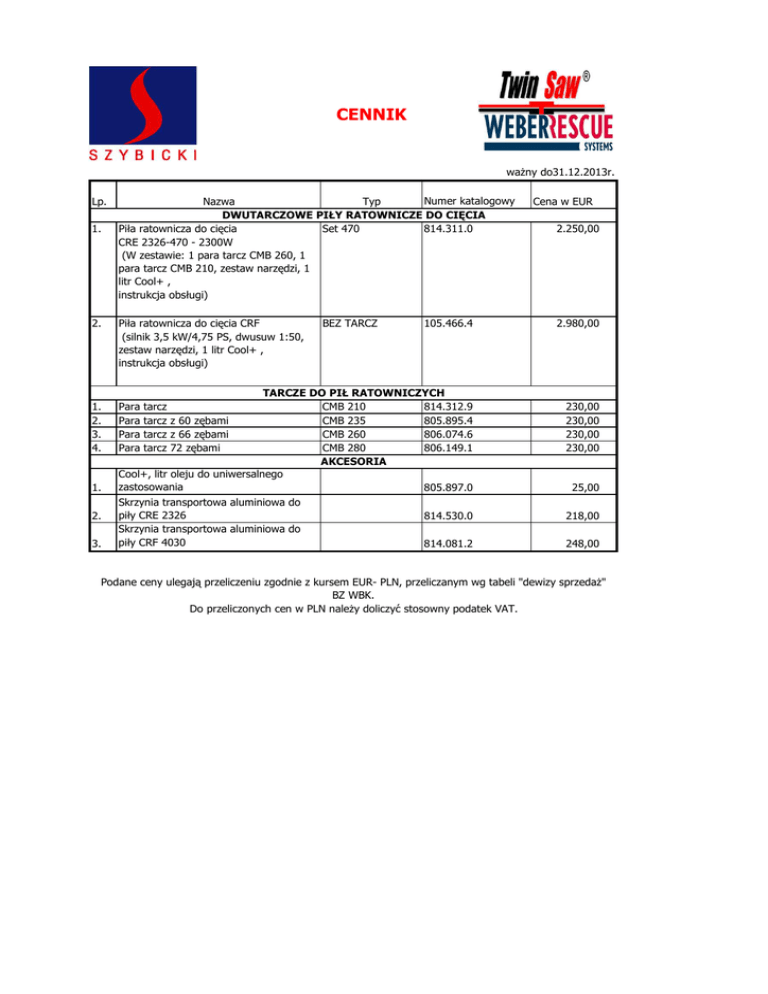 CENNIK ważny do31.12.2013r. Lp. 1. 2. 1. 2. 3. 4. 1. 2. 3. Numer katalogowy Nazwa Typ DWUTARCZOWE PIŁY RATOWNICZE DO CIĘCIA Piła ratownicza do cięcia Set 470 814.311.0 CRE 2326-470 - 2300W (W zestawie: 1 para tarcz CMB 260, 1 para tarcz CMB 210, zestaw narzędzi, 1 litr Cool+ , instrukcja obsługi) Piła ratownicza do cięcia CRF (silnik 3,5 kW/4,75 PS, dwusuw 1:50, zestaw narzędzi, 1 litr Cool+ , instrukcja obsługi) BEZ TARCZ 105.466.4 TARCZE DO PIŁ RATOWNICZYCH CMB 210 814.312.9 CMB 235 805.895.4 CMB 260 806.074.6 CMB 280 806.149.1 AKCESORIA Cool+, litr oleju do uniwersalnego zastosowania 805.897.0 Skrzynia transportowa aluminiowa do piły CRE 2326 814.530.0 Skrzynia transportowa aluminiowa do piły CRF 4030 814.081.2 Para Para Para Para tarcz tarcz z 60 zębami tarcz z 66 zębami tarcz 72 zębami Cena w EUR 2.250,00 2.980,00 230,00 230,00 230,00 230,00 25,00 218,00 248,00 Podane ceny ulegają przeliczeniu zgodnie z kursem EUR- PLN, przeliczanym wg tabeli "dewizy sprzedaż" BZ WBK. Do przeliczonych cen w PLN należy doliczyć stosowny podatek VAT.