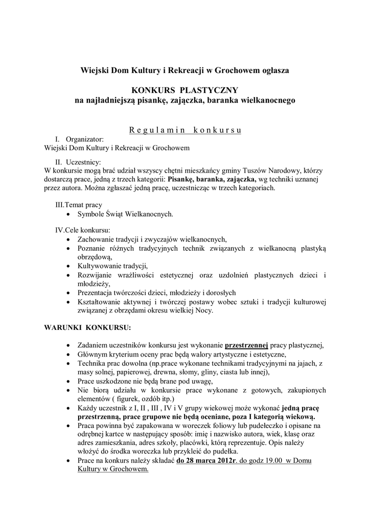 Wiejski Dom Kultury i Rekreacji w Grochowem ogłasza KONKURS PLASTYCZNY na najładniejszą pisankę, zajączka, baranka wielkanocnego Regulamin konkursu I. Organizator: Wiejski Dom Kultury i Rekreacji w Grochowem II. Uczestnicy: W konkursie mogą brać udział wszyscy chętni mieszkańcy gminy Tuszów Narodowy, którzy dostarczą prace, jedną z trzech kategorii: Pisankę, baranka, zajączka, wg techniki uznanej przez autora. Można zgłaszać jedną pracę, uczestnicząc w trzech kategoriach. III.Temat pracy Symbole Świąt Wielkanocnych. IV.Cele konkursu: Zachowanie tradycji i zwyczajów wielkanocnych, Poznanie różnych tradycyjnych technik związanych z wielkanocną plastyką obrzędową, Kultywowanie tradycji, Rozwijanie wrażliwości estetycznej oraz uzdolnień plastycznych dzieci i młodzieży, Prezentacja twórczości dzieci, młodzieży i dorosłych Kształtowanie aktywnej i twórczej postawy wobec sztuki i tradycji kulturowej związanej z obrzędami okresu wielkiej Nocy. WARUNKI KONKURSU: Zadaniem uczestników konkursu jest wykonanie przestrzennej pracy plastycznej, Głównym kryterium oceny prac będą walory artystyczne i estetyczne, Technika prac dowolna (np.prace wykonane technikami tradycyjnymi na jajach, z masy solnej, papierowej, drewna, słomy, gliny, ciasta lub innej), Prace uszkodzone nie będą brane pod uwagę, Nie biorą udziału w konkursie prace wykonane z gotowych, zakupionych elementów ( figurek, ozdób itp.) Każdy uczestnik z I, II , III , IV i V grupy wiekowej może wykonać jedną pracę przestrzenną, prace grupowe nie będą oceniane, poza I kategorią wiekową. Praca powinna być zapakowana w woreczek foliowy lub pudełeczko i opisane na odrębnej kartce w następujący sposób: imię i nazwisko autora, wiek, klasę oraz adres zamieszkania, adres szkoły, placówki, którą reprezentuje. Opis należy włożyć do środka woreczka lub przykleić do pudełka. Prace na konkurs należy składać do 28 marca 2012r. do godz 19.00 w Domu Kultury w Grochowem. Wraz z dostarczeniem pracy na konkurs niezbędne jest pisemne zgłoszenie do konkursu, które jest równoznaczne z wyrażeniem przez uczestnika zgody na przetwarzanie danych osobowych wyłącznie do celów konkursu. Zgłoszenie osoby, która nie ukończyła 18 lat, musi być podpisane przez opiekuna/ rodzica. Ocena i nagrody: Prace w pięciu kategoriach wiekowych oceniać będzie 3 osobowa komisja powołana przez organizatora. o o o o o I grupa wiekowa – przedszkola II grupa wiekowa – uczniowie z klas I – III III grupa wiekowa – uczniowie z klas IV – VI IV grupa wiekowa – uczniowie z gimnazjum Dorośli/stowarzyszenia Prace będą oceniane według następujących kryteriów: - ogólne wrażenie artystyczne, oryginalność pomysłu, - nawiązanie do tradycji - opracowanie ogólne, dobór i wykorzystanie materiałów, - wkład pracy, (nowatorstwo, dekoracyjność) - estetyka pracy oraz trwałość, - walory plastyczne(kompozycja, kolorystyka, dodatki) W każdej z nich zostaną nagrodzeni (I,-III miejsc,) w pięciu kategoriach wiekowych. Jury może przyznać dodatkowe wyróżnienia w zależności od ilości i poziomu artystycznego prac. Wyniki konkursu, zawierające imiona i nazwiska autorów nagrodzonych prac, zostaną ogłoszone 30 marca 2012 roku na stronie internetowej Domu Kultury w Grochowem www.wdkirgrochowe.pl Wręczenie nagród i wyróżnień podczas otwarcia wystawy 3 kwietnia 2012r. o godz.14.00. w sali wystawowej Domu Kultury w Grochowem. Uwagi końcowe: Nagrody będzie można odebrać tylko w dniu otwarcia wystawy czyli -3 marca Wszystkie prace będą prezentowane w sali wystawowej WDKiR w Grochowem do 20 kwietnia br. po zakończonej wystawie prace będzie można odebrać. Sprawy nie objęte regulaminem rozstrzyga organizator konkursu, ocena komisji jest ostateczna. KARTA ZGŁOSZENIOWA DO KONKURSU plastycznego na najładniejszą pisankę, baranka i zajączka Dane uczestnika konkursu: 1.Imię i nazwisko .................................................................................................................. 2.Wiek .......................... Klasa .................................................................. 3. Nazwa Szkoły....................................................... Telefon ……………………………... Kartę zgłoszenia wypełniamy drukowanymi literami Wyrażam zgodę na udział mojego dziecka w konkursie oraz na umieszczenie i przetwarzanie jego danych osobowych obejmujących: imię, nazwisko wiek, nazwa szkoły, które zostaną wykorzystane do celów promocyjnych Domu Kultury. Data i czytelny podpis rodzica ………………………………… KARTA ZGŁOSZENIOWA DO KONKURSU plastycznego na najładniejszą pisankę, baranka i zajączka Dane uczestnika konkursu: 1.Imię i nazwisko .................................................................................................................. 2.Wiek .......................... 3. adres…………………………………………… Telefon ……………………………... Kartę zgłoszenia wypełniamy drukowanymi literami Wyrażam zgodę na umieszczenie i przetwarzanie moich danych osobowych obejmujących: imię, nazwisko wiek, które zostaną wykorzystane do celów promocyjnych Domu Kultury. Data i czytelny podpis uczestnika …………………………………