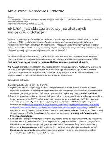Mniejszości Narodowe i Etniczne Źródło: http://mniejszosci.narodowe.mswia.gov.pl/mne/dotacje/2017/dotacje/10121,ePUAP-jak-skladac-korekty-juz-zlozonychwnioskow-o-dotacje.html Wygenerowano: Piątek, 3 marca 2017, 23:36 ePUAP - jak składać korekty już złożonych wniosków o dotacje? Zgodnie z obowiązującą Informacją o szczegółowych zasadach postępowania przy udzielaniu dotacji na realizację w 2017 r. zadań mających na celu ochronę, zachowanie i rozwój tożsamości kulturowej mniejszości narodowych i etnicznych oraz zachowanie i rozwój języka regionalnego ewentualne korekty złożonych wniosków, czy to z inicjatywy własnej, czy też ze względu na otrzymane z Departamentu pismo z uwagami, powinny być składane za pomocą ePUAPu. Jak to zrobić? Do złożenia korekty wniosku wykorzystywany jest ten sam formularz, który używany jest do składania nowych wniosków - zostają do niego pobrane dane ze złożonego wniosku, zarejestrowanego w ESOMie. Jeśli pamiętasz, jak go otworzyć, rozpocznij lekturę poniższej instrukcji od pkt. 4. NIE NALEŻY przygotowywać korekty, otwierając pierwotny wniosek zapisany w Wysłanych w Skrzynce na ePUAPie, a następnie zapisując go w Roboczych i wprowadzając w nim zmiany - po wysłaniu takiego dokumentu zostanie on potraktowany przez ESOM jako nowy wniosek, a nie korekta już złożonego i, ze względu na złożenie po terminie, zostanie on odrzucony bez rozpatrzenia. Szczegółowa instrukcja: 1. Zalogować się na swoje konto na ePUAPie. 2. Wybrać jako kontekst organizację, z profilu której składaliśmy wniosek (można to zrobić w trakcie logowania lub później, za pomocą głównego menu ePUAPu, dostępnego po kliknięciu na niebieski trójkąt w prawym górnym rogu ekranu, obok naszych personaliów - wybieramy pozycję Zmień podmiot). 3. Przejść do formularza wniosku - dokładnie tak samo, jak przy rozpoczynaniu pracy nad nowym wnioskiem. Po zalogowaniu się na ePUAPie należy przejść do Katalogu spraw (poniżej logo ePUAP 2), za pomocą odnośnika Inne podziały spraw (pod Moją Skrzynką) przełączyć na Alfabetyczną listę spraw i odnaleźć na niej Dotacje na zadania służące ochronie, zachowaniu i rozwojowi tożsamości kulturowej mniejszości narodowych i etnicznych oraz podtrzymaniu i rozwojowi języka regionalnego. Odnośnik ten prowadzi do strony z opisem usługi, na której należy wybrać Załatw sprawę (niebieski przycisk z prawej strony), a w oknie Wybór formularza, które pojawi się na ekranie - Wniosek o dofinansowanie Przejdź do formularza. 4. Rozpoczynając pracę nad korektą sugerujemy, aby zmienić domyślną nazwę dokumentu (np. na zgodną z tytułem zadania i dopiskiem "wer. 2" lub odpowiednio wyższym numerem. - ułatwi to jego późniejszą lokalizację na ePUAPie) - analogicznie, jak w wypadku nowych wniosków. Żeby zmienić tytuł należy kliknąć na + Zaawansowane nad formularzem (tuż nad szarą ramką Edycja), a następnie wybrać Zmień nazwę dokumentu, wprowadzić nazwę w nowootwartym oknie, a następnie zatwierdzić, ponownie klikając na Zmień nazwę dokumentu. 5. Na górze formularza, poniżej logo Mniejszości Narodowe i Etniczne, znajdują się dwa dwupozycyjne przełączniki - Rodzaj wniosku (tutaj nic nie zmieniamy, pozostawiając wartość domyślną, czyli Wniosek o dofinansowanie) oraz Rodzaj zgłoszenia - tutaj zmieniamy wartość na Nowa wersja. 6. Po dokonaniu zmiany ustawienia wskazanej w pkt. 5, poniżej wiersza Rodzaj zgłoszenia pojawi się pole zatytułowane nr wniosku. Należy wpisać w nie numer, pod jakim zarejestrowany został w ESOMie wniosek, który ma zostać skorygowany, np. 999/ESOM/2017 (jeśli po złożeniu pierwotnej wersji wniosku nie otrzymano informacji o tym numerze automatycznie na skrzynkę na ePUAPie, ani nie wystąpiono o potwierdzenie rejestracji w ESOMie do Departamentu drogą mailową, informacje, jak uzyskać numer złożonego wniosku dostępne są tutaj, w pkt. 1). Proszę zwrócić uwagę, aby przed ani po numerze nie znalazły się w tym polu żadne spacje - może to spowodować błąd. 7. Użyć przycisku Pobierz dane, znajdującego się obok pola nr wniosku. 8. Jeśli wszystko przebiegło poprawnie, z systemu ESOM pobrana zostanie treść ostatniej aktualnej wersji wniosku o wskazanym numerze (czyli, w zależności od tego, czy to pierwsza, czy kolejna korekta, wersja złożona pierwotnie lub poprzednio złożona korekta). Można przystąpić do korygowania treści wniosku. Po jej zakończeniu wniosek należy podpisać elektronicznie i wysłać - analogicznie, jak miało to miejsce w wypadku nowowypełnianego wniosku. Uwaga! Przy składaniu korekt nie jest wymagana wysyłka pocztą tradycyjną wydrukowanego, podstemplowanego i podpisanego formularza - wymagana jest JEDYNIE wersja elektroniczna. Wstecz Drukuj Generuj PDF Powiadom znajomego