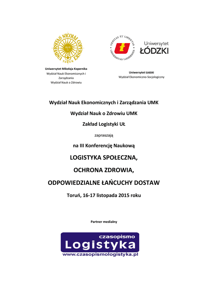 Uniwersytet Mikołaja Kopernika Uniwersytet Łódzki Wydział Ekonomiczno-Socjologiczny Wydział Nauk Ekonomicznych i Zarządzania Wydział Nauk o Zdrowiu Wydział Nauk Ekonomicznych i Zarządzania UMK Wydział Nauk o Zdrowiu UMK Zakład Logistyki UŁ zapraszają na III Konferencję Naukową LOGISTYKA SPOŁECZNA, OCHRONA ZDROWIA, ODPOWIEDZIALNE ŁAŃCUCHY DOSTAW Toruń, 16-17 listopada 2015 roku Partner medialny Rada programowa konferencji Dr hab. Jerzy Boehlke, prof. UMK – przewodniczący Dr hab. inż. Adam Sadowski, prof. UŁ. – wiceprzewodniczący Prof. dr hab. Jadwiga Suchecka, UŁ Dr hab. Grażyna Juszczak-Szumacher, UŁ Prof. dr hab. Magdalena Osińska, UMK Prof. dr hab. inż. Jacek Szołtysek, UE w Katowicach Dr hab. Joanna Bruzda, prof. UMK Dr hab. inż. Joanna Nowakowska-Grunt, prof. P.Cz. Dr hab. inż. Beata Skowron-Grabowska, prof. P.Cz. Komitet organizacyjny Mgr Łukasz Topolewski e-mail: [email protected] tel. 509 755 194 Mgr Kamila Kaczmarczyk e-mail: [email protected] tel. 502 163 890 Komitet organizacyjny panelu studenckiego Mgr Michał Oleszczak [email protected] tel. 56 6114609 Pełny koszt uczestnictwa w Konferencji obejmuje: publikację artykułu w czasopiśmie Logistyka (10 pkt. według MNiSW), udział w obradach oraz imprezach towarzyszących, uroczysty obiad oraz przerwy kawowe. Szanowni Państwo, Mamy już po raz trzeci przyjemność zaprosić Państwa do udziału w konferencji, poświęconej logistyce społecznej, zastosowaniom logistyki w ochronie zdrowia oraz zarządzaniu odpowiedzialnymi łańcuchami dostaw. Konferencja, stanowiąc rezultat współpracy środowisk naukowych Uniwersytetu Łódzkiego i Uniwersytetu Mikołaja Kopernika w Toruniu, koncentruje się przede wszystkim na społecznych i ekologicznych aspektach logistyki i zarządzania łańcuchami dostaw. Jest ona doskonałą okazją do wspólnej dyskusji na temat kierunków rozwoju zarządzania łańcuchami dostaw oraz wyników nowych interdyscyplinarnych badań w dziedzinie logistyki społecznej. Jako organizatorzy liczymy na Państwa udział i aktywne uczestnictwo w części merytorycznej konferencji, jak i w imprezach towarzyszących. Do zobaczenia w Toruniu Przewodniczący Konferencji dr hab. Jerzy Boehlke, prof. UMK Tematyka konferencji zorientowana jest na diagnozę stanu rozwoju szeroko rozumianej logistyki społecznej i zarządzania odpowiedzialnymi łańcuchami dostaw oraz wyznaczanie kierunków rozwoju zarządzania łańcuchami dostaw. Obrady będą obejmować następujące obszary. I. Logistyka społeczna a logistyka biznesu. Podobieństwa i różnice • Teoriopoznawcze wyzwania logistyki społecznej • Obszary logistyki społecznej • Logistyka społeczna i jej wpływ na funkcjonowanie społeczeństwa • Wybrane obszary logistyki miasta II. Logistyka w ochronie zdrowia. Zastosowania i tendencje rozwojowe • Zarządzanie logistyczne w ochronie zdrowia • Metody, techniki i narzędzia stosowane w placówkach służby zdrowia do kształtowania procesów i systemów logistycznych • Gospodarka odpadami medycznymi • Logistyka i zarządzanie procesami informacyjnymi w ochronie zdrowia • Zarządzanie łańcuchami dostaw w farmacji III. Logistyka zrównoważona i odpowiedzialne łańcuchy dostaw • CSR w przedsiębiorstwach sektora TSL • Ekologia w logistyce. Koncepcje, strategie, instrumenty zarządzania • Logistyka katastrof naturalnych i technologicznych • Zarządzanie łańcuchami dostaw w organizacjach charytatywnych • Logistyka humanitarna i sytuacji kryzysowych Ważne terminy Zgłoszenie uczestnictwa w konferencji oraz przesłanie referatów 15.08.2015 r. Ostateczny termin dokonania opłaty konferencyjnej 15.08.2015 r. Formy uczestnictwa w konferencji Udział w konferencji z publikacją 650 zł Udział w konferencji bez publikacji 200 zł Publikacja, bez udziału w konferencji 450zł Opłata za każdy dodatkowy artykuł 350 zł Opłaty za udział w konferencji/publikację artykułu należy dokonać do dnia 15.08.2015 r. na konto: Uniwersytet Mikołaja Kopernika w Toruniu Bank Millenium S.A. w Warszawie 45 1160 2202 0000 0000 3174 8579 z dopiskiem: a) LOGISTYKA, imię i nazwisko uczestnika konferencji b) Faktura na: ………. (nazwa, adres i NIP instytucji) - tylko w przypadku, gdy przelew jest robiony z konta prywatnego, a uczestnik będzie się ubiegał o zwrot kosztów. Zgłoszenia • formularz zgłoszeniowy, oświadczenia o przeniesieniu praw autorskich i współautorstwie, teksty artykułów oraz wszelkie pytania prosimy kierować na adresy e-mail komitetu organizacyjnego • dodatkowo oryginały oświadczeń o przeniesieniu praw autorskich i współautorstwie prosimy także o przesyłanie pocztą na adres: Katedra Ekonomii, Wydział Nauk Ekonomicznych i Zarządzania, Uniwersytet Mikołaja Kopernika w Toruniu, ul. Gagarina 13A, 87-100 Toruń z dopiskiem: konferencja logistyka • formularz zgłoszeniowy oraz oświadczenia, znajdują się do pobrania na stronie WWW Wydziału Nauk Ekonomicznych i Zarządzania w zakładce Konferencje i seminaria: http://www.econ.umk.pl/