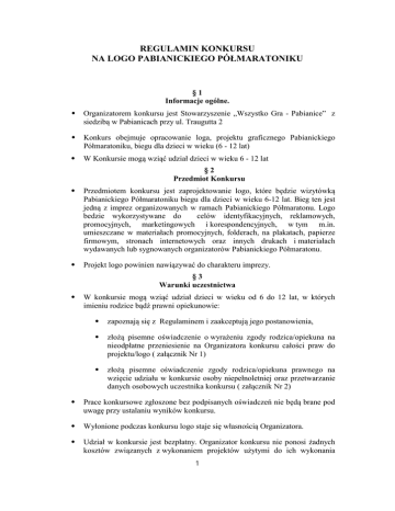 REGULAMIN KONKURSU NA LOGO PABIANICKIEGO PÓŁMARATONIKU §1 Informacje ogólne. ⦁ Organizatorem konkursu jest Stowarzyszenie „Wszystko Gra - Pabianice” z siedzibą w Pabianicach przy ul. Traugutta 2 ⦁ Konkurs obejmuje opracowanie loga, projektu graficznego Pabianickiego Półmaratoniku, biegu dla dzieci w wieku (6 - 12 lat) ⦁ W Konkursie mogą wziąć udział dzieci w wieku 6 - 12 lat §2 Przedmiot Konkursu ⦁ Przedmiotem konkursu jest zaprojektowanie logo, które będzie wizytówką Pabianickiego Półmaratoniku biegu dla dzieci w wieku 6-12 lat. Bieg ten jest jedną z imprez organizowanych w ramach Pabianickiego Półmaratonu. Logo bedzie wykorzystywane do celów identyfikacyjnych, reklamowych, promocyjnych, marketingowych i korespondencyjnych, w tym m.in. umieszczane w materiałach promocyjnych, folderach, na plakatach, papierze firmowym, stronach internetowych oraz innych drukach i materiałach wydawanych lub sygnowanych organizatorów Pabianickiego Półmaratonu. ⦁ Projekt logo powinien nawiązywać do charakteru imprezy. §3 Warunki uczestnictwa ⦁ W konkursie mogą wziąć udział dzieci w wieku od 6 do 12 lat, w których imieniu rodzice bądź prawni opiekunowie: ⦁ zapoznają się z Regulaminem i zaakceptują jego postanowienia, ⦁ złożą pisemne oświadczenie o wyrażeniu zgody rodzica/opiekuna na nieodpłatne przeniesienie na Organizatora konkursu całości praw do projektu/logo ( załącznik Nr 1) ⦁ złożą pisemne oświadczenie zgody rodzica/opiekuna prawnego na wzięcie udziału w konkursie osoby niepełnoletniej oraz przetwarzanie danych osobowych uczestnika konkursu ( załącznik Nr 2) ⦁ Prace konkursowe zgłoszone bez podpisanych oświadczeń nie będą brane pod uwagę przy ustalaniu wyników konkursu. ⦁ Wyłonione podczas konkursu logo staje się własnością Organizatora. ⦁ Udział w konkursie jest bezpłatny. Organizator konkursu nie ponosi żadnych kosztów związanych z wykonaniem projektów użytymi do ich wykonania 1 materiałami oraz doręczeniem ich do siedziby Organizatora. §4 Prezentacja i forma pracy konkursowej ⦁ Projekt logo należy narysować w formacie A3 ⦁ Każdy uczestnik konkursu może zgłosić jeden projekt. ⦁ Nadesłane i złożone prace konkursowe i dokumenty nie podlegają zwrotowi. §5 Miejsce i termin składania prac konkursowych ⦁ Prace konkursowe wraz z wypełnionymi załącznikami należy składać w zapieczętowanej kopercie w siedzibie Organizatora do dnia 24.02.2015 roku. Stowarzyszenie „Wszystko Gra - Pabianice” ul. Traugutta 2 (I piętro), 95- 200 Pabianice tel. 730 669 669, [email protected] ⦁ Do koperty należy włożyć informację o danych osoby projektującej logo (załącznik Nr 3) ⦁ Organizator nie ponosi odpowiedzialności za ewentualne opóźnienia i uszkodzenia projektów powstałe w trakcie przesyłki. ⦁ Prace konkursowe niespełniające wymagań, o których mowa w niniejszym Regulaminie lub dostarczone po upływie terminu nie będą podlegały ocenie Komisji Konkursowej. §6 Rozstrzygnięcie konkursu ⦁ Wyboru laureata konkursu na logo Pabianickiego Pómaratoniku dokona Komisja Konkursowa powołana przez Zarząd Stowarzyszenia „Wszystko GraPabianice” ⦁ Skład Komisji Konkursowej zostanie podany na stronie internetowej Półmaratonu www.pabianickipolmaraton.pl ⦁ Trzy najlepsze prace konkursowe, spełniające wymagania ujęte w niniejszym Regulaminie, zostaną zaprezentowane na stronie internetowej Organizatora www.pabianickipolmaraton.pl ⦁ Ocena prac konkursowych i ogłoszenie wyników konkursu nastąpi 27.02.2015 roku ⦁ Wyniki konkursu zostaną opublikowane na stronie internetowej Półmaratonu www.pabianickipolmaraton.pl. 2 ⦁ Komisja zastrzega sobie prawo nie wyłonienia laureata konkursu. ⦁ Decyzja Komisji Konkursowej o przyznaniu nagrody jest ostateczna i nie przysługuje od niej odwołanie. §7 Nagrody ⦁ Zwycięzca konkursu otrzyma nagrody rzeczowe. §8 Kryteria oceny prac konkursowych Projekty oceniane będą zgodnie z następującymi kryteriami: ⦁ zgodność z charakterem imprezy, ⦁ oryginalność znaku, łatwość zapamiętywania, ⦁ czytelność i funkcjonalność projektu, ⦁ estetyka wykonania projektu. §9 Postanowienia końcowe ⦁ Zgłoszenie prac do konkursu jest równoznaczne z przyjęciem warunków niniejszego regulaminu i oświadczeniem, że prace zgłoszone na konkurs zostały wykonane osobiście i nie naruszają praw osób trzecich. ⦁ Zgłoszenie do Konkursu jest równoznaczne z wyrażeniem zgody na nieodpłatne wykorzystanie przesłanych materiałów do zaprezentowania ich m.in. na stronie internetowej Organizatora konkursu. ⦁ Aktualna treść niniejszego regulaminu zostanie zamieszczona na stronie internetowej Organizatora. ⦁ Organizator zastrzega sobie prawo do wykluczenia uczestnika z udziału w Konkursie w przypadku naruszenia przez uczestnika konkursu postanowień niniejszego regulaminu. ⦁ Każdy uczestnik konkursu ma prawo zwrócić się do Organizatora konkursu o wyjaśnienie treści niniejszego regulaminu. ⦁ Organizator nie ponosi odpowiedzialności za problemy związane z brakiem możliwości skontaktowania się ze zwycięzcą Konkursu. ⦁ Autor zwycięskiego projektu zachowuje prawo do wykorzystania informacji 3 o wygraniu niniejszego konkursu. ⦁ Organizator zastrzega sobie prawo zmiany niniejszego Regulaminu. ⦁ W sprawach nieuregulowanych niniejszym regulaminem stosuje się odpowiednie przepisy obowiązującego prawa, a w szczególności Kodeksu Cywilnego. ⦁ Regulamin wchodzi w życie z dniem podpisania. Pabianice; dnia 26.02.2015 roku Prezes Zarządu ZAŁĄCZNIK NR 1 Pabianice; dnia ................................................ Wyrażenie zgody na nieodpłatne przeniesienie na Organizatora konkursu całości praw do projektu graficznego logo. Niniejszym oświadczam, że wyrażam zgodę na nieodpłatne przeniesienie na Organizatorakonkursu na projekt graficzny logo Pabianickiego Półmaratoniku, całoś
