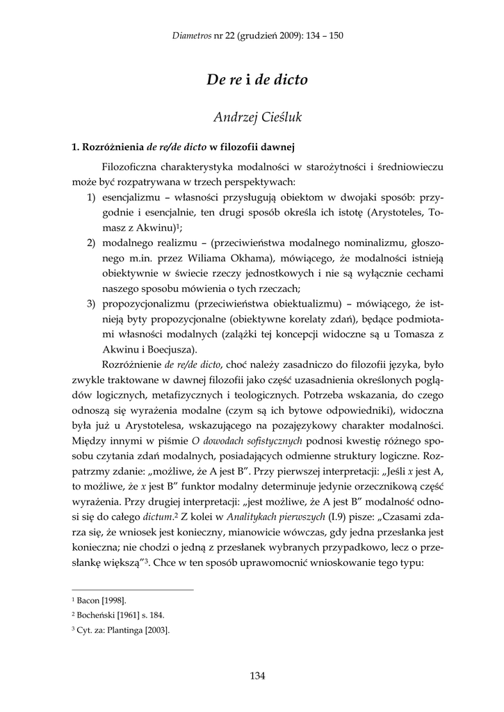 Diametros nr 22 (grudzień 2009): 134 – 150 De re i de dicto Andrzej Cieśluk 1. RozróŜnienia de re/de dicto w filozofii dawnej Filozoficzna charakterystyka modalności w staroŜytności i średniowieczu moŜe być rozpatrywana w trzech perspektywach: 1) esencjalizmu – własności przysługują obiektom w dwojaki sposób: przygodnie i esencjalnie, ten drugi sposób określa ich istotę (Arystoteles, Tomasz z Akwinu)1; 2) modalnego realizmu – (przeciwieństwa modalnego nominalizmu, głoszonego m.in. przez Wiliama Okhama), mówiącego, Ŝe modalności istnieją obiektywnie w świecie rzeczy jednostkowych i nie są wyłącznie cechami naszego sposobu mówienia o tych rzeczach; 3) propozycjonalizmu (przeciwieństwa obiektualizmu) – mówiącego, Ŝe istnieją byty propozycjonalne (obiektywne korelaty zdań), będące podmiotami własności modalnych (zaląŜki tej koncepcji widoczne są u Tomasza z Akwinu i Boecjusza). RozróŜnienie de re/de dicto, choć naleŜy zasadniczo do filozofii języka, było zwykle traktowane w dawnej filozofii jako część uzasadnienia określonych poglądów logicznych, metafizycznych i teologicznych. Potrzeba wskazania, do czego odnoszą się wyraŜenia modalne (czym są ich bytowe odpowiedniki), widoczna była juŜ u Arystotelesa, wskazującego na pozajęzykowy charakter modalności. Między innymi w piśmie O dowodach sofistycznych podnosi kwestię róŜnego sposobu czytania zdań modalnych, posiadających odmienne struktury logiczne. Rozpatrzmy zdanie: „moŜliwe, Ŝe A jest B”. Przy pierwszej interpretacji: „Jeśli x jest A, to moŜliwe, Ŝe x jest B” funktor modalny determinuje jedynie orzecznikową część wyraŜenia. Przy drugiej interpretacji: „jest moŜliwe, Ŝe A jest B” modalność odnosi się do całego dictum.2 Z kolei w Analitykach pierwszych (I.9) pisze: „Czasami zdarza się, Ŝe wniosek jest konieczny, mianowicie wówczas, gdy jedna przesłanka jest konieczna; nie chodzi o jedną z przesłanek wybranych przypadkowo, lecz o przesłankę większą”3. Chce w ten sposób uprawomocnić wnioskowanie tego typu: 1 Bacon [1998]. 2 Bocheński [1961] s. 184. 3 Cyt. za: Plantinga [2003]. 134 Andrzej Cieśluk De re i de dicto 1.1 KaŜde zwierzę w tym pokoju jest człowiekiem. 1.2 KaŜdy człowiek jest z konieczności rozumny. --------------------------------------------------------------------------------------1.3 KaŜde zwierzę w tym pokoju jest z konieczności rozumne. Rekonstrukcja tego wnioskowania w języku sylogistyki wygląda następująco: 1.1’ ZaC 1.2’ C a KR ------------------1.3’ Z a KR Arystoteles akceptował powyŜsze wnioskowanie (podpada ono bowiem pod sylogizm Barbara). Nie rozumiał on jednak 1.3 jako 1.3”: 1.3” Z konieczności jest tak, Ŝe kaŜde zwierzę w tym pokoju jest rozumne. Wnioskowanie, które zawiera 1.3”, jest niepoprawne. Ma ono następującą postać: 1.1” Z a C 1.2” K(C a R) -------------------1.3” K(Z a R) Zatem musimy rozumieć 1.3 jako roszczenie do tego, Ŝe kaŜde zwierzę w tym pokoju ma pewną własność, mianowicie bycia rozumnym – przysługującą mu w sposób konieczny (istotny). Dlatego teŜ zwrot (1.3) musi być odczytywany de re. Innymi słowy zwrot ten nie jest odczytywany jako modalność odnosząca się do pewnego dictum, czy sądu w sensie logicznym (kaŜde zwierzę w tym pokoju jest rozumne), lecz raczej jako twierdzenie, Ŝe kaŜde zwierzę w tym pokoju jest rozumne z istoty4. Modalność de dicto charakteryzowała u Arystotelesa zdanie łączne (compositio), modalność typu de re charakteryzuje zdanie rozłączne (divisio)5. Dlatego zdanie: „Białe moŜe być czarne” jest fałszywe w przypadku modalności de dicto, nie moŜna bowiem orzekać o czymś, co jest zarazem białe i czarne. Natomiast w przypadku odczytania de re, jest prawdziwe, to co jest białe, moŜe stać się czarne6. Zagadnienie sądów modalnych z jakichś powodów stało się mało frapujące i dopiero szesnaście wieków później do tej tematyki powraca Piotr Abelard. W 4 Bocheński [1961] s. 182-187. Zdania łączne, to te, które mają dwa orzeczenia połączone spójnikiem „i”, rozłączne natomiast połączone spójnikiem „lub”, „albo”. 5 6 śegleń [1990] s. 28. 135 Andrzej Cieśluk De re i de dicto swoich komentarzach do O interpretacji Arystotelesa stwierdza, Ŝe sądy modalne mogą być interpretowane na dwa sposoby: a) w interpretacji de re, gdzie sąd modalny jest twierdzeniem dotyczącym rzeczy; b) w interpretacji de sensu, gdzie modalność jest orzekana o znaczeniach, bądź o wyraŜeniach. Idąc śladami Arystotelesa modalność de re/de sensu jest utoŜsamiana przez Abelarda jako swoisty rodzaj wieloznaczności semantycznej. WaŜne jest jednak to, Ŝe Abelard wprowadza sam termin de re, dostrzega równieŜ róŜnicę pomiędzy modalnością rzeczy a modalnością językową7. Po stu latach do zagadnienia tego wrócił Tomasz z Akwinu – wprowadzając termin de dicto. W „Summa contra gentiles” podejmuje zagadnienie wszechwiedzy Boga, które utoŜsamia z jego spoglądaniem na świat. RozwaŜa zdanie: 1.4 Co jest widziane (przez Boga) jako siedzące, siedzi z konieczności. Argumentuje, Ŝe wszechwiedza ta nie stoi w konflikcie z ludzką wolnością, bowiem 1.4 moŜe byś interpretowane na dwa sposoby: 1.4’ 1.4” Z konieczności jest prawdą, Ŝe to, co jest widziane jako siedzące, siedzi. Cokolwiek jest widziane jako siedzące, ma własność siedzenia z istoty. Tomasz zauwaŜa, Ŝe tylko w przypadku 1.4” moŜna mówić o zanegowaniu wolności ludzkiej. Skoro Bóg wie dokładnie jak postąpię, to w jakiś sposób moje postępowanie jest zdeterminowane. Tomasz stara się pokazać, Ŝe nie jesteśmy zdeterminowani, poniewaŜ konieczność moŜe tu być rozumiana dwojako. Opowiada się za rozumieniem de dicto, które jego zdaniem nie prowadzi do zanegowania wolności8. Z kolei w De Propositionibus Modalibus pisze następująco: „Sąd modalny występ