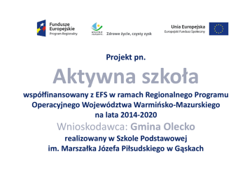 Projekt pn. Aktywna szkoła współfinansowany z EFS w ramach Regionalnego Programu Operacyjnego Województwa Warmińsko-Mazurskiego na lata 2014-2020 Wnioskodawca: Gmina Olecko realizowany w Szkole Podstawowej im. Marszałka Józefa Piłsudskiego w Gąskach Wartość projektu – 351 658,73 PLN w tym: - wkład Funduszy Europejskich – 298 909,92 PLN - dotacja celowa z budżetu krajowego – 34 568,11 PLN - wkład własny – środki JST – 18 180,70 PLN Czas realizacji od 01 lutego 2017r. do 31 sierpnia 2018r. tj. 19 miesięcy Cel projektu Podniesienie jakości oferty edukacyjnej Szkoły Podstawowej im. Marszałka Józefa Piłsudskiego w Gąskach (dalej SPG) poprzez: - wzrost umiejętności i kompetencji zawodowych 12 nauczycieli, - organizację dodatkowych zajęć rozwijających kompetencje kluczowe dla 65 uczniów, - doposażenie szkoły w sprzęt i pomoce dydaktyczne - organizację warsztatów wspierających i zwiększających wiedzę /umiejętności dla 55 rodziców/opiekunów Planowane efekty SZKOŁA • Wyposażenie w szkolną sieć komputerową, sprzęt TIK, pomoce dydaktyczne do prowadzenia zajęć edukacyjnych. W ramach projektu wytworzone będą 2 e-skrypty, 4 roboty, 4 prezentacje z eksperymentu, 4 prezentacje z projektowania, 4 prezentacje z planowania strategicznego, 5 projektów edukacyjnych, gazetka w formie elektronicznej . NAUCZYCIELE • 12 nauczycieli nabędzie kompetencje cyfrowe, 5 nauczycieli nabędzie kompetencje w zakresie kształtowania u uczniów kompetencji matematyczno przyrodniczych, kreatywności, umiejętności pracy zespołowej. UCZNIOWIE • 59 uczniów nabędzie kompetencje kluczowe. RODZICE/ OPIEKUNOWIE • U 30 osób spośród rodziców/opiekunów prawnych nastąpi wzrost wiedzy z zakresu motywowania i kształtowania kreatywności. U 40 osób nastąpi wzrost wiedzy z zakresu bezpieczeństwa w sieci. Grupa docelowa 65 osób – uczennice i uczniowie SPG, 10-13 lat 12 osób – nauczycielki i nauczyciele SPG 55 osób – rodzice, opiekunowie prawni uczniów SPG ZADANIA Doposażenie bazy dydaktycznej SPG w nowoczesne pomoce oraz narzędzia TIK niezbędne do realizacji programów nauczania oraz zapewnienie odpowiedniej infrastruktury sieciowo usługowej. Organizacja doskonalenia zawodowego nauczycieli SPG w obszarze kompetencji przyrodniczych i/lub cyfrowych. Organizacja dodatkowych form wsparcia skierowanych do uczniów i ich rodziców. I. Doposażenie bazy dydaktycznej SPG • szkolna sieć komputerowa • przenośny komputer z zestawem słuchawkowym dla nauczyciela (1) i ucznia (20) • szafa do przechowywania i bezpiecznego przemieszczania pomiędzy salami lekcyjnymi przenośnych komputerów dla uczniów • sieciowe urządzenie wielofunkcyjne współpracujące z komputerem (kolor, drukowanie, kopiowanie i skanowanie) • • • • • • • • drukarka 3 D umożliwiająca przestrzenne drukowanie monitor interaktywny z oprogramowaniem Wizualizer oprogramowanie Corel do projektowania grafiki, edycji zdjęć cyfrowy aparat fotograficzny dyktafon zestawy konstrukcyjne klocków Lego (wraz z oprogramowaniem) umożliwiające konstruowanie robotów, budowanie maszyn, urządzeń technicznych oraz budowli gry dydaktyczne tematyczne II. Organizacja doskonalenia zawodowego nauczycieli Szkolenie nauczycieli w zakresie kształtowania u uczniów kompetencji matematyczno przyrodniczych, kreatywności, umiejętności pracy zespołowej pn. DLA PRZYSZŁOŚCI (40 godz. IV – V 2017) Szkolenie nauczycieli różnych przedmiotów w zakresie kompetencji cyfrowych i korzystania z narzędzi TIK pn. E_NAUCZYCIEL (40 godz. V - VI 2017) III. Organizacja dodatkowych form wsparcia Warsztaty MAŁY ODKRYWCA wrzesień 2017r. – czerwiec 2018r. ROBOTYKA EKSPERYMENT MAŁY ARCHITEKT Warsztaty UCZEŃ W CYFROWEJ PRZYGODZIE edukacja medialna wrzesień 2017r. – czerwiec 2018r. MAŁY FINANSISTA Wyjazd naukowy dla uczniów LETNIA SZKOŁA AKTYWNOŚCI warsztaty w bezpośrednim środowisku naukowym Gdańsk, Gdynia lipiec 2018 Warsztaty wspierające dla rodziców/opiekunów DZIECKO BEZPIECZNE W SIECI I PRZY KOMPUTERZE czerwiec 2017 czerwiec 2018 REKRUTACJA GRUPY DOCELOWEJ • dla nauczycieli/nauczycielek: luty – marzec 2017r. • dla uczniów/uczennic: kwiecień 2017r. • dla rodziców: kwiecień 2017r. Opracowała: Dyrektor Szkoły Podstawowej im. Marszałka Józefa Piłsudskiego w Gąskach Janina Rękawek