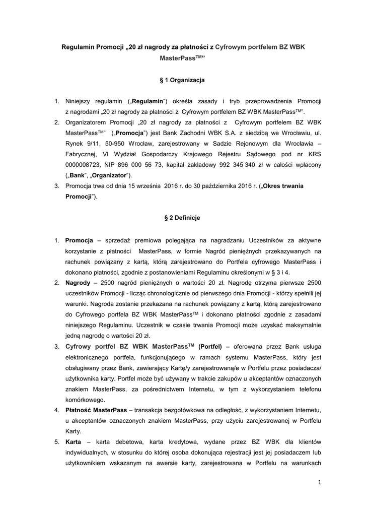 Regulamin Promocji „20 zł nagrody za płatności z Cyfrowym portfelem BZ WBK MasterPassTM” § 1 Organizacja 1. Niniejszy regulamin („Regulamin”) określa zasady i tryb przeprowadzenia Promocji z nagrodami „20 zł nagrody za płatności z Cyfrowym portfelem BZ WBK MasterPassTM”. 2. Organizatorem Promocji „20 zł nagrody za płatności z Cyfrowym portfelem BZ WBK MasterPassTM” („Promocja”) jest Bank Zachodni WBK S.A. z siedzibą we Wrocławiu, ul. Rynek 9/11, 50-950 Wrocław, zarejestrowany w Sadzie Rejonowym dla Wrocławia – Fabrycznej, VI Wydział Gospodarczy Krajowego Rejestru Sądowego pod nr KRS 0000008723, NIP 896 000 56 73, kapitał zakładowy 992 345 340 zł w całości wpłacony („Bank”, „Organizator”). 3. Promocja trwa od dnia 15 września 2016 r. do 30 października 2016 r. („Okres trwania Promocji”). § 2 Definicje 1. Promocja – sprzedaż premiowa polegająca na nagradzaniu Uczestników za aktywne korzystanie z płatności MasterPass, w formie Nagród pieniężnych przekazywanych na rachunek powiązany z kartą, którą zarejestrowano do Portfela cyfrowego MasterPass i dokonano płatności, zgodnie z postanowieniami Regulaminu określonymi w § 3 i 4. 2. Nagrody – 2500 nagród pieniężnych o wartości 20 zł. Nagrodę otrzyma pierwsze 2500 uczestników Promocji - licząc chronologicznie od pierwszego dnia Promocji - którzy spełnili jej warunki. Nagroda zostanie przekazana na rachunek powiązany z kartą, którą zarejestrowano do Cyfrowego portfela BZ WBK MasterPassTM i dokonano płatności zgodnie z zasadami niniejszego Regulaminu. Uczestnik w czasie trwania Promocji może uzyskać maksymalnie jedną nagrodę o wartości 20 zł. 3. Cyfrowy portfel BZ WBK MasterPassTM (Portfel) – oferowana przez Bank usługa elektronicznego portfela, funkcjonującego w ramach systemu MasterPass, który jest obsługiwany przez Bank, zawierający Kartę/y zarejestrowaną/e w Portfelu przez posiadacza/ użytkownika karty. Portfel może być używany w trakcie zakupów u akceptantów oznaczonych znakiem MasterPass, za pośrednictwem Internetu, w tym z wykorzystaniem telefonu komórkowego. 4. Płatność MasterPass – transakcja bezgotówkowa na odległość, z wykorzystaniem Internetu, u akceptantów oznaczonych znakiem MasterPass, przy użyciu zarejestrowanej w Portfelu Karty. 5. Karta – karta debetowa, karta kredytowa, wydane przez BZ WBK dla klientów indywidualnych, w stosunku do której osoba dokonująca rejestracji jest jej posiadaczem lub użytkownikiem wskazanym na awersie karty, zarejestrowana w Portfelu na warunkach 1 zawartych w Regulaminie korzystania z Cyfrowego portfela BZ WBK MasterPass™ (znajdującym się na stronie https://masterpass.bzwbk.pl.) i umożliwiająca dokonywanie transakcji bezgotówkowych na odległość za pośrednictwem Internetu. 6. Visa – Visa Europe - organizacja wydawców kart płatniczych, we współpracy z którą Bank wydaje Karty typu Visa i za której pośrednictwem następuje rozliczanie transakcji zleconych przy pomocy tych Kart, 7. MasterCard – Mastercard International SA - organizacja wydawców Kart płatniczych, we współpracy z którą Bank wydaje Karty MasterCard i Maestro, za pośrednictwem której następuje rozliczanie transakcji dokonanych przy pomocy tych Kart, 8. Uczestnik - osoba określona w § 3 ust. 1. § 3 Uczestnicy 1. Uczestnik – osoba fizyczna posiadająca pełną zdolność do czynności prawnych, która jest posiadaczem/użytkownikiem karty debetowej dla klientów indywidualnych, posiadaczem/użytkownikiem karty kredytowej, która spełni łącznie poniższe warunki w okresie trwania promocji: - zapisze dane przynajmniej jednej Karty w Portfelu - wykona minimum 1 płatność MasterPass na kwotę minimum 30zł. 2. Z udziału w Promocji wyłączeni są pracownicy Organizatora zaangażowani bezpośrednio w realizację Promocji. § 4 Warunki promocji 1. Z Promocji może skorzystać każdy Uczestnik spełniający warunki wskazane w § 3. 2. Uczestnik Promocji może otrzymać Nagrodę w wysokości max. 20 zł jeśli, z zastrzeżeniem ust. 1, nie usunie danych dodanej Karty w Portfelu przynajmniej do 10 listopada 2016r. 3. Uczestnik może otrzymać tylko 1 Nagrodę. 4. Uczestnik nie może przenieść prawa do otrzymania Nagrody na osoby trzecie. 5. Uczestnik nie może domagać się zamiany Nagrody na inną. 6. Weryfikacja spełnienia przez Uczestników warunków wskazanych w niniejszym Regulaminie nastąpi do 30 listopada 2016 r. Nagroda zostanie przyznana i przekazana na rachunek powiązany z Kartą, którą zarejestrowano do Portfela i dokonano płatności, do dnia 15 grudnia 2016 r. 7. Wartość Nagród przewidzianych w Promocji jest zwolniona z podatku dochodowego od osób fizycznych na podstawie art. 21 ust.1 pkt 68 ustawy z dnia 26 lipca 1991 r. o podatku dochodowym od osób fizycznych (Dz.U. z 2012 , poz.361 z pózn. zm.). 8. Limit Nagród w promocji wynosi 50 000 zł brutto. § 5 Reklamacje 2 1. Uczestnik może złożyć reklamację: a. ustnie: osobiście lub telefonicznie w dowolnej jednostce organizacyjnej Banku zajmującej się obsługą klienta; b. pisemnie: przesyłką pocztową na adres siedziby Banku lub jego dowolnej jednostki organizacyjnej zajmującej się obsługą klienta lub poprzez kuriera lub posłańca lub osobiście w dowolnej jednostce organizacyjnej Banku zajmującej się obsługą klienta; c. w formie elektronicznej: poprzez formularz reklamacyjny na stronie internetowej Banku lub poprzez usługę BZWBK24 Internet. 2. Odpowiednie adresy oraz numery telefonów dostępne są w jednostkach organizacyjnych Banku zajmujących się obsługą klienta oraz wskazane są na stronie internetowej Banku www.bzwbk.pl. 3. Odpowiedź na reklamację, w zależności od charakteru sprawy oraz wyboru klienta, zostanie udzielona przez Bank listownie lub poprzez skrzynkę odbiorczą w BZWBK24 lub sms, bez zbędnej zwłoki, jednak nie później niż w terminie 30 dni od dnia otrzyman