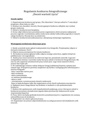 Regulamin konkursu fotograficznego „Doceń wartość życia” Zasady ogólne 1. Organizatorem konkursu jest grupa „The Absorbers”, biorąca udział w 7-mej edycji programu „Mam haka na raka”. 2. Konkurs ma charakter otwarty. Rozstrzygnięcie konkursu odbędzie się w jednej grupie wiekowej. 3. Udział w konkursie jest bezpłatny. 4. Oceny zdjęć dokona Jury powołane przez organizatora, które przyzna najlepszym pracom nagrody i wyróżnienia. Jedna osoba może zdobyć tylko jedną nagrodę w ramach całego konkursu. Decyzje Jury są ostateczne. 5. Udział w konkursie jest jednoznaczny z akceptacją niniejszego regulaminu. Wymagania techniczne dotyczące prac 1. Każdy uczestnik może zgłosić maksymalnie trzy fotografie. Przyjmujemy zdjęcia w formacie minimum 15x21. 2. Zdjęcia muszą nawiązywać do tematu konkursu. 3. Do konkursu można zgłaszać tylko zdjęcia swojego autorstwa, nigdzie dotąd nie publikowane i nie nagradzane. 4. Każda praca musi zawierać na odwrocie logo tzn. pseudonim autorski. Logo jest zastępnikiem imienia i nazwiska osoby biorącej udział w konkursie fotograficznym. Ma ono na celu zapewnić anonimowość przy ocenie prac. Logo może stanowić słowo, zestaw liter bądź cyfr. 5. Do nadesłanego zestawu należy dołączyć drugą (zaklejoną) kopertę, opisaną tym samym logo. W kopercie powinna znajdować się kartka z następującymi informacjami o autorze fotografii: -imię i nazwisko autora prac -data urodzenia -adres zamieszkania -nr telefonu kontaktowego -adres e-mail - oświadczenie o przetwarzaniu danych osobowych. Dane te będą dostępne tylko dla organizatora aż do chwili wyłonienia zwycięzców. 6. Najlepsze prace mogą ukazać się drukiem w mediach w celu podsumowania konkursu. 7. Rodzice lub opiekunowie osób niepełnoletnich podpisują, wraz z biorącym udział w konkursie powyższe oświadczenie (zgoda także powinna być dołączona do wyżej wspomnianej koperty). 8. Prace, które nie będą spełniały kryteriów przedstawionych w regulaminie nie zostaną zakwalifikowane do konkursu. 9. Organizator nie odsyła zgłoszonych prac. 10. Organizator nie ponosi odpowiedzialności za usługi pocztowe lub działalność osób trzecich. 11. Prace konkursowe należy dostarczyć osobiście do sekretariatu I LO w Świeciu ul. Gimnazjalna 3 86-100 Świecie Terminarz 1. Konkurs trwa od 20 stycznia do 13 lutego 2014 roku. 2. Prace nadesłane po terminie nie będą brane pod uwagę w konkursie. Znaczenie ma data nadania stempla pocztowego! 3. Ocena prac przez Jury nastąpi w terminie od 13 do 19 lutego 2014roku. 4. Decyzja Jury jest ostateczna i nie podlega weryfikacji. 5. Wyniki konkursu zostaną podane 19 lutego 2014 roku na otwarciu wystawy fotograficznej w I Liceum Ogólnokształcącym w Świeciu. Wszyscy laureaci zostaną powiadomieni drogą elektroniczną i telefonicznie o dokładnej dacie i godzinie spotkania.