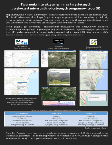 Tworzeniu interaktywnych map turystycznych z wykorzystaniem ogólnodostępnych programów typu GIS Mapa turystyczna w wersji elektronicznej stanowi podstawowe źródło informacji dla podróżujących. Możliwość odtworzenia dowolnego fragmentu mapy za pomocą telefonu komórkowego stało się rzeczą naturalną i ogólnie dostępną. Tworzenie własnych map z możliwościom interaktywnej edycji oraz odtwarzania stało się dostępne dla każdego w dowolnym miejscu i czasie. Celem projektu jest stworzenie i przedstawienie praktycznych oraz rzeczywistych informacji w formie map tematycznych, wykonanych przy użyciu wybranych, ogólnodostępnych programach typu GIS, wykorzystujących wykonane ślady z ręcznych odbiorników GPS, fotografie oraz zbiór danych o terenie. Wykorzystano następujące (bezpłatne) programy graficzne: ArcGis Online Źródło: www.arcgis.com Google Earth Źródło: www.earth.google.com Ikona programu QGIS Źródło: www.qgis.org Rysunki przedstawiające stworzone trasy turystyczne przy wykorzystaniu poszczególnych programów typu GIS. Źródło: opracowanie własne Tabela 1. Porównanie funkcjonalności poszczególnych programów ArcGIS Online Google Earth Quantum GIS - darmowy po zalogowaniu - interaktywny - możliwość udostępniania - łatwy w obsłudze - wymagany dostęp do Internetu - darmowy - interaktywny - brak możliwości udostępniania -bardzo łatwy w obsłudze -wymagany dostęp do Internetu - darmowy - mało funkcjonalny - brak możliwości udostępniania - wymagający dużego nakładu pracy - niewymagany dostęp do Internetu Źródło: opracowanie własne Wnioski: Przedstawienie tras turystycznych za pomocą programów GIS daje uporządkowaną wizualizacje przestrzeni. Taki rodzaj map wpływa na wyobraźnię odbiorcy, pomaga w przygotowaniu się do trasy, informuje o niedogodnościach oraz zachęca do zwiedzania.