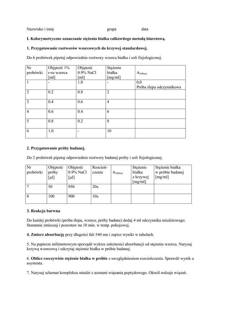Nazwisko i imię grupa data I. Kolorymetryczne oznaczanie stężenia białka całkowitego metodą biuretową. 1. Przygotowanie roztworów wzorcowych do krzywej standardowej. Do 6 probówek pipetuj odpowiednie roztwory wzorca białka i soli fizjologicznej. 1 Objętość 1% r-ru wzorca [ml] - Objętość 0.9% NaCl [ml] 1.0 Stężenie białka [mg/ml] - 2 0.2 0.8 2 3 0.4 0.6 4 4 0.6 0.4 6 5 0.8 0.2 8 6 1.0 - 10 Nr probówki A540nm 0,0 Próba ślepa odczynnikowa 2. Przygotowanie próby badanej. Do 2 probówek pipetuj odpowiednio roztwory badanej próby i soli fizjologicznej. Nr probówki Objętość próby [l] Objętość 0.9% NaCl [l] Rozcieńczenie 7 50 950 20x 8 100 900 10x A540nm Stężenie białka z krzywej [mg/ml] Stężenie białka w próbie badanej [mg/ml] 3. Reakcja barwna Do każdej probówki (próba ślepa, wzorce, próby badane) dodaj 4 ml odczynnika miedziowego. Starannie zmieszaj i pozostaw na 10 min. w temp. pokojowej. 4. Zmierz absorbację przy długości fali 540 nm i zapisz wyniki w tabelach. 5. Na papierze milimetrowym sporządź wykres zależności absorbancji od stężenia wzorca. Narysuj krzywą wzorcową i odczytaj stężenie białka w próbie badanej. 6. Oblicz rzeczywiste stężenie białka w próbie z uwzględnieniem rozcieńczenia. Sprawdź wynik u asystenta. 7. Narysuj schemat kompleksu miedzi z azotami wiązania peptydowego. Określ rodzaje wiązań. II. Spektrofotometryczne oznaczanie stężenia białka w obecności kwasów nukleinowych 1. Przygotowanie próby badanej do pomiaru absorbancji UV. Do probówki pipetuj odpowiednio roztwór soli fizjologicznej i badanej próby. Dokładnie wymieszaj. Objętość 0.9% NaCl Objętość próby 3 ml 30 μl Rozcieńczenie A280 A260 Stężenie białka w próbie badanej [mg/ml] 2. Zmierz absorbację przy obu długościach fal w spektrofotometrze UV i zapisz wyniki w tabeli. 3. Oblicz rzeczywiste stężenie białka w próbie z uwzględnieniem rozcieńczenia. c [mg/ml] = 1,55 A280 – 0,76 A260 Wynik porównaj z uzyskanym w metodzie kolorymetrycznej. Sprawdź wynik u asystenta. III. Odpowiedz na pytania i rozwiąż zadania. 1. Zgodnie z prawem Lamberta-Beera absorbancja jest ……. Napisz wzór i opisz jego składowe. 2. Czy białka mogą absorbować promieniowanie elektromagnetyczne w zakresie widzialnym? 3. Jakie ugrupowania chemiczne odpowiadają za absorpcję promieniowania ultrafioletowego przez białka? Jakie jest max tej absorpcji? 4. Jakie ugrupowania chemiczne absorbują promieniowanie UV w kwasach nukleinowych? Jakie jest max tej absorpcji? 5. A280 dla 1% roztworu albuminy surowicy bydlęcej wynosi 6.6. Jaka będzie absorbancja roztworu o stężeniu 2.5 mg/ml (kuweta 1 cm)? 6. Pobrano 0.3 ml surowicy pacjenta i rozcieńczono, dodając 2.7 ml roztworu soli fizjologicznej. Wykonano reakcję biuretową; odczytana absorbancja wynosiła 0.4. Absorbancja roztworu wzorca o stężeniu 5.0 mg/ml wynosi 0.25. Podaj stężenie białka w surowicy pacjenta w g/100 ml i g/l. 7. Surowicę rozcieńczono 20×. Oznaczono białko metodą biuretową. Wartość absorbancji rozcieńczonej próby wyniosła 0.3. Wykorzystując krzywą standardową zamieszczoną poniżej, oblicz stężenie białka w surowicy w g/100 ml i g/l. 8. Współczynnik absorpcji (k280) dla 1% roztworu trypsyny wynosi 14.3 w 1 cm kuwecie. Jakie jest stężenie roztworu tego enzymu, jeśli A280=1.5 w kuwecie o grubości 0.5 cm?