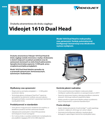 Drukarka atramentowa do druku ciągłego Videojet 1610 Dual Head Model 1610 Dual Head to maksymalny czas sprawności, funkcje automatycznej konfiguracji i konserwacji oraz dwukrotnie wyższa wydajność. Drukarka atramentowa Videojet 1610 Dual Head do druku ciągłego została stworzona z myślą o drukowaniu w dwóch miejscach na jednym produkcie oraz do zastosowań sieciowych na wielu liniach jednocześnie. Specjalna konstrukcja zapewnia 12 000 godz. pracy urządzenia pomiędzy przeglądami. Model 1610 Dual Head idealnie sprawdza się w przemyśle spożywczym, farmaceutycznym, tytoniowym i budowlanym. Wydłużony czas sprawności Kontrola jakości nadruków • Długie przerwy pomiędzy przeglądami — 12 000 godzin żywotności rdzenia • Chroni przed kosztownymi błędami znakowania dzięki interfejsowi użytkownika opartemu na oprogramowaniu CLARiTY • Technologia głowicy drukującej CleanFlow™ ogranicza gromadzenie się atramentu, wydłuża czas pracy głowicy drukującej pomiędzy czyszczeniami i gwarantuje niezmiennie wysoką jakość druku • Starannie opracowane kreatory ułatwiają prawidłowe ustawienie oznaczeń i eliminują możliwość popełnienia błędu Produktywność w standardzie Prosta obsługa • Dwie głowice mogą pracować niezależnie lub wspólnie, co dodatkowo poszerza wachlarz zastosowań drukarki • System dostarczania płynów SmartCartridgeTM w pełni zapobiega wyciekom i odpływom, eliminując tym samym odpad • Zabezpieczenie przed pyłem o klasie IP65 (powietrze technologiczne nie jest wymagane) • Automatyczna konfiguracja, kalibracja i regulacja głowic drukujących, zapewniająca niezmiennie wysoką jakość pracy • Do 5 wierszy druku o wysokiej rozdzielczości na każdą głowicę przy prędkości sięgającej 293 m/min (960 stóp/min) • Kolejny sposób na ograniczenie błędów polega na pobieraniu danych bezpośrednio z systemów bazodanowych Videojet® 1610 Dual Head Drukarka atramentowa do druku ciągłego Maksymalna szybkość liniowa (na głowicę) Głowice drukujące Możliwość drukowania od 1 do 5 wierszy przy prędkościach linii do 293 m/min (960 stóp/min) (10 znaków na cal, przy jednym wierszu druku) Podgrzewana głowica drukująca Układ dopływu powietrza (standard) Automatyczna kalibracja Konstrukcja umożliwiająca automatyczne czyszczenie Średnica: 41,3 mm (1,63 cala) Długość: 269,8 mm (10,62 cala) Konfiguracja matrycy czcionki Jeden wiersz: 5x5, 4x7, 5x7, 7x9, 9x12, 10x16, 16x24, 25x34 Dwa wiersze: 5x5, 5x7, 7x9, 9x12, 10x16 Trzy wiersze: 5x5, 4x7, 5x7, 7x9 Cztery wiersze: 5x5, 4x7, 5x7 Pięć wierszy: 5x5 Liniowe kody kreskowe UPC A&E; EAN 8 & 13; kod 128 A, B & C; UCC/EAN 128; kod 39; przeplatany 2 z 5; 2D DataMatrix; GS1 Kody DataMatrix 10x10, 12x12, 14x14, 16x16, 8x18, 18x18, 20x20, 22x22, 24x24, 16x26, 26x26, 8x32, 32x32, 34x34, 12x36, 16x36, 16x48 Znamionowa wysokość znaku Zintegrowane przewody głowic drukujących Bardzo elastyczne Długość: 3 m, opcja 6 m Średnica: 23 mm (0,91 cala) Promień gięcia: 101,6 mm (4,00 cala) Pojemniki z płynem Wkład tuszu typu Smart Cartridge™ 750 ml (0,793 kwarty) Smart Cartridge z płynem uzupełniającym 750 ml (0,793 qt) Zakres temperatury/wilgotności Do wyboru od 2 mm (0,079 cala) do 10 mm (0,40 cala), w zależności od czcionki od 0°C do 50°C (od 32°F do 122°F) wilgotność względna: od 0% do 90% bez kondensacji Odległość natrysku W przypadku niektórych tuszów rzeczywista instalacja może wymagać dodatkowego osprzętu stosownie do warunków środowiska produkcyjnego Optymalna: 12 mm (0,472 cala) Zakres: Od 5 mm (0,197 cala) do 15 mm (0,591 cala) Wymagania dotyczące instalacji elektrycznej Klawiatura Membranowa, z dotykowym potwierdzeniem naciśnięcia; 72 klawisze numeryczne, alfabetyczne i specjalne klawisze funkcyjne. Układ przypominający klawiaturę komputera, by zachować zgodność z międzynarodowymi standardami. Wyświetlacz Ekran LCD o rozdzielczości 320x240 i przekątnej 5,7 cala z jasnym, niebieskim podświetleniem Edycja nadruku na ekranie w trybie WYSIWYG Własne logo/grafiki Zasilanie znamionowe 100–120/200–240 V AC przy 50/60 Hz, 120 W Masa w przybliżeniu Rozpakowana i sucha: 22 kg 48,6 funta Opcje Osuszacz powietrza do wilgotnego środowiska (wymaga powietrza z fabryki) Wersja dopuszczona do kontaktu z żywnością Dysza o rozmiarze 60 lub 70 mikronów Głowica drukująca pod kątem 90 stopni Szeroka gama akcesoriów Opcjonalne oprogramowanie Videojet Logo Creator umożliwia użytkownikom tworzenie logo i grafik za pomocą komputera lub drukarki 361 mm (14,23 cala) 480 mm (18,90 cala) chiński, rosyjski/bułgarski, turecki/skandynawski, grecki, arabski, japoński/kanji, hebrajski, koreański, wschodnioeuropejski oraz europejski/amerykański 249,1 mm (9,80 cala) 209,1 mm (8,23 cala) Języki i opcje interfejsu angielski, arabski, bułgarski, chiński uproszczony, chiński tradycyjny, czeski, duński, fiński, francuski, grecki, hebrajski, hiszpański, holenderski, japoński, koreański, niemiecki, norweski, polski, portugalski, rosyjski, szwedzki, tajski, turecki, węgierski, wietnamski i włoski 553 mm (21,77 cala) 269,8 mm (10,62 cala) Interfejs danych RS232, RS485 i Ethernet (standard) Clarisoft/Clarinet® przez RS232 i Ethernet Zarządzanie nadrukami przez USB Przechowywanie informacji 250 złożonych komunikatów 10 mm (0,40 cala) 10 mm (0,40 cala) Zestawy znaków 41,3 mm (1,63 cala) 338 mm (13,30 cala) 345 mm (13,58 cala) Ochrona środowiska IP65 jako standard, brak konieczności zasilania powietrzem, obudowa ze stali nierdzewnej Zadzwoń pod numer 887 444 600 odwiedź stronę www.videojet.pl lub napisz na adres [email protected] Videojet Technologies Sp. z o.o Ul. Kolejowa 5/7 01-217 Warszawa, Polska © 2013 Videojet Technologies Sp. z o.o. — wszelkie prawa zastrzeżone. Polityka firmy Videojet Technologies Inc. przewiduje ciągłe doskonalenie oferowanych produktów. Zastrzegamy sobie prawo do wprowadzania zmian k