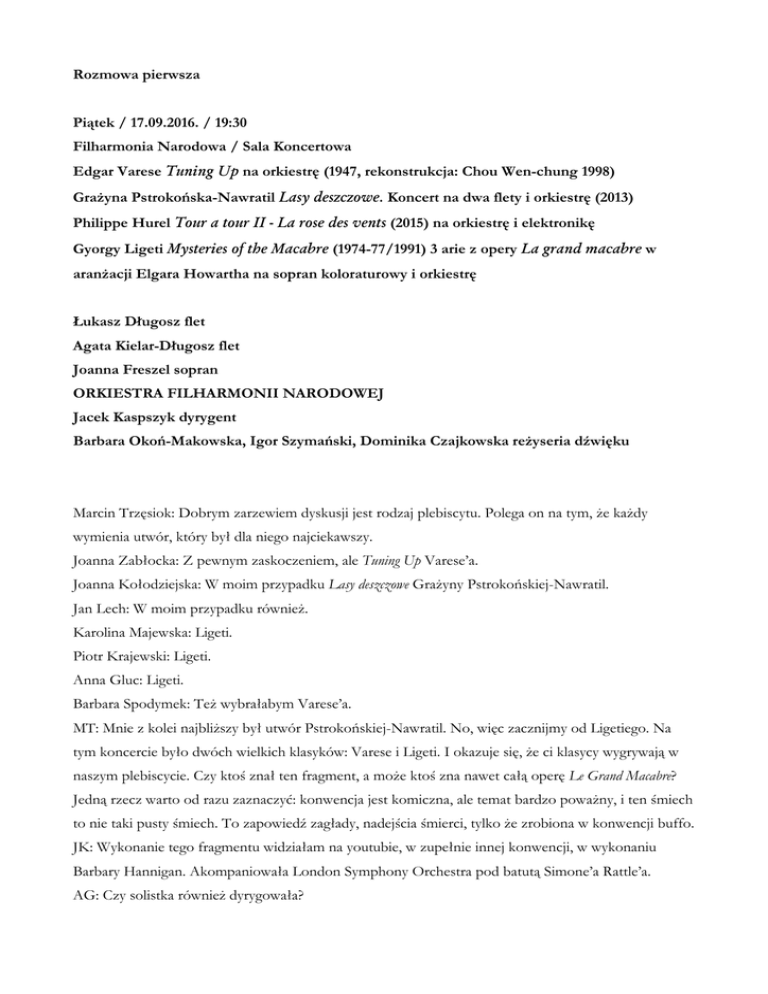 Rozmowa pierwsza Piątek / 17.09.2016. / 19:30 Filharmonia Narodowa / Sala Koncertowa Edgar Varese Tuning Up na orkiestrę (1947, rekonstrukcja: Chou Wen-chung 1998) Grażyna Pstrokońska-Nawratil Lasy deszczowe. Koncert na dwa flety i orkiestrę (2013) Philippe Hurel Tour a tour II - La rose des vents (2015) na orkiestrę i elektronikę Gyorgy Ligeti Mysteries of the Macabre (1974-77/1991) 3 arie z opery La grand macabre w aranżacji Elgara Howartha na sopran koloraturowy i orkiestrę Łukasz Długosz flet Agata Kielar-Długosz flet Joanna Freszel sopran ORKIESTRA FILHARMONII NARODOWEJ Jacek Kaspszyk dyrygent Barbara Okoń-Makowska, Igor Szymański, Dominika Czajkowska reżyseria dźwięku Marcin Trzęsiok: Dobrym zarzewiem dyskusji jest rodzaj plebiscytu. Polega on na tym, że każdy wymienia utwór, który był dla niego najciekawszy. Joanna Zabłocka: Z pewnym zaskoczeniem, ale Tuning Up Varese’a. Joanna Kołodziejska: W moim przypadku Lasy deszczowe Grażyny Pstrokońskiej-Nawratil. Jan Lech: W moim przypadku również. Karolina Majewska: Ligeti. Piotr Krajewski: Ligeti. Anna Gluc: Ligeti. Barbara Spodymek: Też wybrałabym Varese’a. MT: Mnie z kolei najbliższy był utwór Pstrokońskiej-Nawratil. No, więc zacznijmy od Ligetiego. Na tym koncercie było dwóch wielkich klasyków: Varese i Ligeti. I okazuje się, że ci klasycy wygrywają w naszym plebiscycie. Czy ktoś znał ten fragment, a może ktoś zna nawet całą operę Le Grand Macabre? Jedną rzecz warto od razu zaznaczyć: konwencja jest komiczna, ale temat bardzo poważny, i ten śmiech to nie taki pusty śmiech. To zapowiedź zagłady, nadejścia śmierci, tylko że zrobiona w konwencji buffo. JK: Wykonanie tego fragmentu widziałam na youtubie, w zupełnie innej konwencji, w wykonaniu Barbary Hannigan. Akompaniowała London Symphony Orchestra pod batutą Simone’a Rattle’a. AG: Czy solistka również dyrygowała? JK: Czasem dyrygowała. Była przebrana za uczennicę: miała wielkie okulary, krótką spódniczkę i podkolanówki, przekomicznie się wygłupiała i przedrzeźniała orkiestrę. Przyznam szczerze, że ta konwencja bardziej mi podobała. Widziałam też kilka innych wykonań, ale ta Hannigan jakoś najbardziej utkwiła mi w pamięci. MT: Zostawmy na razie na boku kwestię wykonania – nie żeby była nieważna, ale żeby był porządek w rozmowie. Porozmawiajmy o samym utworze, mimo że to jest klasyk. Przecież każdy z nas i każde pokolenie poznaje klasyków od nowa. Co przykuwa uwagę w samej muzyce? Bo rozumiem, że to muzyka przykuła uwagę, nie tylko wykonanie. AG: W moim wypadku bardziej jednak wykonanie. MT: No to zmieniamy porządek, proszę powiedzieć o wykonaniu. Pani Joanna Freszel to jest nazwisko, które od nie dawna pojawia się w świadomości melomanów. Pamiętam relacje sprzed dwóch lat (sam nie byłem na tym koncercie), kiedy podczas Festiwalu Prawykonań wykonywała ona utwór Emila Wojtackiego i wszyscy byli zachwyceni. JZ: Nie zapominajmy, że było dwóch protagonistów podczas tego koncertu, bo swoją rolę odegrał też Jacek Kaspszyk i w mojej opinii niestety zadziałało to na niekorzyść utworu. Wydaje mi się, że jego parodystyczny wtręt mocno zdezaktualizował całą treść, co w zestawieniu z interpretacją Freszel było bardzo kontrastujące. Kontrastowało z futurystycznym pomysłem na jej postać. Zostało to zestawione z jakąś kabaretową wstawką, która wypadła sztucznie. MT: Ale dyrygent chciał ten utwór zaktualizować, bo w swych słowach odnosił się do Warszawskiej Jesieni. JZ: To był paradoksalny zabieg. PT: Zbyt dosłowny. JZ: Tak. MT: Mnie uderzyło, że Joanna Freszel nie wyszła ze swej roli po wykonaniu – kiedy się kłaniała, kiedy wróciła jna scenę.... JK: Racja, ale to plus, że pozostała w roli, chociaż czasami było tego aktorstwa za dużo, za dużo ruchu. Ten ruch powodował, że głos stawał się słabszy. W momencie kiedy się tak szastała na lewo i na prawo, po pierwsze, uciekała od głośników; po drugie, miałam wrażenie, że więcej jej energii pochłaniało wykonanie ruchowe. To było dla niej męczące, tej szamotaniny było trochę za dużo. MT: Może, chociaż z drugiej strony, to nie miało być bel canto. JK: Pewnie, że nie. Ale nadmiar tego ruchu wpływał na brzmienie głosu. BS: Ale takie są warunki występu scenicznego. Jej występ nie był czysto wokalny albo czysto aktorski. Odtwórczyni musiała scalić swoją interpretację z utworem. JK: Ale powinny być zachowane proporcje między muzyką a ruchem. JL: Przepraszam, ale muszę coś wtrącić. W ogóle nie odbierałem tego w ten sposób, że czegoś było za dużo, a czegoś za mało. Miałem przed sobą tekst, gotową całość, w której wszystko jest tak, jak być powinno; w której nic nie należy zmieniać; którą można odbierać na swój własny sposób: raz pozytywnie, raz negatywnie. Nie widziałem jakiegoś zaburzenia proporcji. Nie uważam, żeby występ miał za mało dźwięków czy ruchów. Widziałem coś, co wprowadza jakąś spójną narrację pod względem programu, kontaktu z poprzednimi utworami, a z drugiej strony jest też anegdotką: czymś, co zatrzymuje nas na moment w tej potrzebie zaspokojenia głodu. A ten przecież na inauguracji Warszawskiej Jesieni jest – musi być. JK: Masz na myśli tekst muzyczny? JL: Mówię o tekście jako o całości. JK: No właśnie, bo w zasadzie tekst, jako wszystko, zawsze jest umieszczony w kontekście. JL: Zapomnijmy na moment o kontekście. JK: Tak się nie da. Przykładowo, gdy słuchałam utworu prof. Pstrokońskiej-Nawratil, nie mogłam pozbyć się kontekstu: że jest to osoba, którą znam i szanuję, że doceniam jej twórczość, że jestem na Warszawskiej Jesieni, że to był koncert inauguracyjny – jedno z najważniejszych wydarzeń festiwalu, które zapamiętam na długi czas. Nawet jeśli będziemy próbowali odseparować się od wszystkich emocji, które towarzyszą wykon