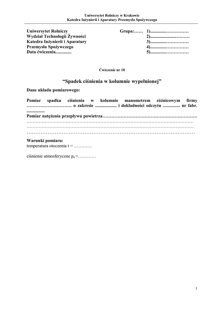 Uniwersytet Rolniczy w Krakowie Katedra Inżynierii i Aparatury Przemysłu Spożywczego Uniwersytet Rolniczy Wydział Technologii Żywności Katedra Inżynierii i Aparatury Przemysłu Spożywczego Data ćwiczenia.............. Grupa:…… 1)..............…………… 2).......................……… 3)..............…………… 4)..............…………… 5)..............…………… Ćwiczenie nr 10 “Spadek ciśnienia w kolumnie wypełnionej” Dane układu pomiarowego: Pomiar spadku ciśnienia w kolumnie manometrem różnicowym firmy ………………………… o zakresie ................... i dokładności odczytu ............... nr fabr. ................ Pomiar natężenia przepływu powietrza……………………………………………………… ………………………………………………………………………………………………… ………………………………………………………………………………………………… …………………………………………………………………………………… Warunki pomiaru: temperatura otoczenia t = ………… ciśnienie atmosferyczne pa =………… 1 Uniwersytet Rolniczy w Krakowie Katedra Inżynierii i Aparatury Przemysłu Spożywczego Charakterystyka złoża: KULKI ……………[mm] Pomiary Średnica 10 kulek [mm] 1 2 3 4 5 6 7 8 9 10 m10 masa 10 kulek [g] NCL ilość kulek w cylindrze (liczona) VC objętość cylindra [cm3] mC masa cylindra [g] mCK masa cylinder + kulki [g] mCKW masa cylinder + kulki + woda [g] tw temperatura wody [oC] Obliczenia Średnica kulki (średnia) [mm] Masa kulek w cylindrze [g] Masa wody w cylindrze [g] Objętość wody w cylindrze [m3] (odpowiada udziałowi objętości przestrzeni „pustych” w objętości warstwy ) 3 Objętość kulek w cylindrze [m ] (objętość cylindra - objętość wody) Masa jednej kulki (średnia) [g] Powierzchnia kulki [m2] Objętość kulki [m3] Gęstość szkła [kg/m3] (masa kulki/objętość kulki) Gęstość usypowa [kg/m3] Liczba kulek w cylindrze (wyznaczyć na podstawie znajomości masy kulek w cylindrze) Liczba kulek w 1m3 złoża Porowatość złoża ε0 Powierzchnia właściwa warstwy wypełnienia a [m2/m3] 2 Uniwersytet Rolniczy w Krakowie Katedra Inżynierii i Aparatury Przemysłu Spożywczego Spadek ciśnienia na wypełnieniu suchym Pomiary średnica kolumny D1=……… wysokość złoża L1= ……… średnica kulki d1 = ……… Lp V1 ……… Δp1 ……… średnica kolumny D2=……… wysokość złoża L2= ……… średnica kulki d2 = ……… V2 ……… Δp2 ……… średnica kolumny D3=……… wysokość złoża L3= ……… średnica kulki d3 = ……… V3 ……… Δp3 ……… 1 2 3 4 5 6 7 8 9 10 11 12 13 14 15 16 17 18 19 20 3 Uniwersytet Rolniczy w Krakowie Katedra Inżynierii i Aparatury Przemysłu Spożywczego Obliczenia D1= ………… L1=………… d1 = ………… V1 Δp1 Lp 3 [m /s] [Pa] 1 u1 [m/s] Re1 λ1 2 3 4 5 6 7 8 9 10 11 12 13 14 15 16 17 18 19 20 4 Uniwersytet Rolniczy w Krakowie Katedra Inżynierii i Aparatury Przemysłu Spożywczego Obliczenia D2= ………… L2=………… d2 = ………… V2 Δp2 Lp 3 [m /s] [Pa] 1 u2 [m/s] Re2 λ2 2 3 4 5 6 7 8 9 10 11 12 13 14 15 16 17 18 19 20 5 Uniwersytet Rolniczy w Krakowie Katedra Inżynierii i Aparatury Przemysłu Spożywczego Obliczenia D3= ………… L3=………… d3 = ………… V3 Δp3 Lp 3 [m /s] [Pa] 1 u3 [m/s] Re3 λ3 2 3 4 5 6 7 8 9 10 11 12 13 14 15 16 17 18 19 20 6