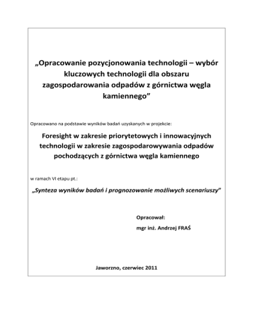 „Opracowanie pozycjonowania technologii – wybór kluczowych technologii dla obszaru zagospodarowania odpadów z górnictwa węgla kamiennego” Opracowano na podstawie wyników badań uzyskanych w projekcie: Foresight w zakresie priorytetowych i innowacyjnych technologii w zakresie zagospodarowywania odpadów pochodzących z górnictwa węgla kamiennego w ramach VI etapu pt.: „Synteza wyników badań i prognozowanie możliwych scenariuszy” Opracował: mgr inż. Andrzej FRAŚ Jaworzno, czerwiec 2011 I. Wprowadzenie Istotnym problemem gospodarki odpadami w Polsce, wymagającym jak najszybszego rozwiązania jest zagospodarowanie odpadów pochodzących z przemysłu wydobywczego. W Polsce odpady pochodzące z przemysłu wydobywczego, głównie z górnictwa węgla kamiennego stanowią ok. 60% wytwarzanych rocznie odpadów przemysłowych. Według danych GUS w 2009 r. sektor górnictwa węgla kamiennego wytworzył ok. 24,1 mln Mg odpadów. Dodatkowo w środowisku zdeponowanych zostało już ponad 570 mln Mg odpadów wydobywczych wytworzonych przez ten sektor gospodarki. Instytut Mechanizacji Budownictwa i Górnictwa Skalnego w Warszawie wspólnie z Katedrą Przeróbki Kopalin i Utylizacji Odpadów Politechniki Śląskiej w Gliwicach oraz Katedrą Górnictwa Odkrywkowego Akademii Górniczo-Hutniczej w Krakowie rozpoczął w 2009 r. realizację projektu pn: „Foresight w zakresie priorytetowych i innowacyjnych technologii zagospodarowania odpadów pochodzących z górnictwa węgla kamiennego” (Foresight OGWK). Głównym celem projektu jest identyfikacja wiodących technologii zagospodarowania odpadów z górnictwa węgla kamiennego o znaczeniu strategicznym, których rozwój w następnych 20 latach będzie priorytetowy dla Polski oraz opracowanie scenariuszy ich rozwoju poprzez zastosowanie usystematyzowanej metodyki badawczej. Realizacja projektu, oprócz wyboru najlepszych technologii oraz wskazania scenariuszy ich rozwoju, przyczyni się również do osiągnięcia innych wymiernych celów, w tym m.in.: wzmocnienia potencjału sektora B+R, wzmocnienia innowacyjności i konkurencyjności przedsiębiorstw działających w branży odpadów wydobywczych oraz zacieśnienia współpracy pomiędzy sektorem nauki a sektorem przedsiębiorstw. W świetle aktualnie obowiązujących przepisów wymagane jest spojrzenie na problem zagospodarowywania odpadów wydobywczych z nowej perspektywy. Technologie stosowane obecnie w Polsce umożliwiają ograniczony sposób wykorzystania tego rodzaju odpadów. Uwzględniając fakt, że innowacyjne rozwiązania technologiczne opracowane przez naukowców spotykają się z dobrym przyjęciem w środowisku górniczym, należy podjąć działania służące budowie nowej strategii gospodarki odpadami pochodzącymi z górnictwa węgla kamiennego. W celu pozycjonowania kierunków i technologii gospodarczego wykorzystania odpadów pochodzących z górnictwa węgla kamiennego wchodzących w skład VI etapu projektu Foresight OGWK pn.: „Synteza wyników badań i pozycjonowanie możliwych scenariuszy” dokonano analizy szeregu prac eksperckich, w tym m.in.: Badanie i diagnoza stanu obecnego rozwoju technologii w zakresie zagospodarowywania odpadów w górnictwie zawierające: wstępną oceną innowacyjności zinwentaryzowanych technologii zagospodarowania odpadów z górnictwa węgla kamiennego z wykorzystaniem kryteriów tj. skuteczność, uniwersalność, negatywny wpływ na środowisko oraz bezpieczeństwo i higieny pracy, analizę SWOT w ujęciu technologicznym, analizę SWOT w ujęciu instytucjonalnym; 2 Badanie kluczowych kierunków rozwoju w obszarze zagospodarowania odpadów z górnictwa węgla kamiennego zawierające: oceną innowacyjności zinwentaryzowanych technologii zagospodarowania odpadów z górnictwa węgla kamiennego – metoda Delphi, oceną wpływu wybranych czynników na rozwój innowacyjnych technologii zagospodarowania odpadów pochodzących z górnictwa węgla kamiennego – metoda krzyżowej analizy wpływów, oceną innowacyjności zinwentaryzowanych technologii zagospodarowania odpadów z górnictwa węgla kamiennego – metoda AHP; Wstępna weryfikacja wyników badań poprzez konsultacje społeczne. Wyniki tych badań pozwoliły m .in. na: wytypowanie kluczowych kierunków gospodarczego wykorzystania odpadów z górnictwa węgla kamiennego, wytypowanie dla każdego kierunku gospodarczego wykorzystania odpadów z górnictwa węgla kamiennego innowacyjnych technologii w oparciu o przyjęte kryteria, określenie słabych i mocnych stron oraz szans i zagrożeń dla każdego kierunku gospodarczego wykorzystania odpadów z górnictwa węgla kamiennego, określenie słabych i mocnych stron oraz szans i zagrożeń w ujęciu instytucjonalnym, określenie podstawowych celów strategicznych i cząstkowych, ocenę zagadnień technologicznych wykorzystania odpadów z podziałem na kierunki, określenie hierarchii ważności kryteriów mających wpływ na innowacyjność technologii zagospodarowania odpadów z górnictwa węgla kamiennego, określenie stopnia więzi pomiędzy wytypowanymi innowacyjnymi technologiami a kryteriami w poszczególnych kierunkach zastosowań, określenie hierarchii ważności kierunków prac naukowo - badawczych umożliwiających postęp w zakresie rozwoju technologii zagospodarowania odpadów z górnictwa węgla kamiennego, określenie hierarchii ważności obszarów instytucjonalnych nie związanych z wytwarzaniem i przetwórstwem odpadów z górnictwa kamiennego. II. Priorytetowe kierunki gospodarczego wykorzystania odpadów z górnictwa węgla kamiennego w okresie następnych dwudziestu lat Autorzy niniejszego sprawozdania przyjęli następującą hierarchię kierunków gospodarczego wykorzystania odpadów z górnictwa węgla kamiennego: GRUPA V - Odzysk substancji węglowej GRUPA IV - Kruszywa, ceramika GRUPA I - Budownictwo hydrotechniczne, ziemne, rekultywacja terenów GRUPA II - Roboty likwidacyjne w kopalniach węgl